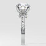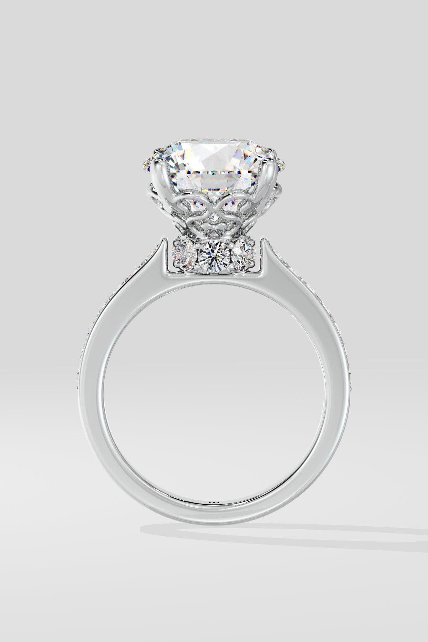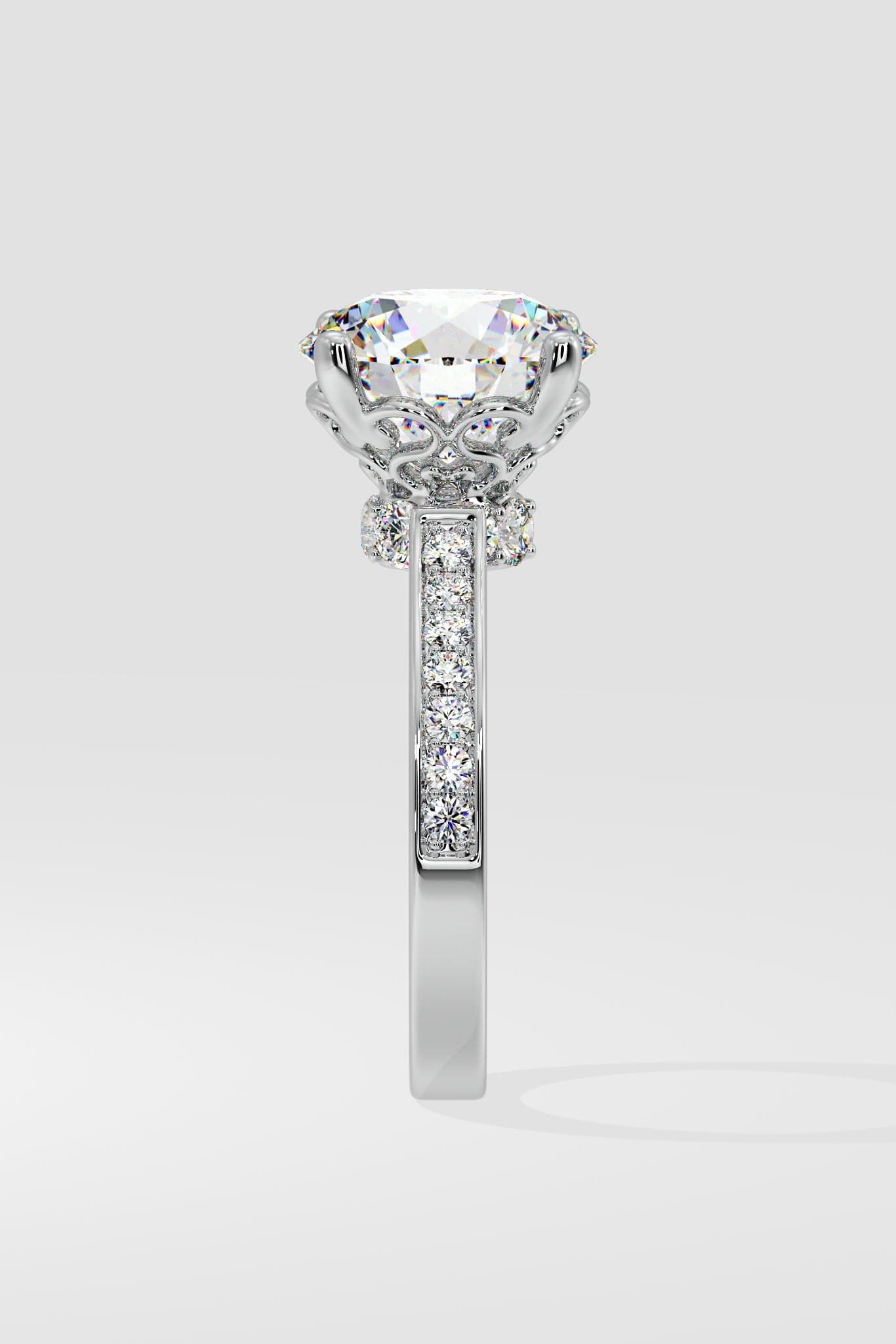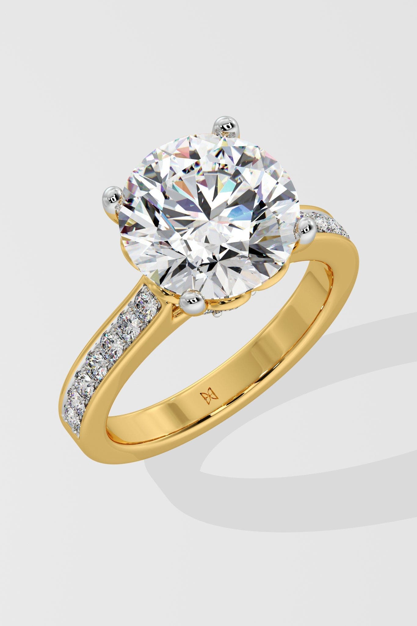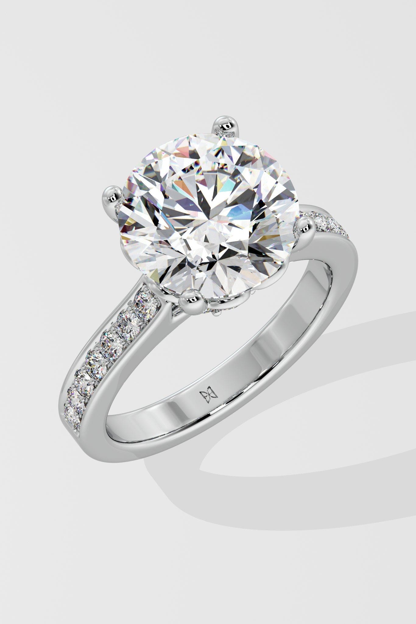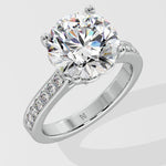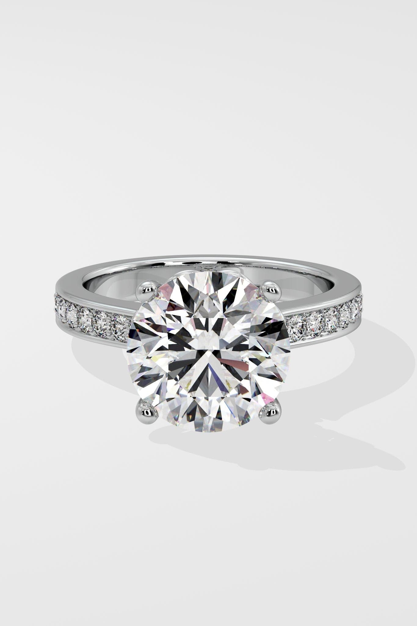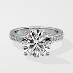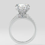 The 4 ct Solitaire Pave Lab Grown Diamond Ring showcases an eye-popping 4-carat round diamond, set in a sturdy pave band. The side view reveals intricate detailing, with additional diamonds enhancing the ring's elegance and sophistication.