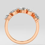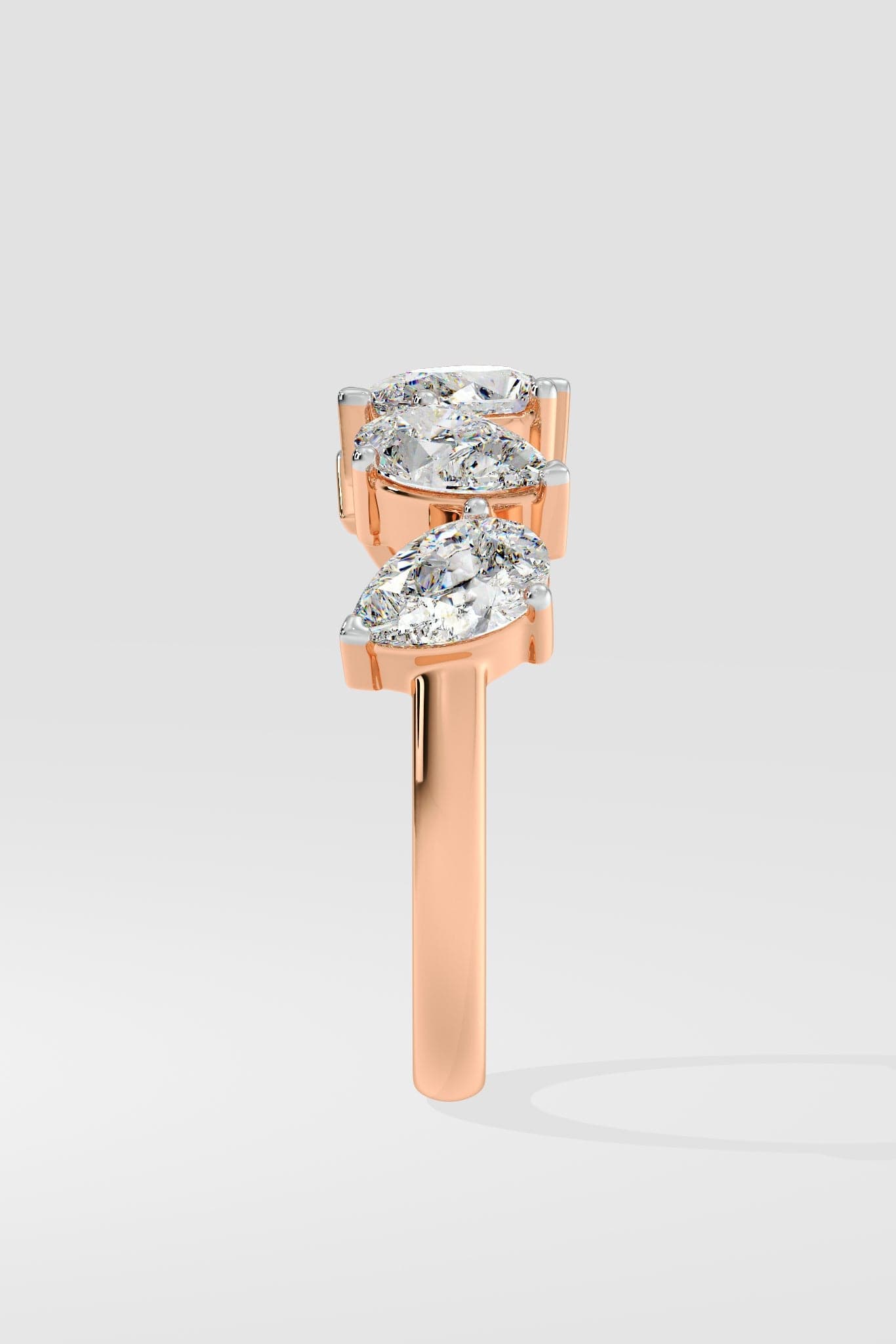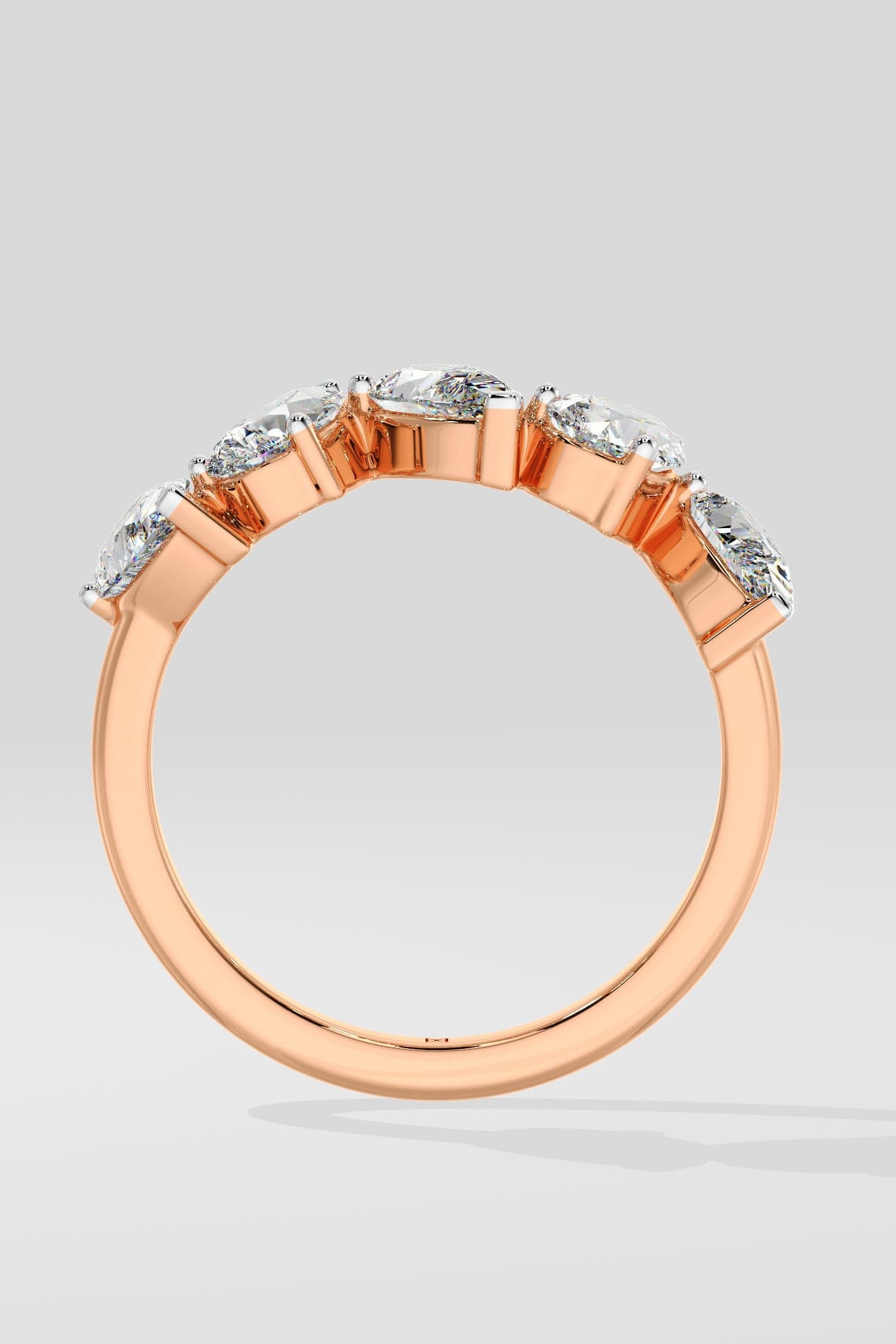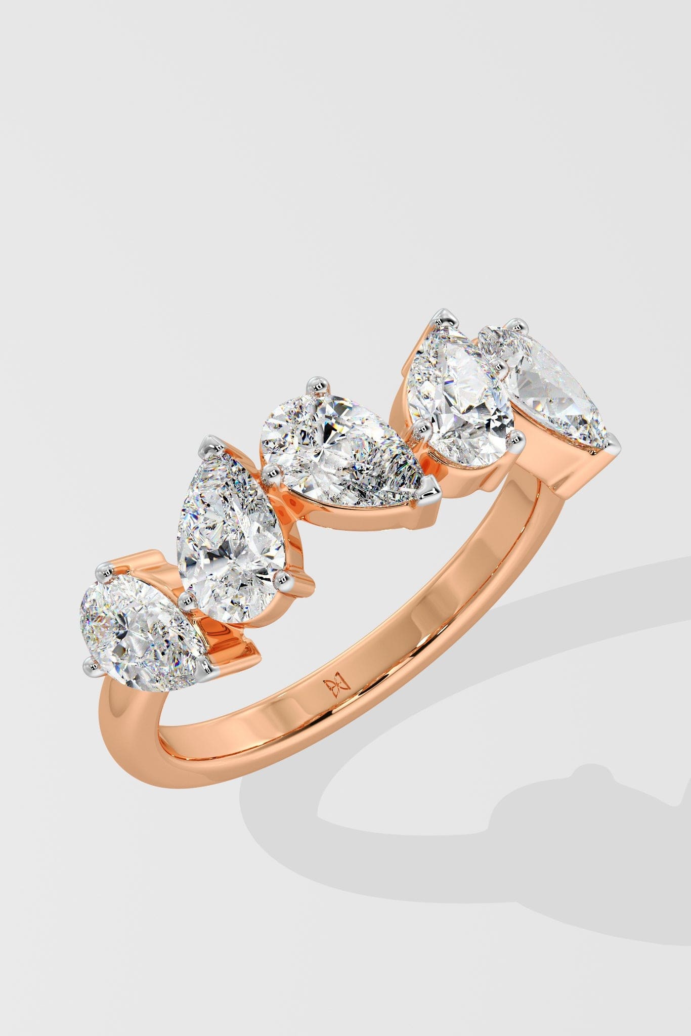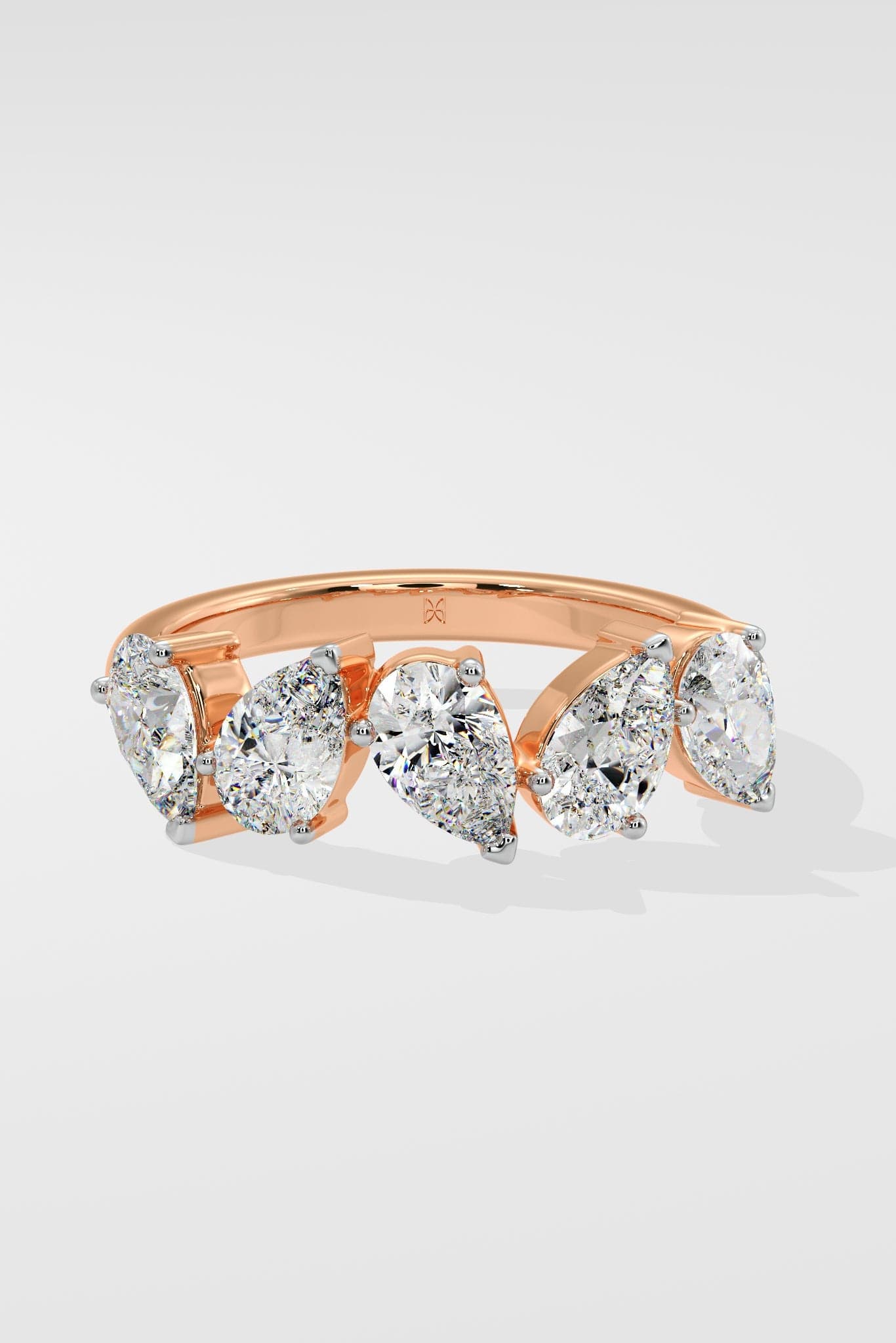 This ring features an array of five exquisite .30-carat pear-shaped diamonds, beautifully set in a radiant rose gold band. Classic with a twist.