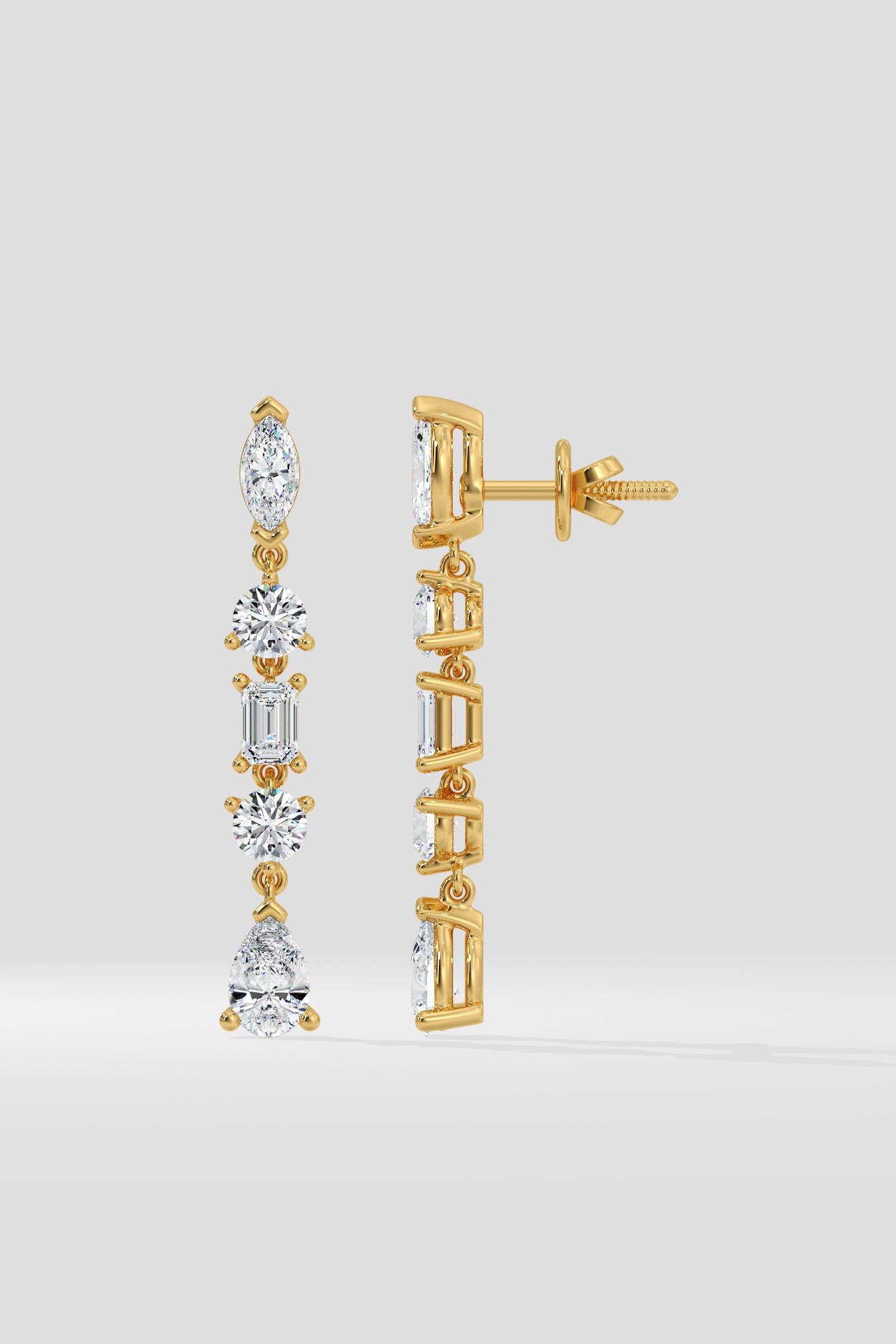 The Dazzle Drops are 5 stone danglers in 1/5 ct per diamond. A 5 stone combination of Emerald, Marquise, Pear and Rounds make this stunner absolutely irrestitible.The Illuminate collection is built around the fact that with your personality, you'll always be in the spotlight