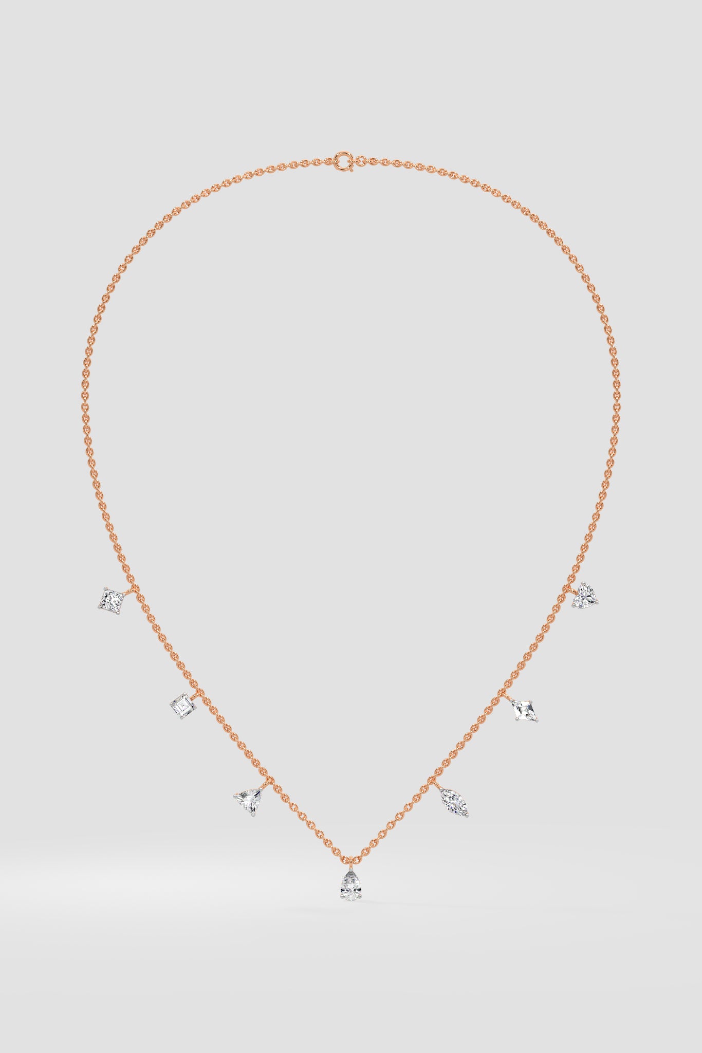 This Trinklet features seven unique diamonds - pear, trilliant, princess, marquise, heart, cushion and kite cuts - 0.50 carat each piece. Each diamond is thoughtfully placed to create a harmonious balance of shapes, making this necklace a distinctive statement.