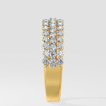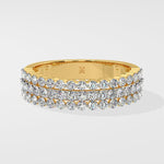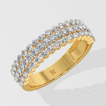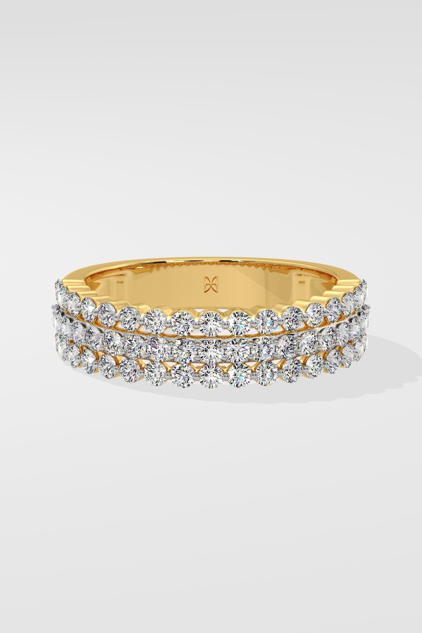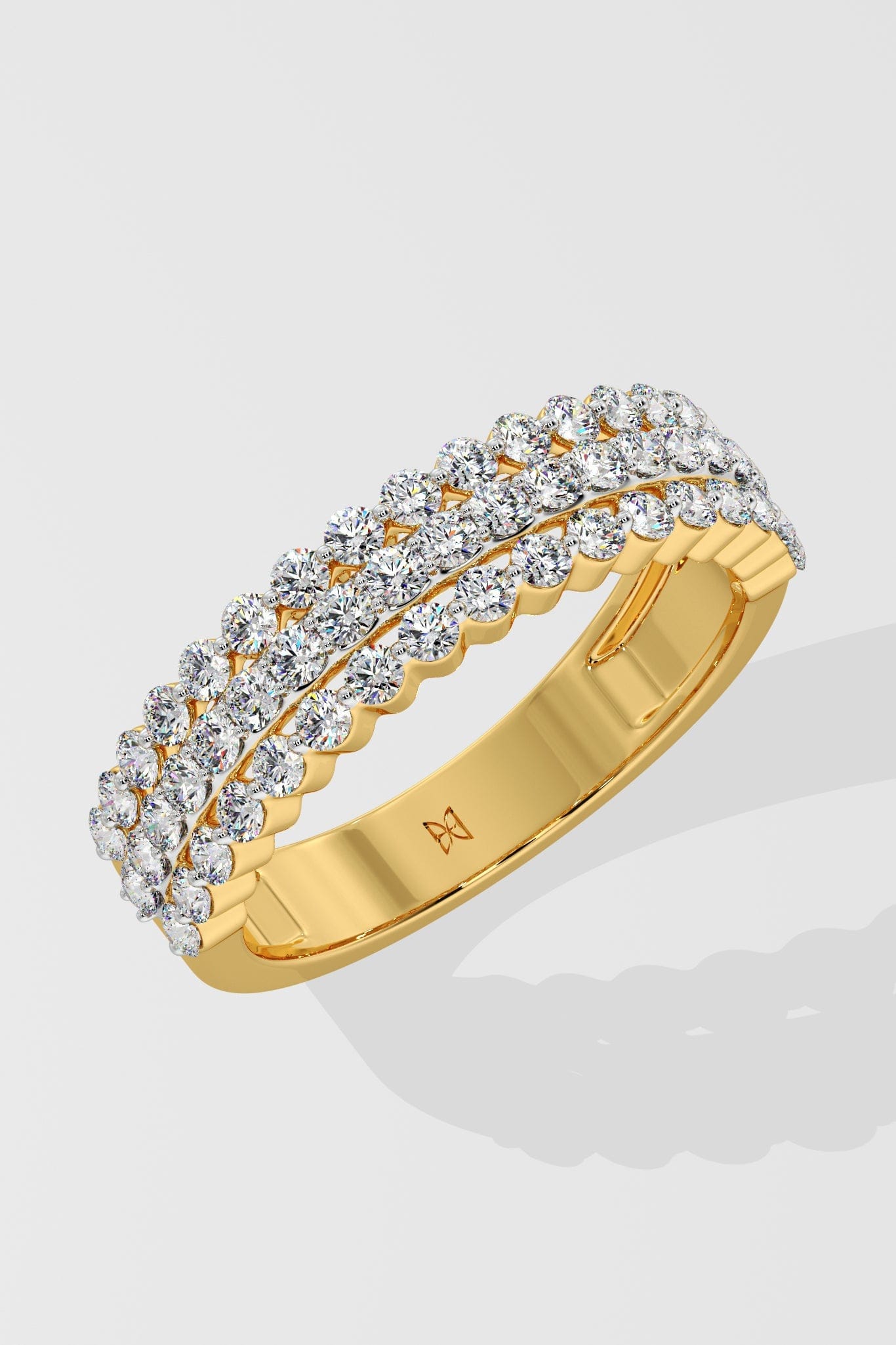 The Triad Diamond Band, is an all time classic band featuring three rows of small diamonds. This band's refined design makes it perfect for everyday wear. Its subtle sparkle and sophisticated style make it a versatile addition to any jewellery collection.