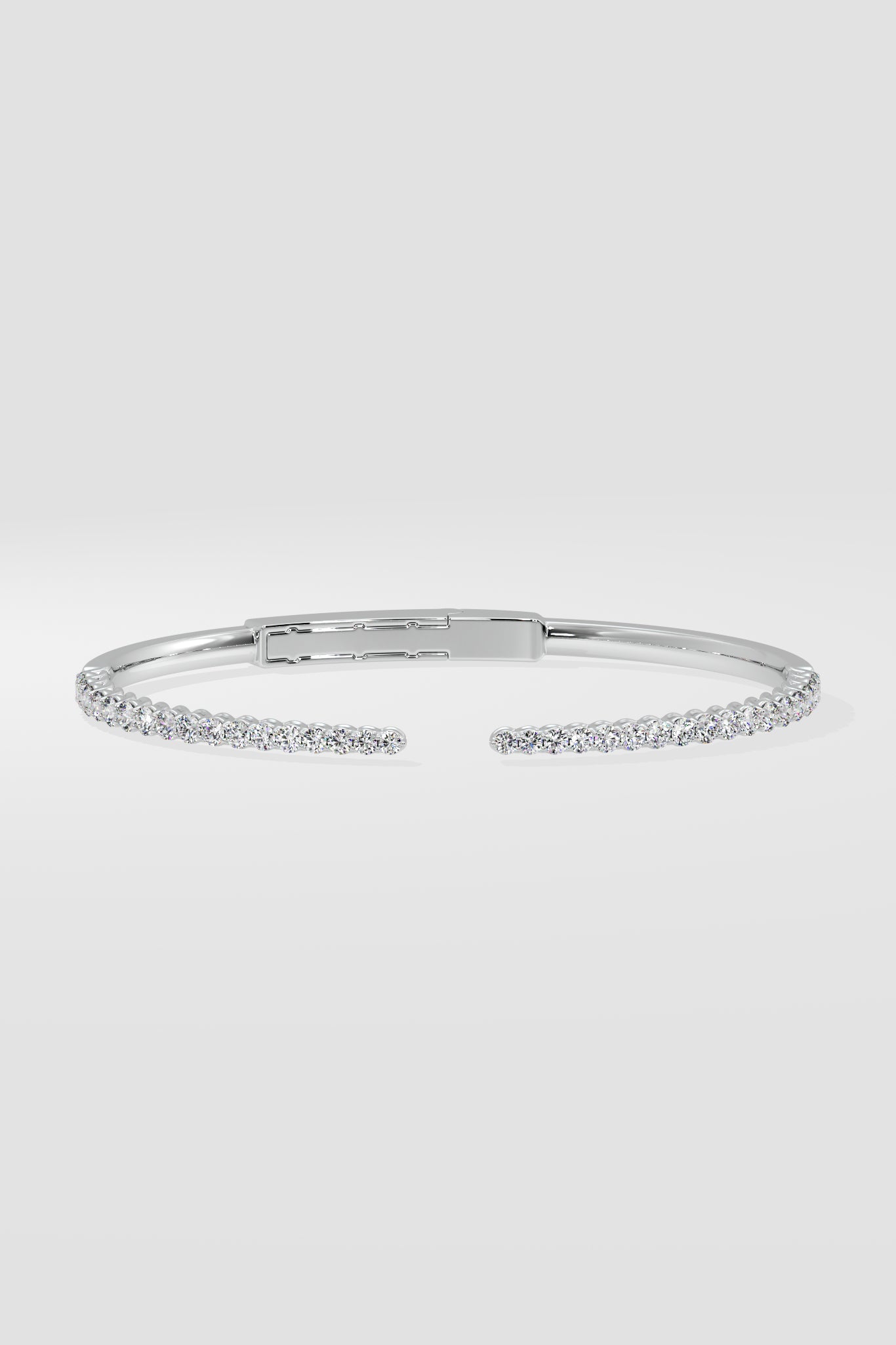 An oval bangle set with round diamonds, narrowing at the ends into a clean open gap. Reverse taper. Opens split from the bottom. Perfect addition to your wrist stack.
