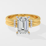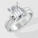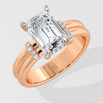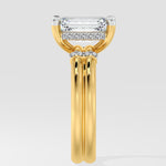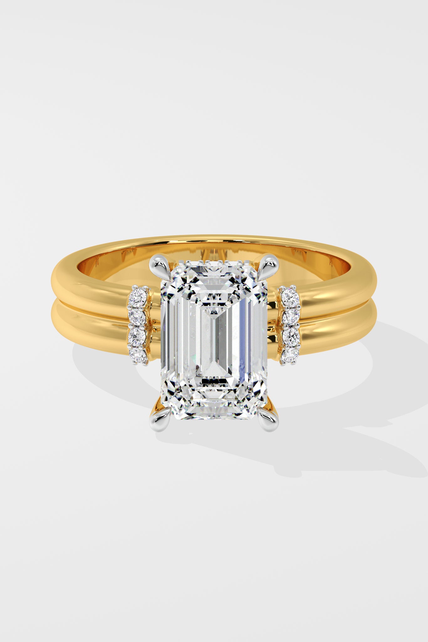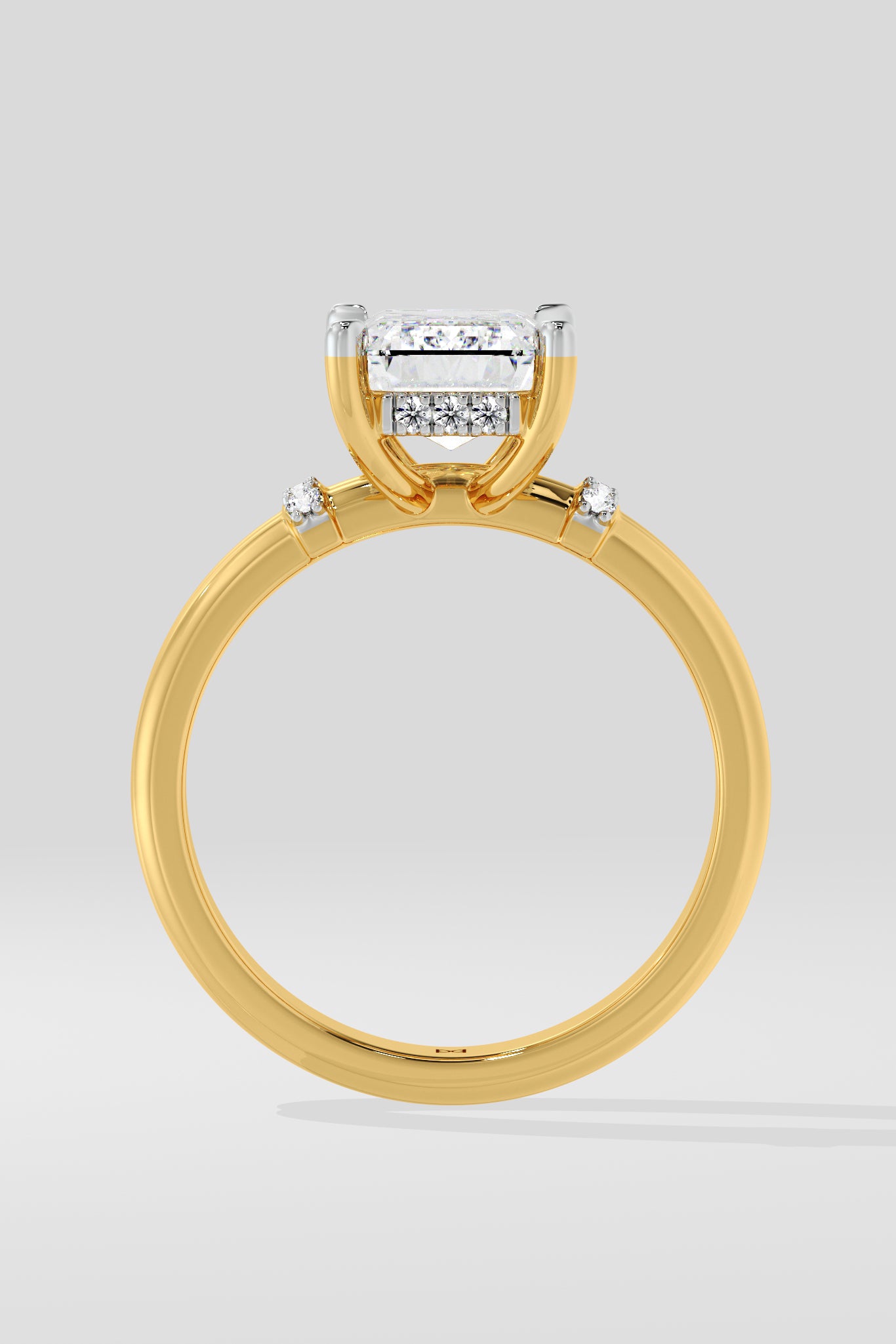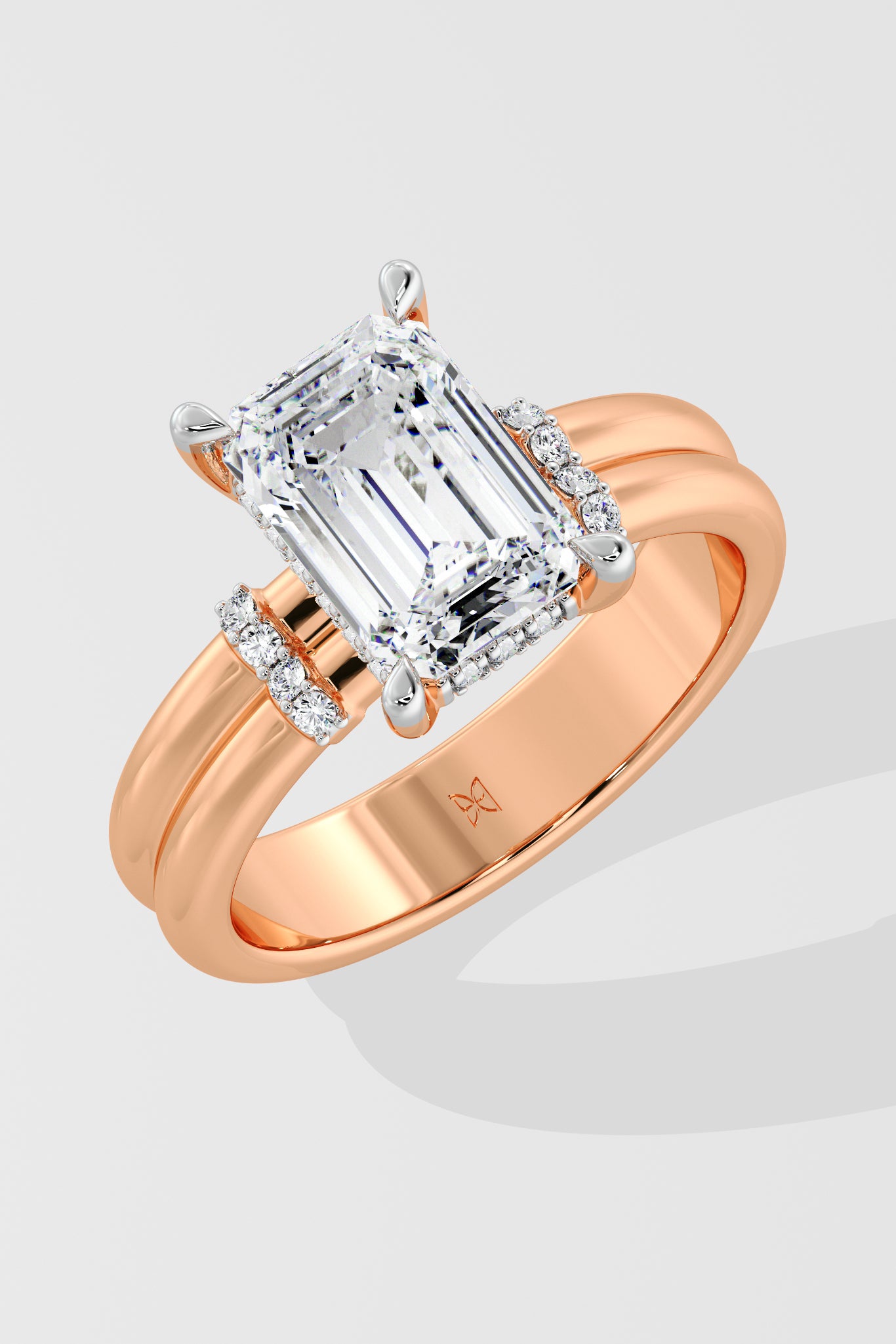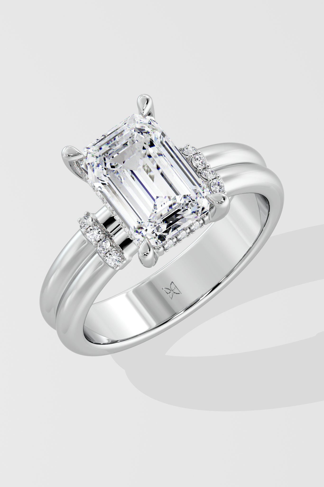 A 2 Ct Emerald-cut center shines with a hidden halo beneath, paired with a sleek diamond-studded band. Classic with a hint of surprise sparkle.
