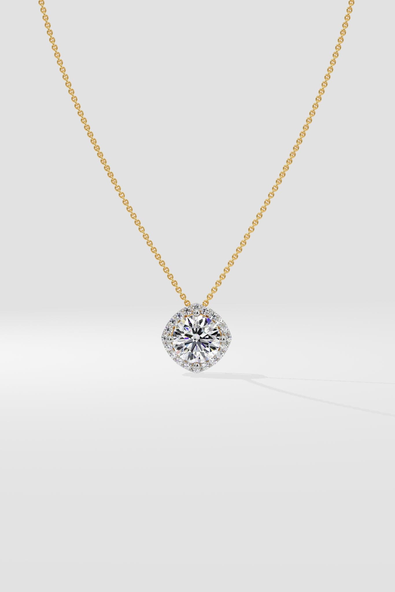 A stunning 1.50 ct pendant featuring a brilliant Round Diamond, surrounded by a cushion-shaped halo. Paired with a sleek chain.