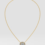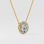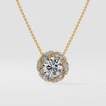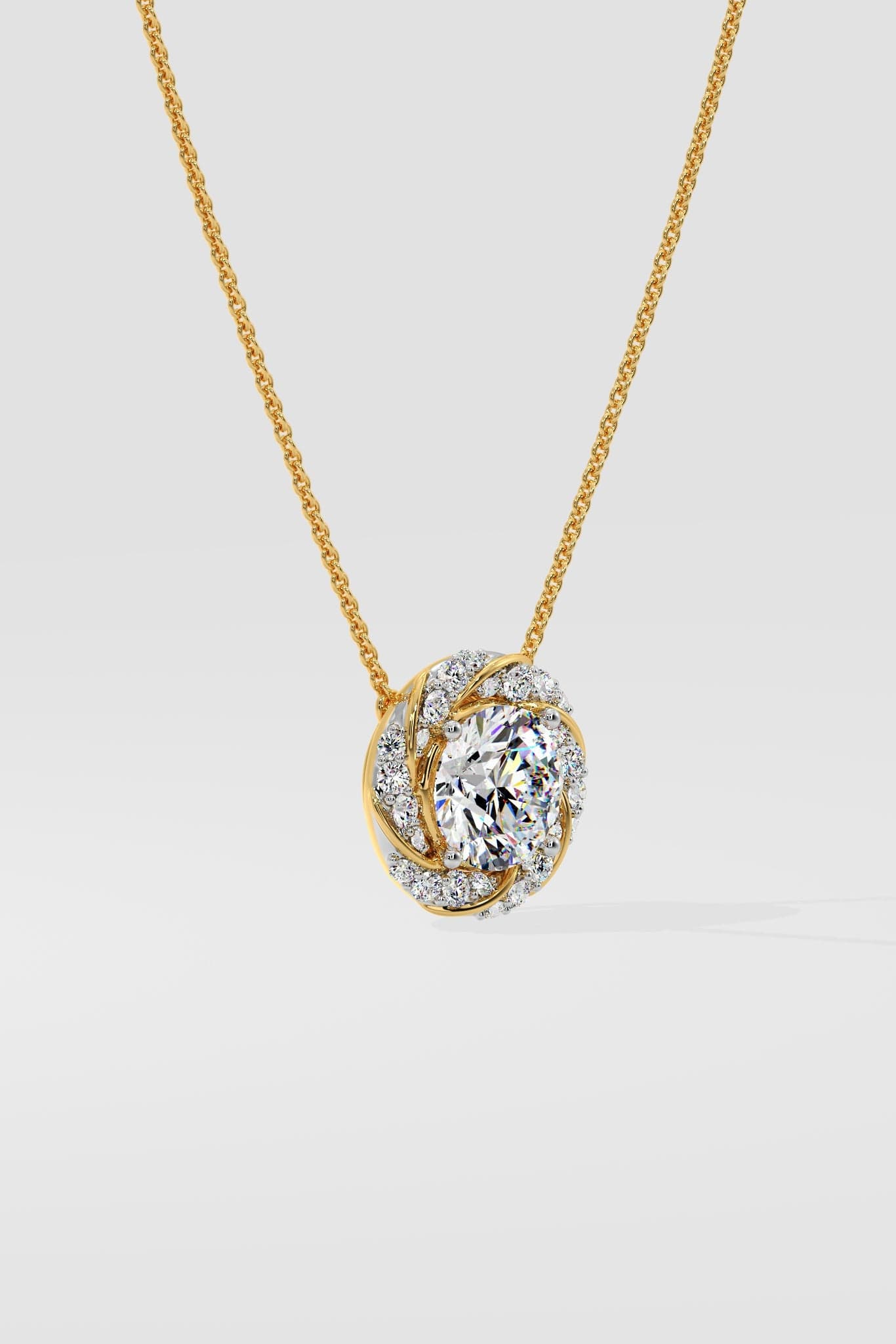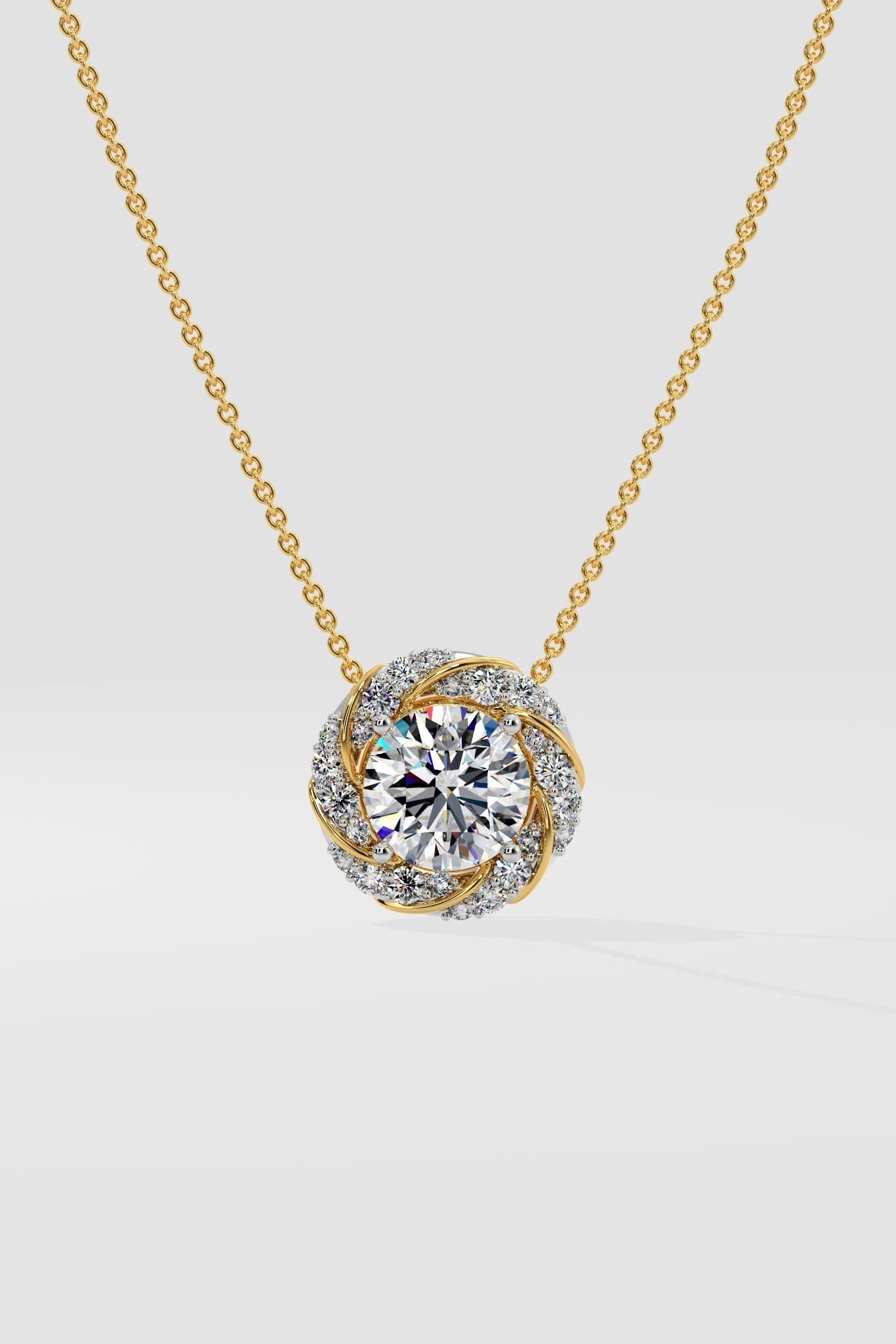 This stunning 1 ct swirl necklace features a captivating solitaire diamond, encased in an elegant swirl of gold and diamond accents. The intricate design seamlessly flows into a delicate gold chain, creating a radiant piece that exudes timeless elegance and sophistication.