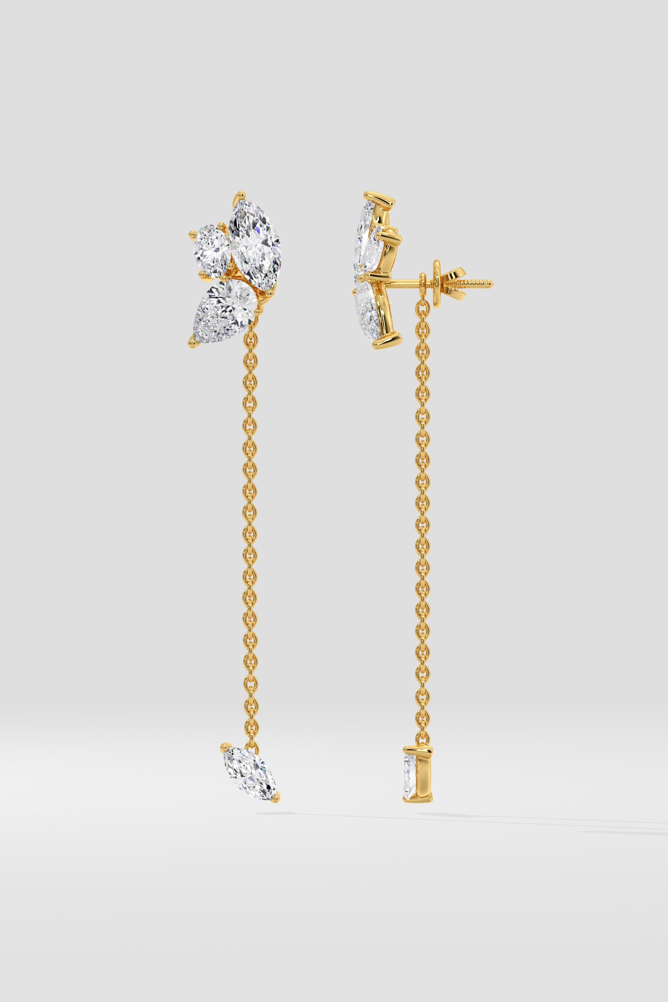 The Eden Drop Danglers combine mini solitaires effortlessly; they feature a combination of Ovals, Marquise & Pears in sizes from 1/5 ct to 1/2 ct diamonds. The bottom dangle is detachable which allows you to wear this beauty as studs as well.