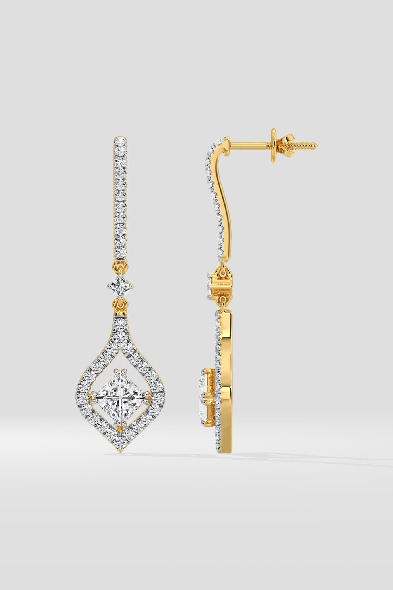 The Quad Halo Danglers feature a 0.50 Ct centre Diamond in each earring, surrounded by a sculpted halo that enhances its brilliance. The defined geometric drop creates a clean, balanced silhouette with added depth and sparkle. Designed for fluid movement, they reflect light beautifully from every angle.