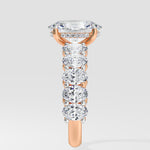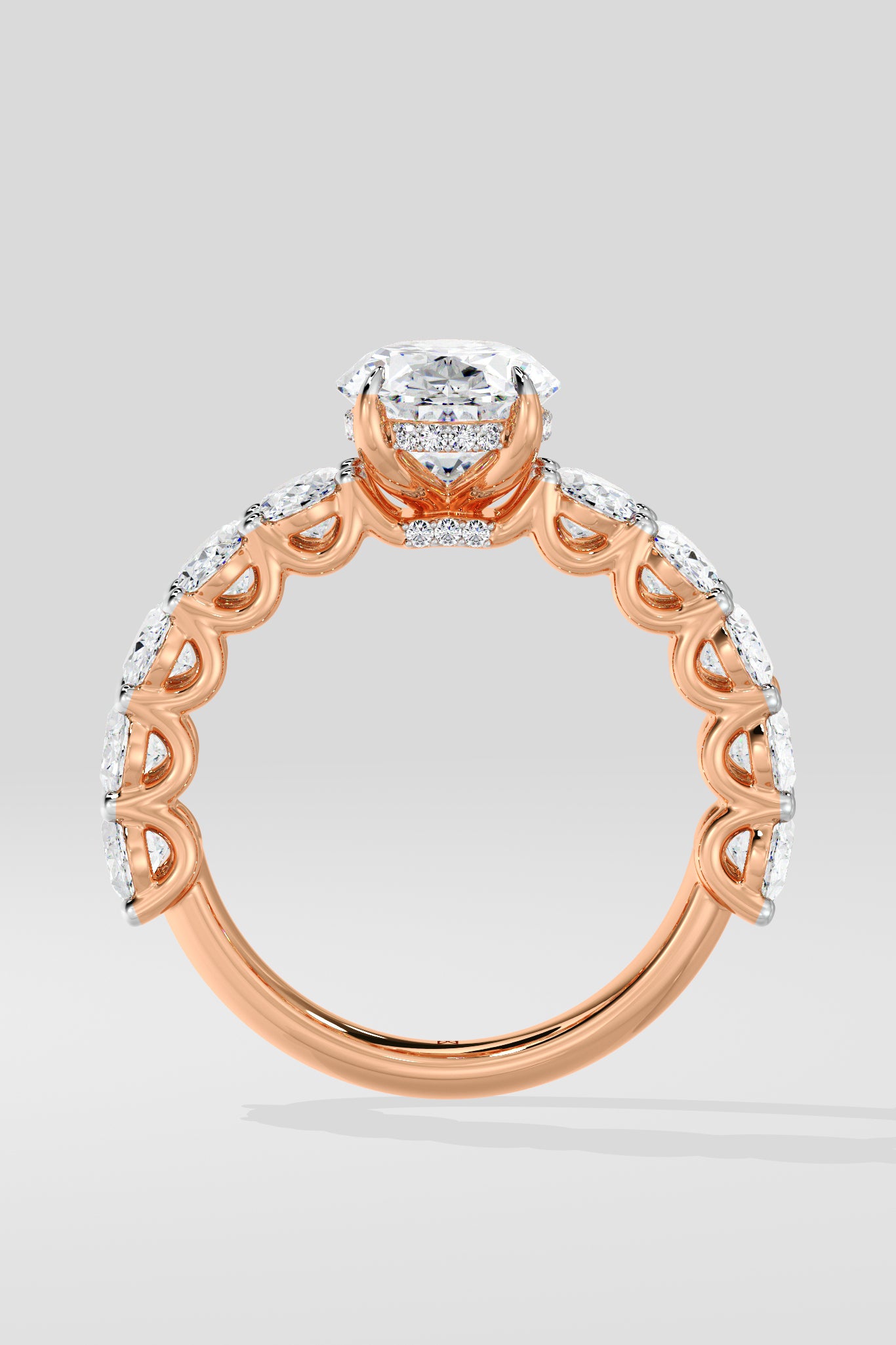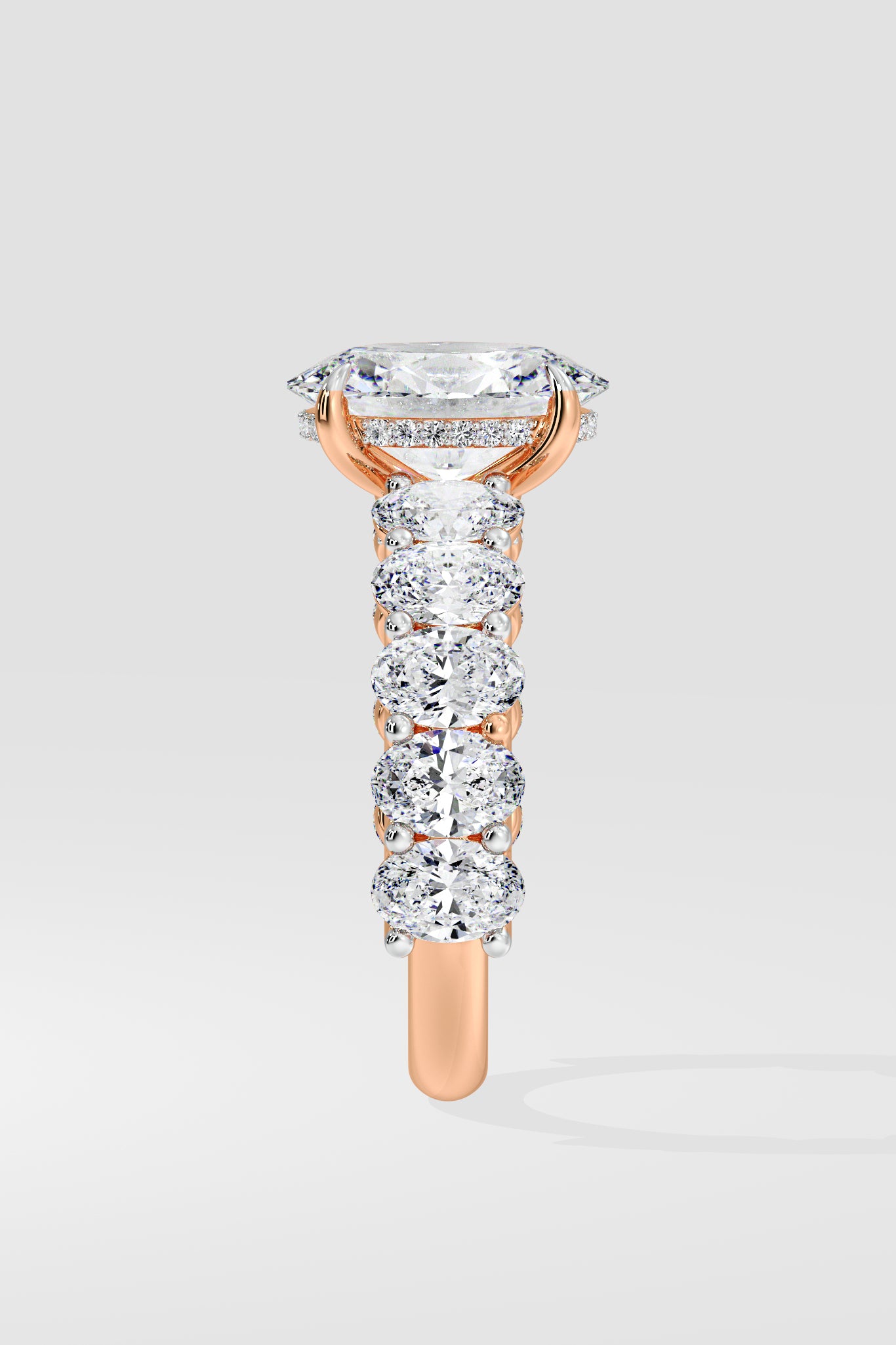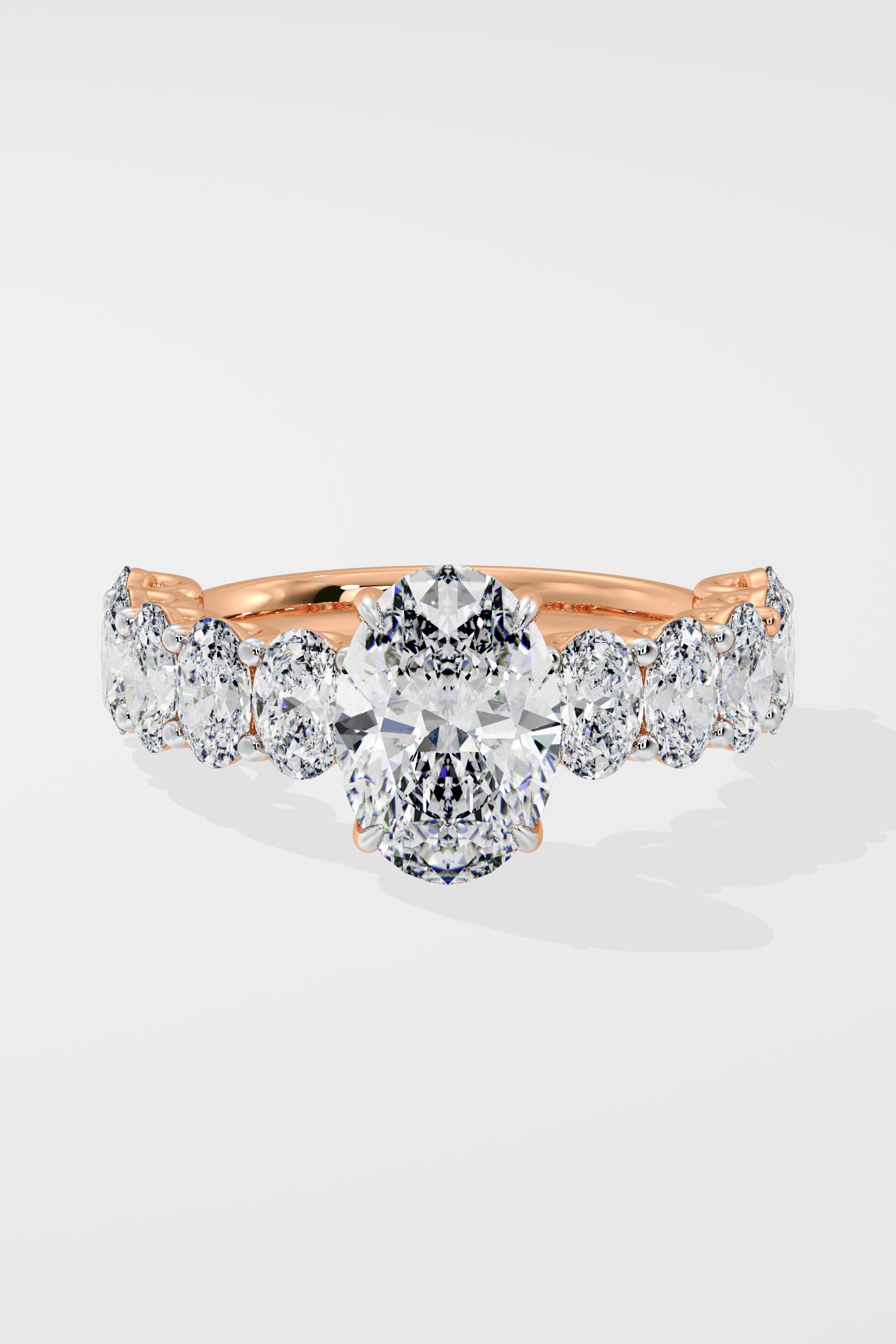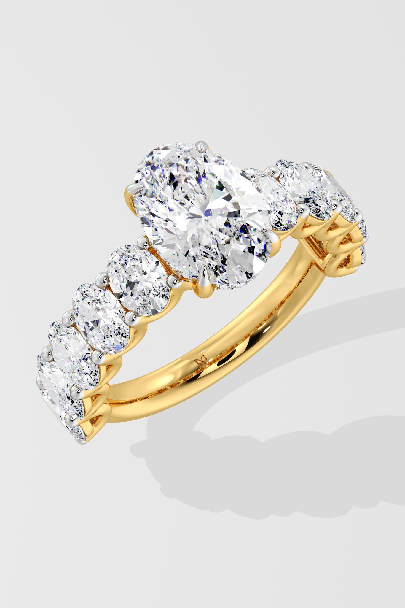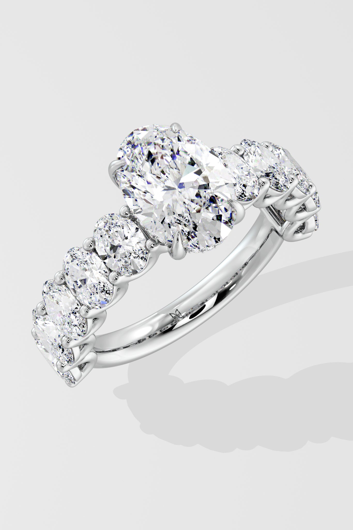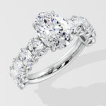 The Oval Eternal Ring features a 2 ct center combined with 0.20 Ct oval diamonds on the band. The hidden halo adds to the details of this bold and beautiful piece.