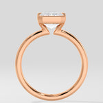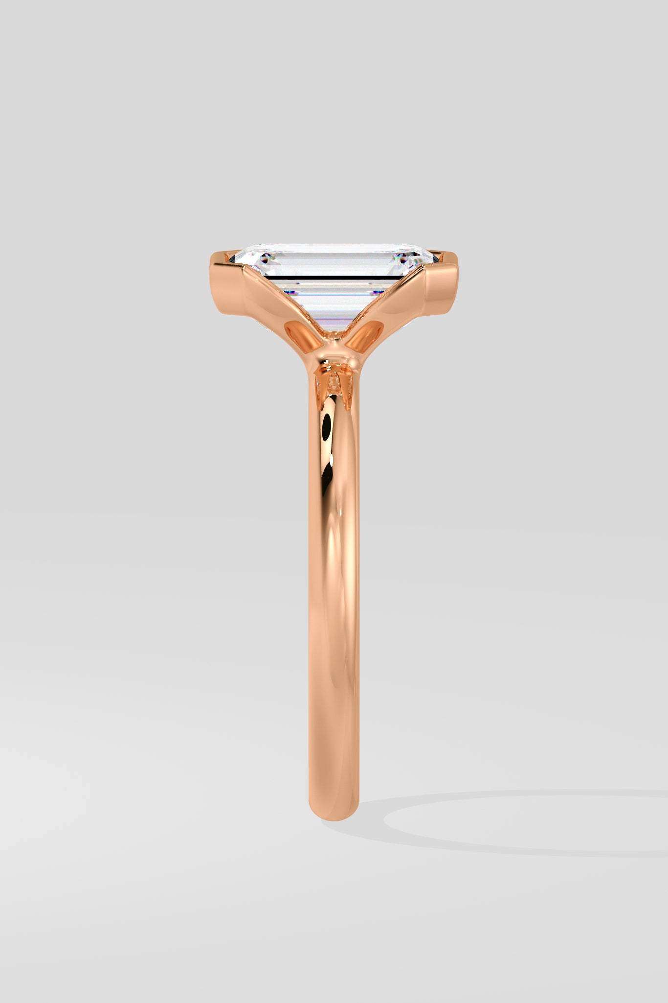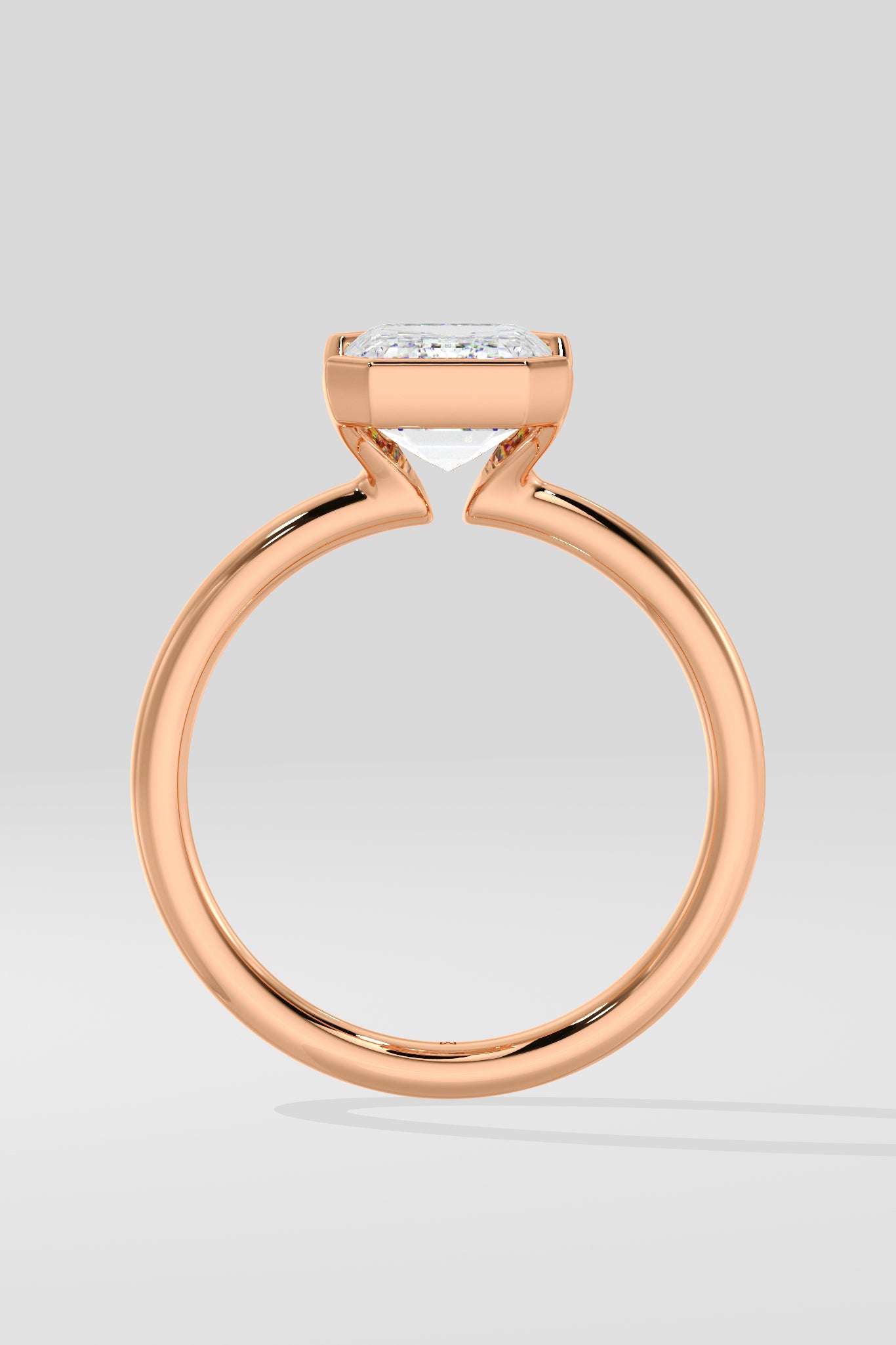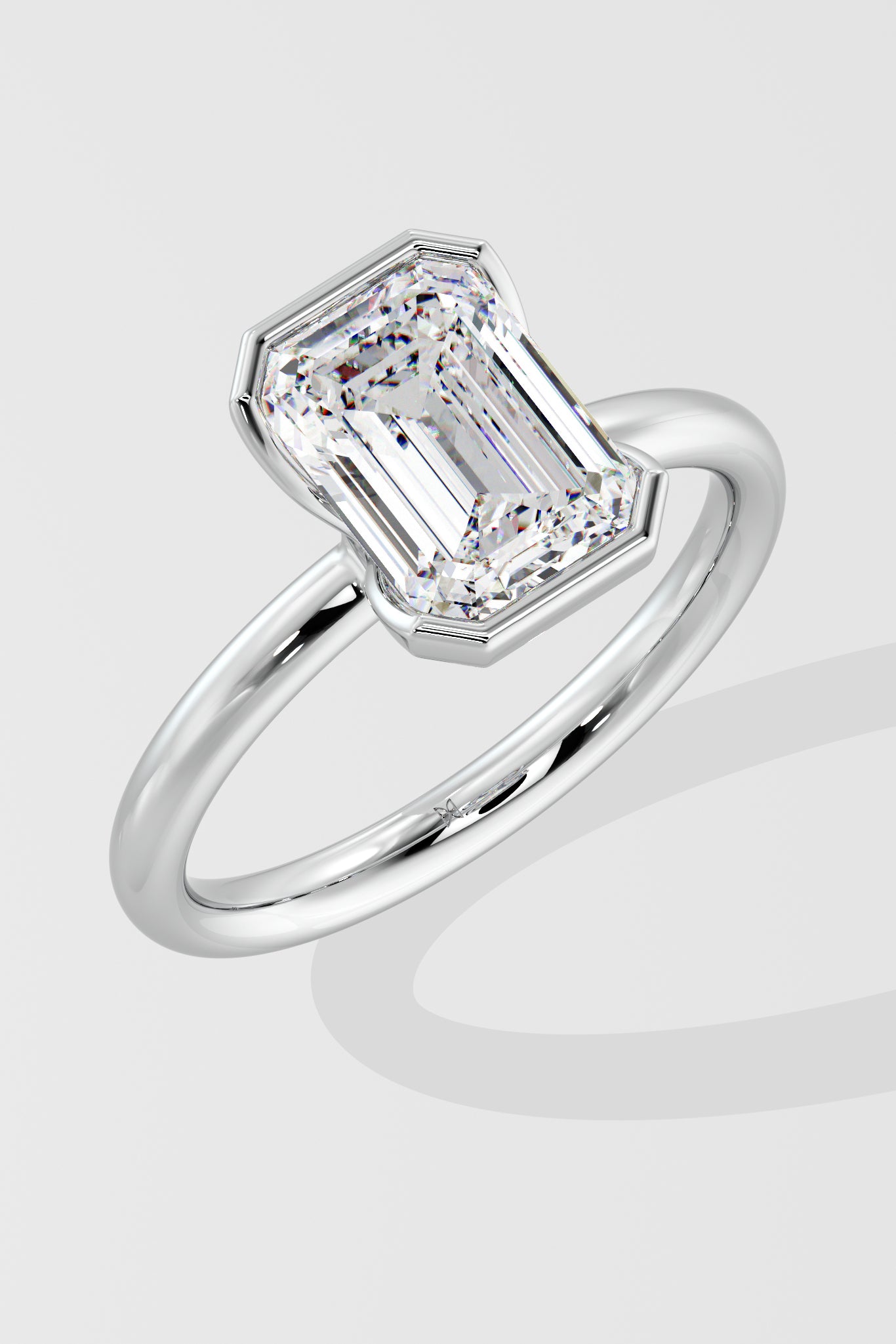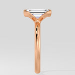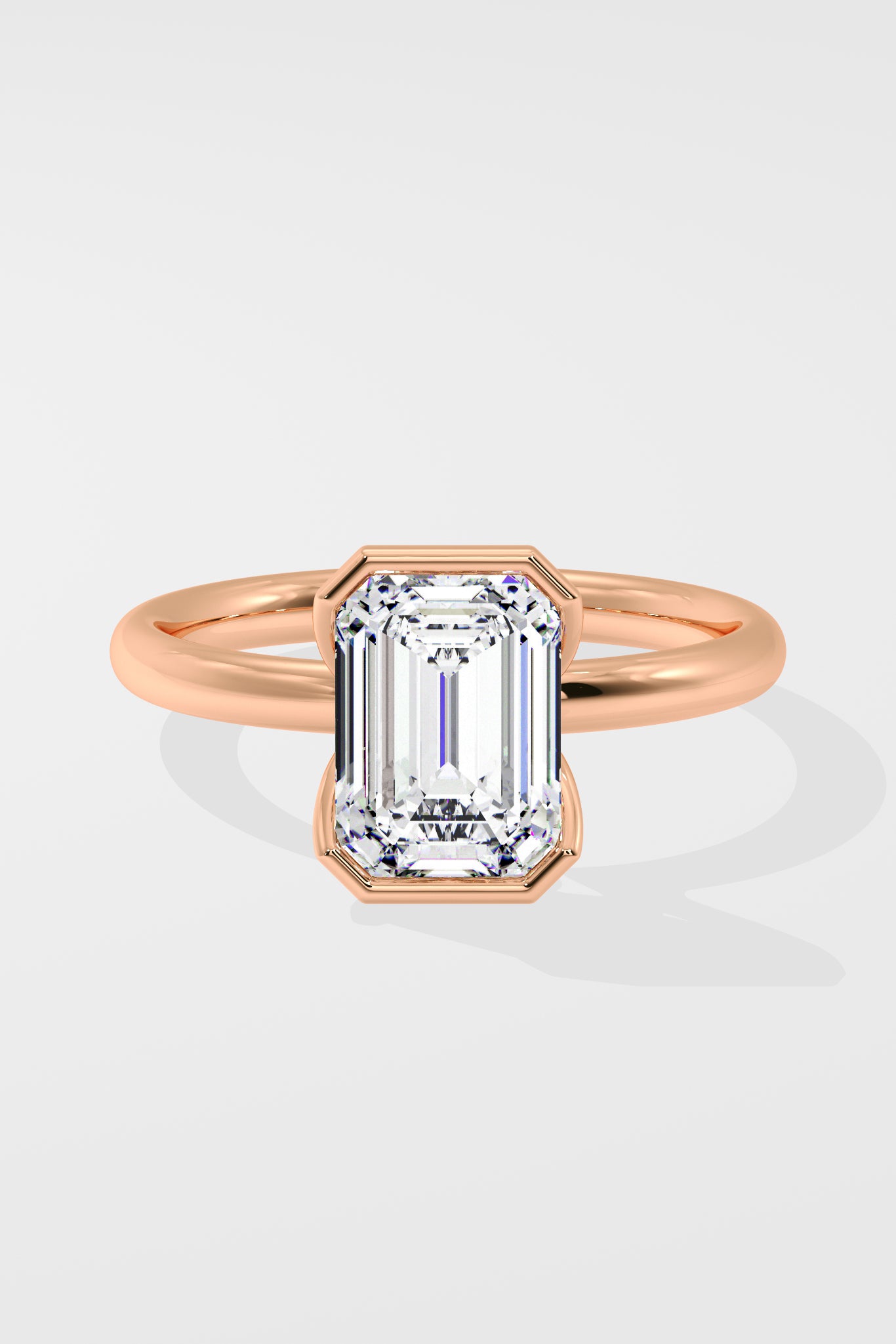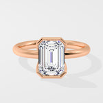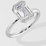 A 2.5 Ct Emerald-cut diamond set in a sleek half Bezel setting. The band partially wraps the center stone, offering both security and a contemporary edge while letting the diamond's clean lines take center stage.