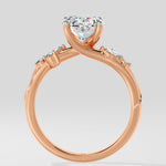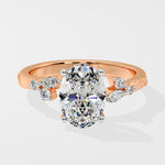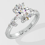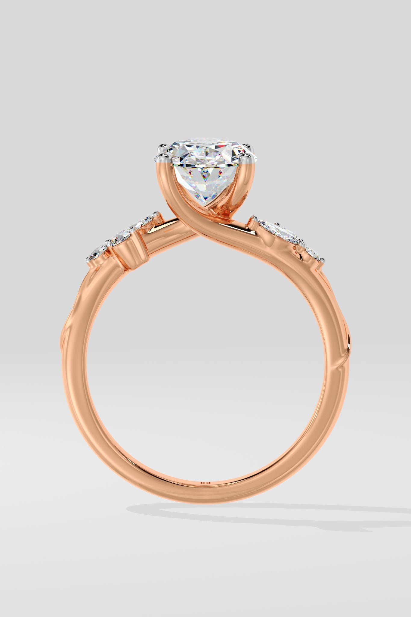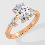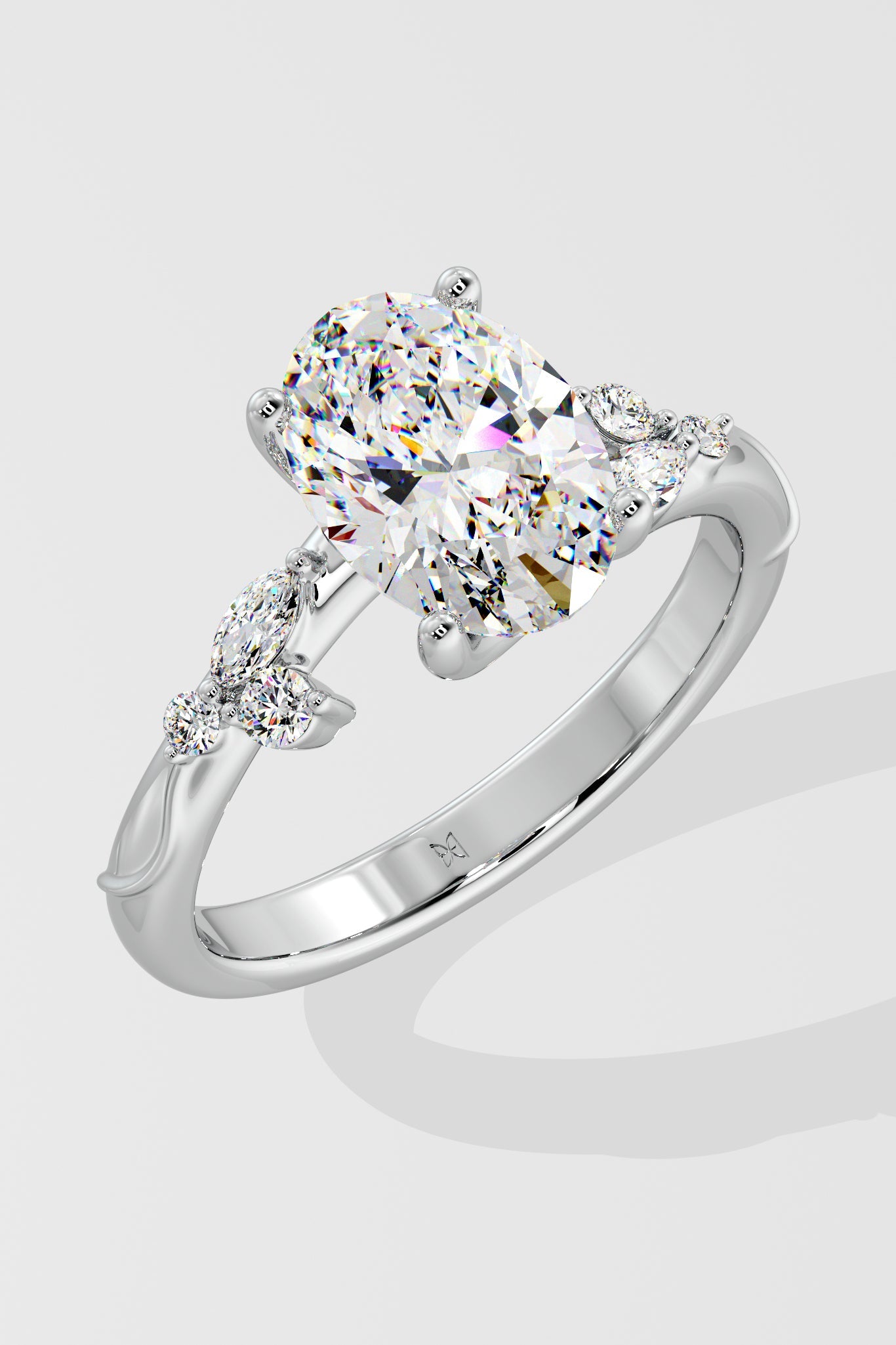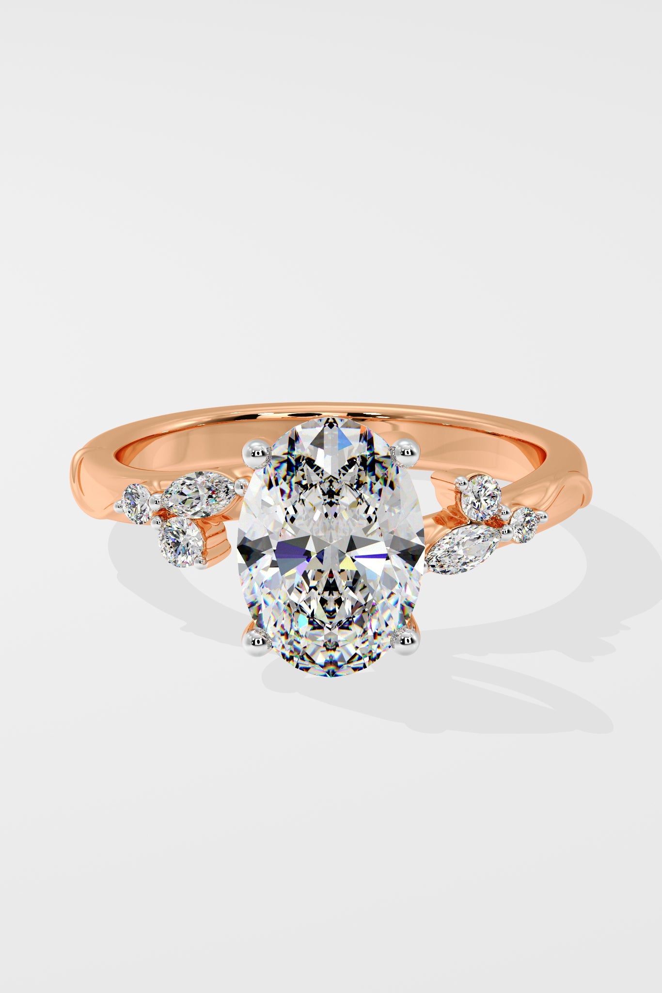 The 2 Ct Lunette Ring has a stunning 2 Ct Oval Diamond at its center, complemented by a delicate arc of side diamonds forming a veil design. Inspired by nature this minimal yet timeless beauty.