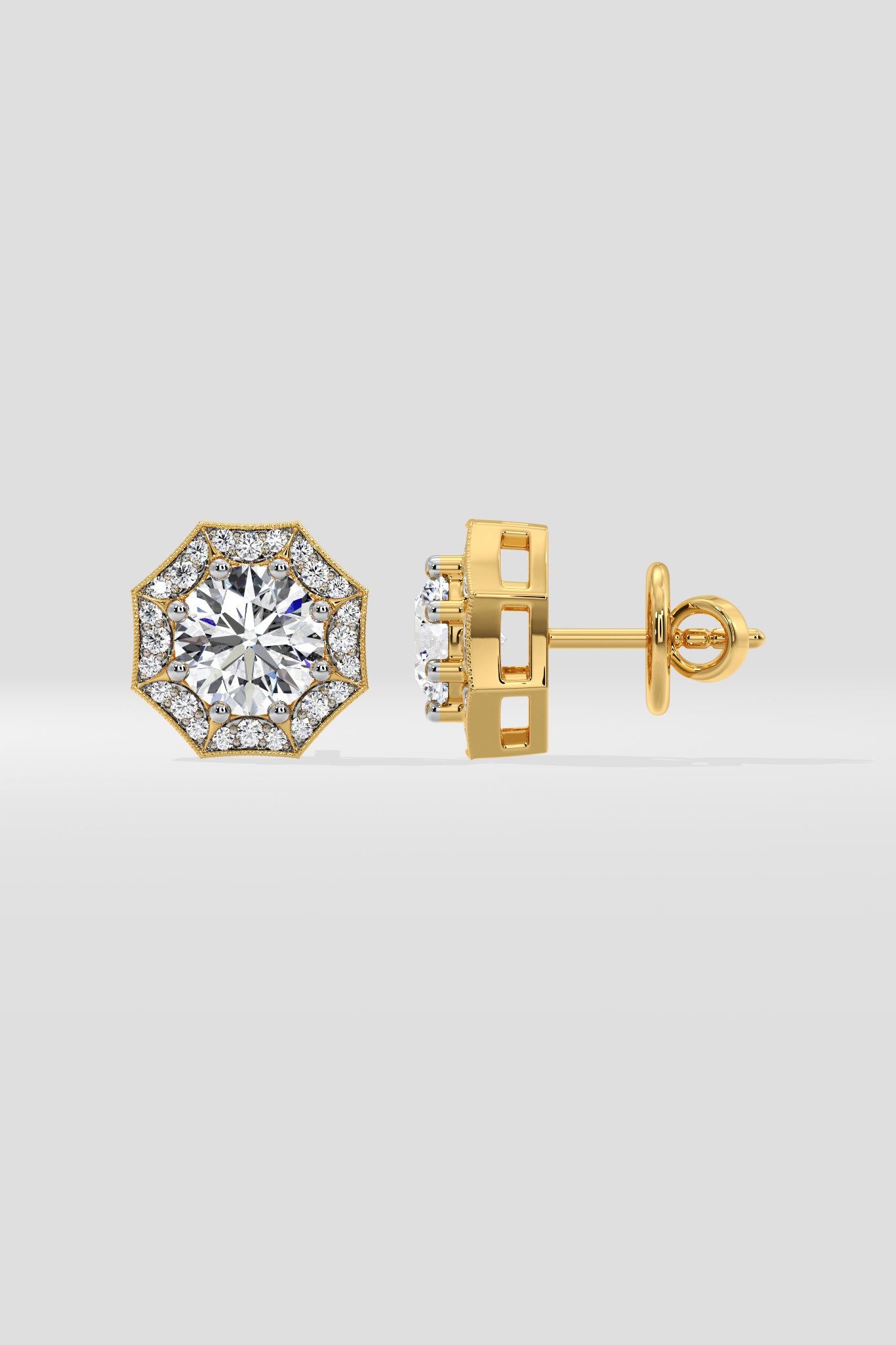 The Octa Halo Earrings feature 0.70 ct solitaire center diamonds embraced by a chic octagonal halo. Effortlessly everyday work or casual wear with the just the right size of diamonds.
