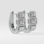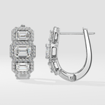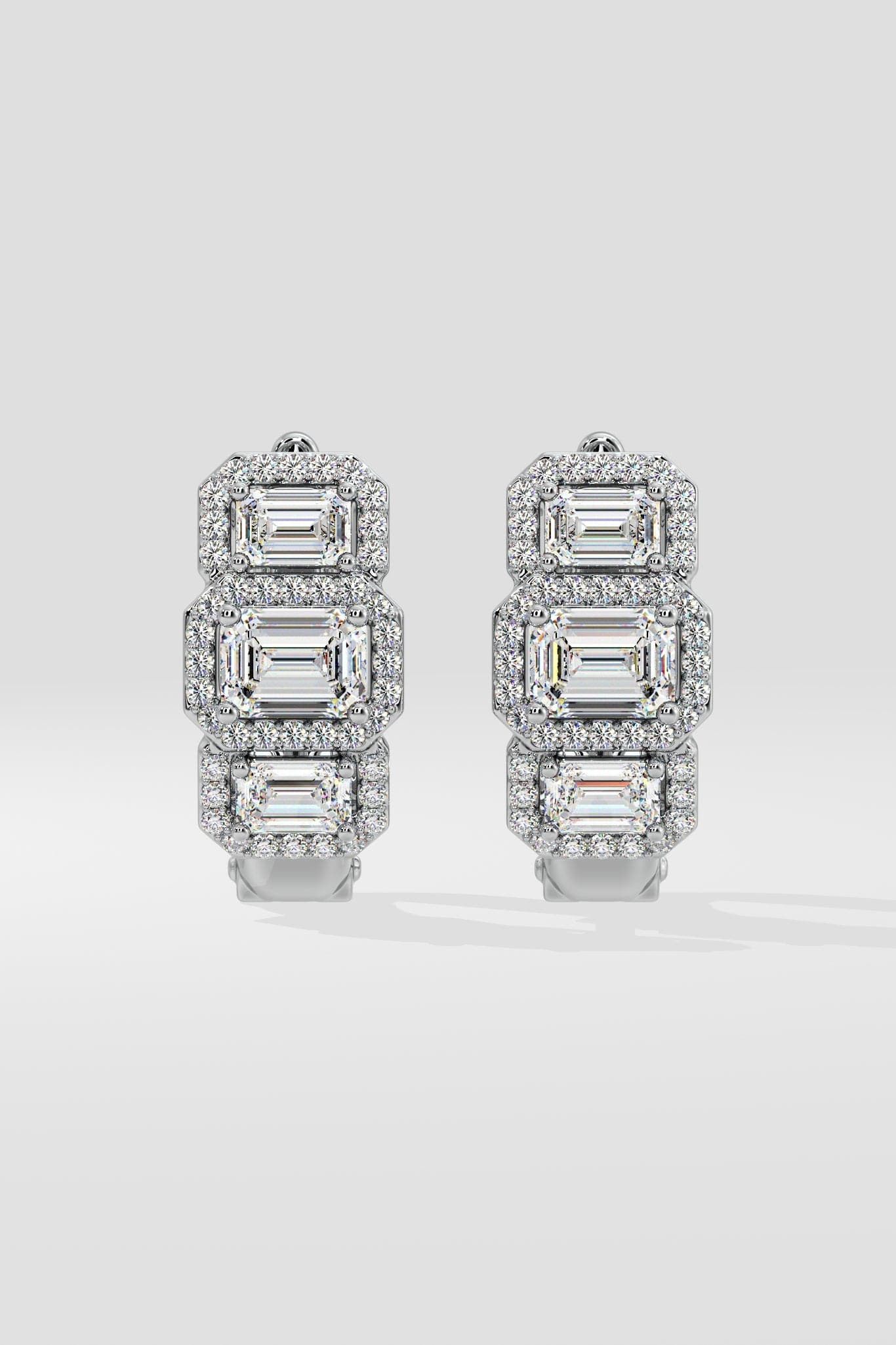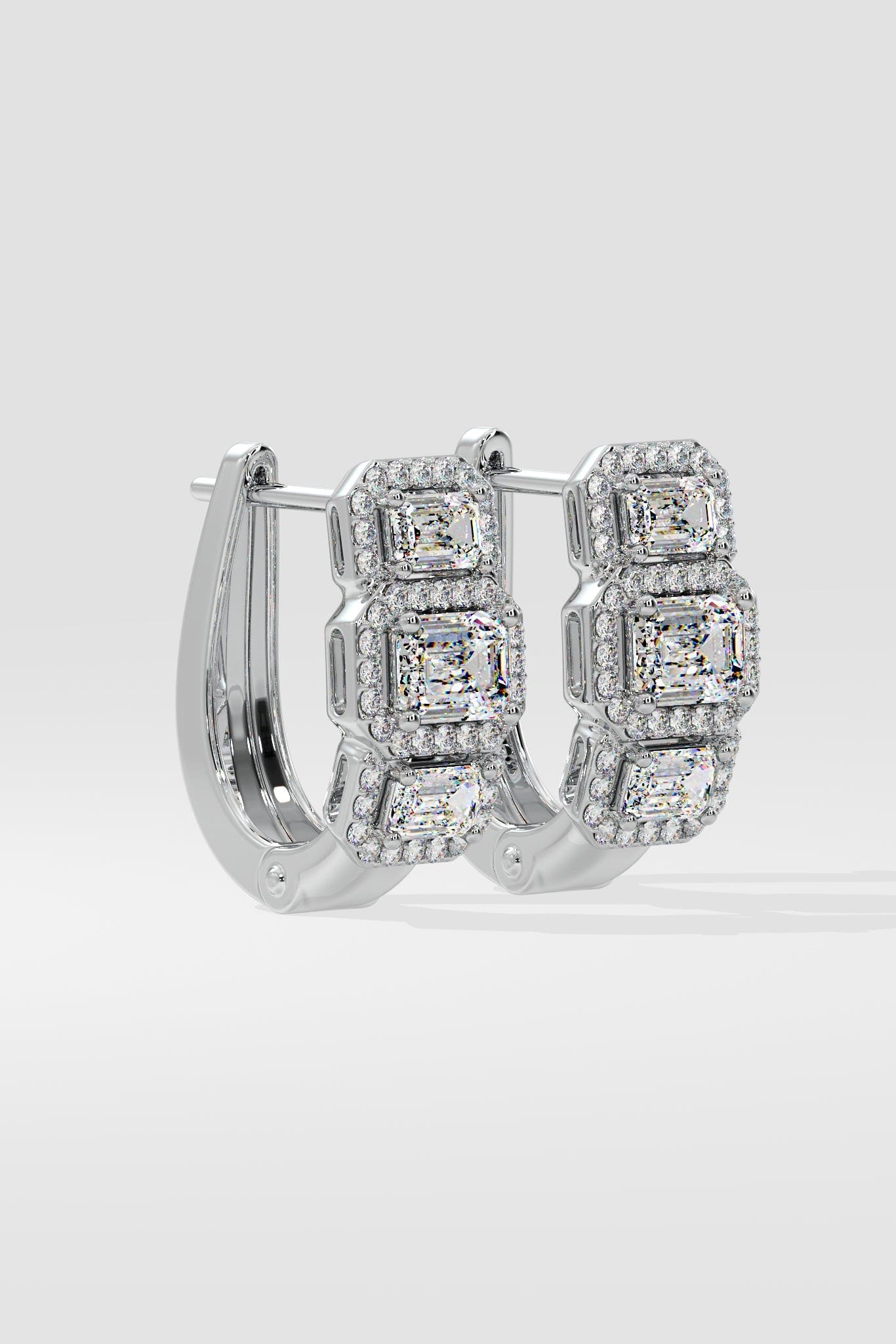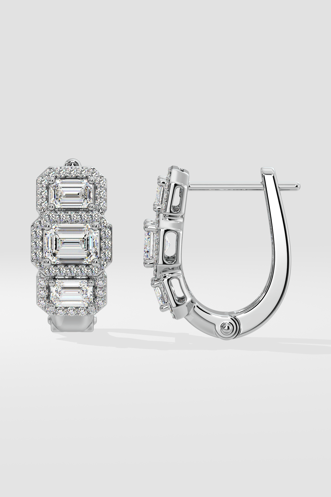 The Emra Huggies features center 0.50 ct emeralds with 0.20 ct emerald on the side, elegantly framed by a halo of sparkling diamonds. Compact and chic making them a perfect choice for everyday wear.