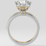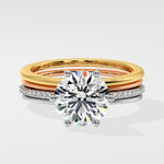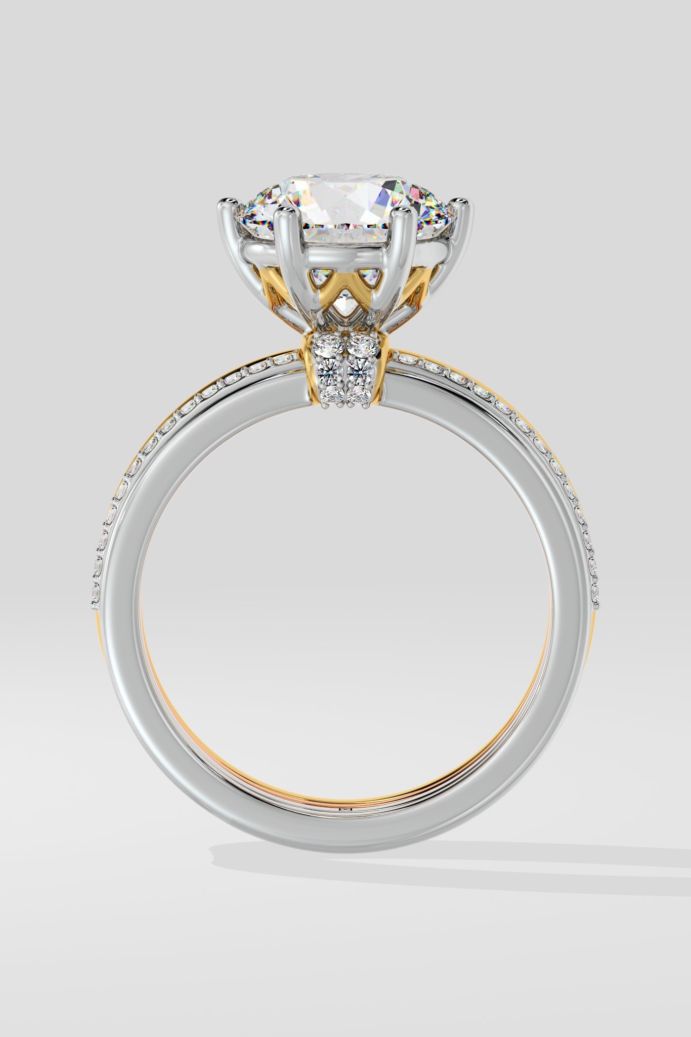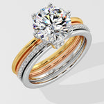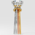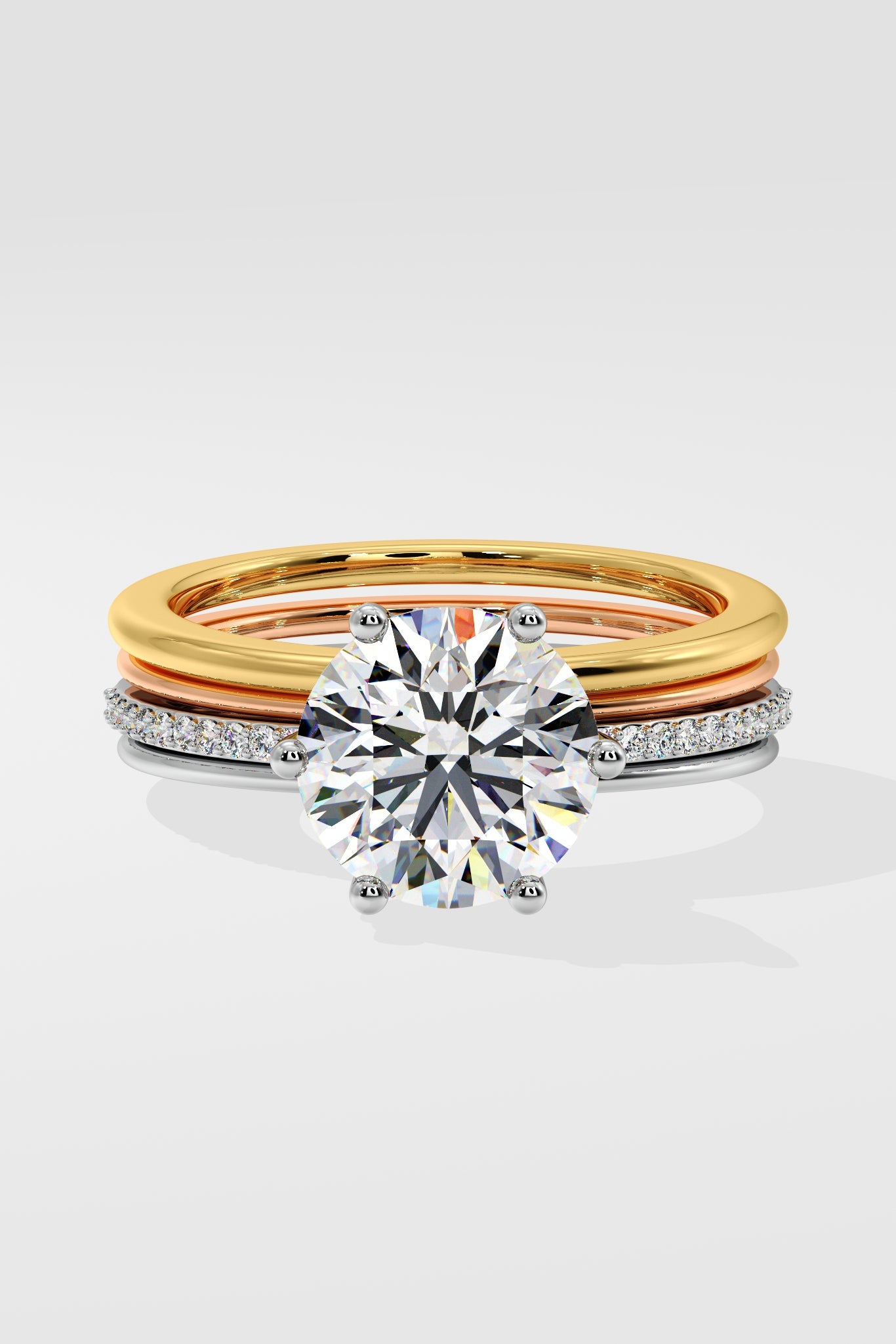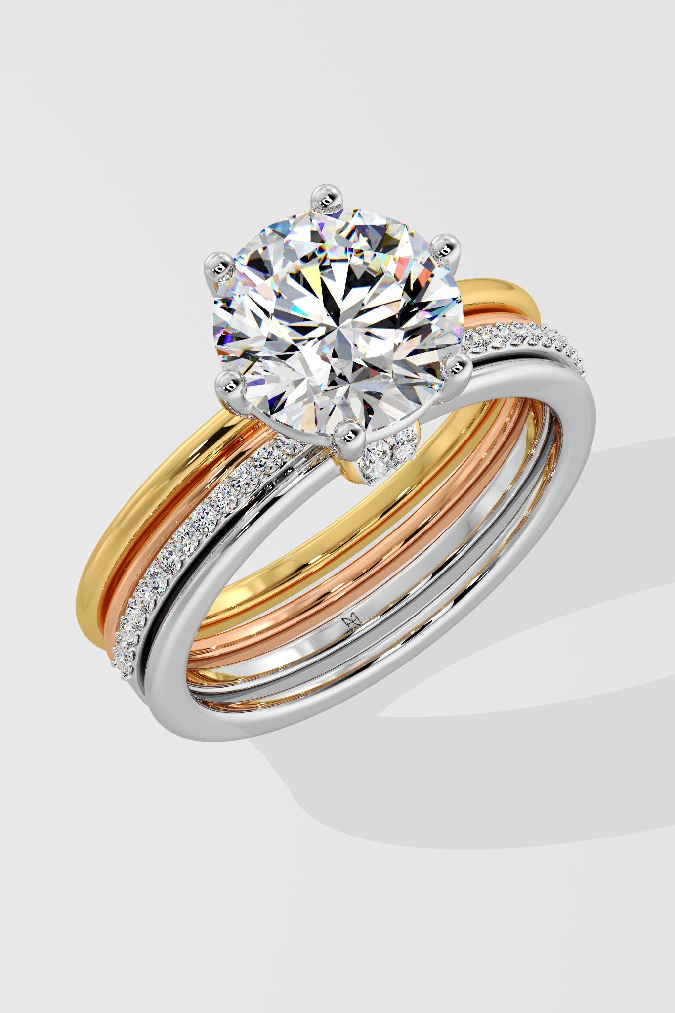 The 2.5 ct Olivetta Lab Grown Diamond Ring features a dazzling 2.5 ct solitaire, framed by four unique bands in yellow, rose, white gold, and a diamond-studded design. This masterpiece effortlessly blends versatility and grandeur, offering a royal touch in a single ring.