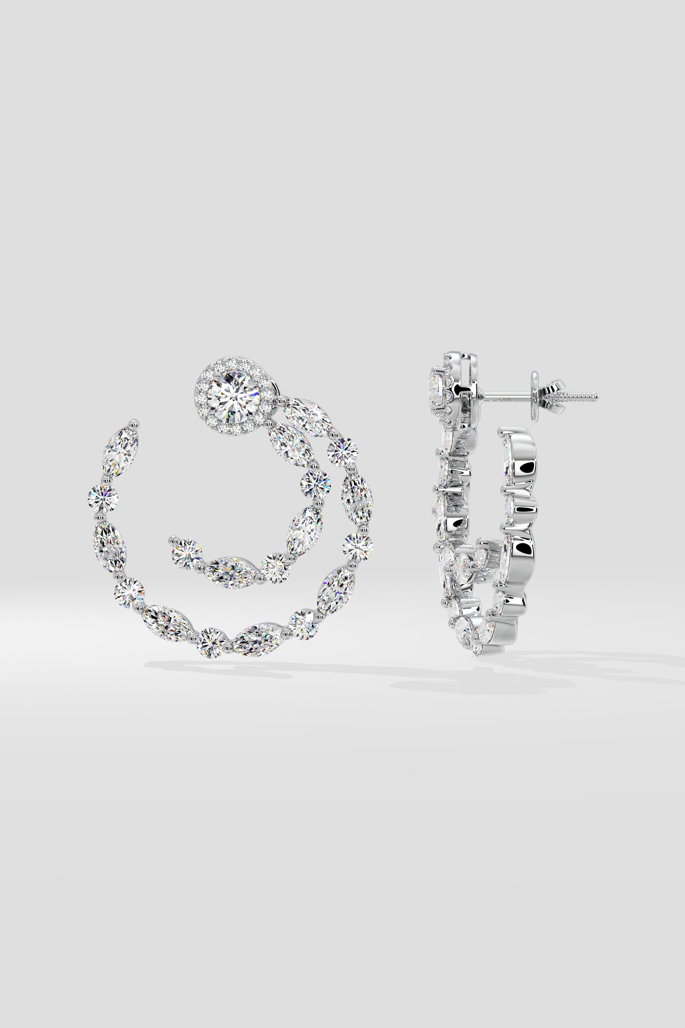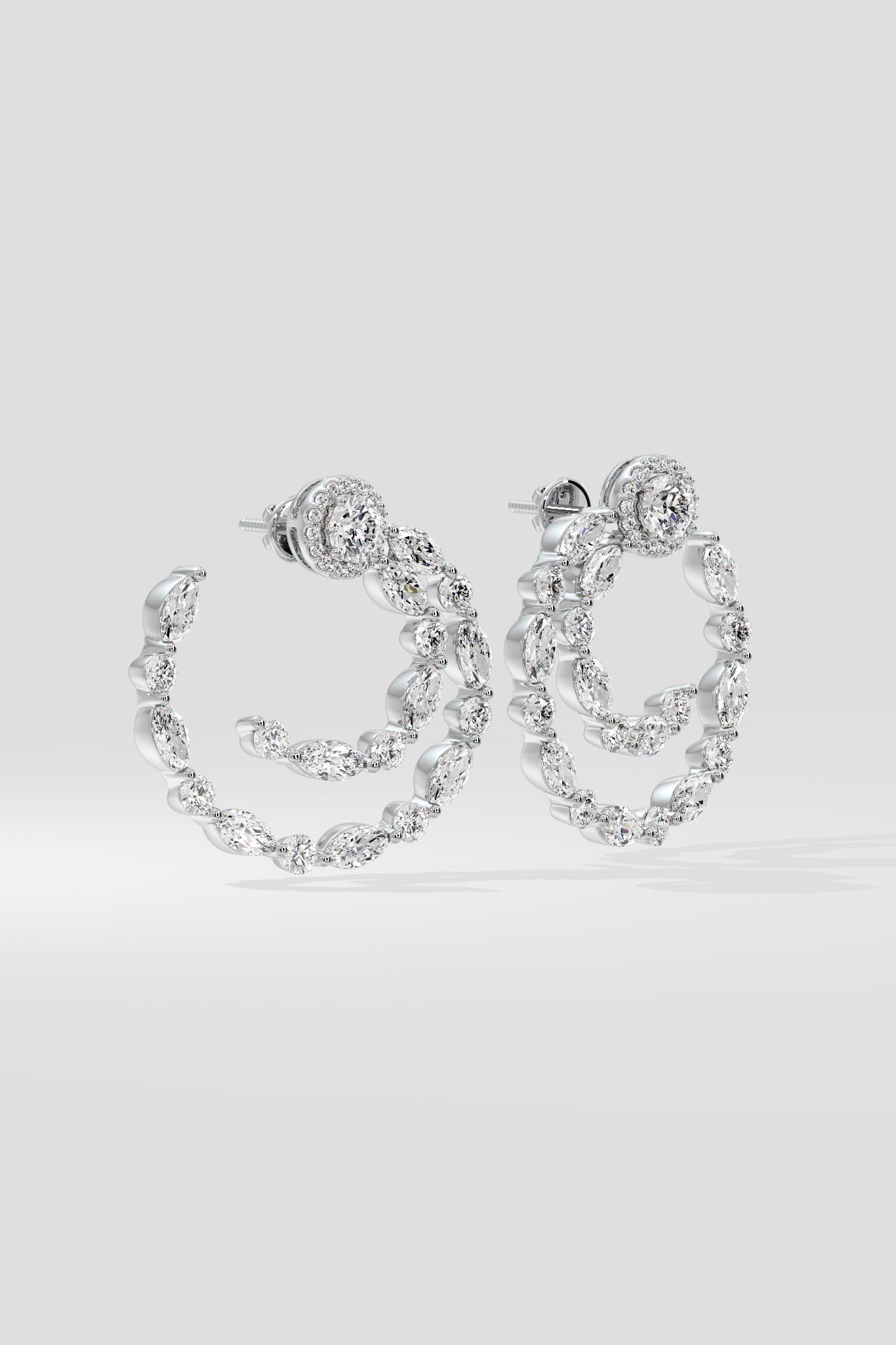 The Signature Double Row Front Hoops are the defining product of the Illuminate collection. A dazzling display of diamonds make these stunning earrings shine bright from all angles. Features 1/2 ct Round brilliant solitaires combined with 1/5 ct Marquise diamonds for a total of 7 ct+ diamond wt.