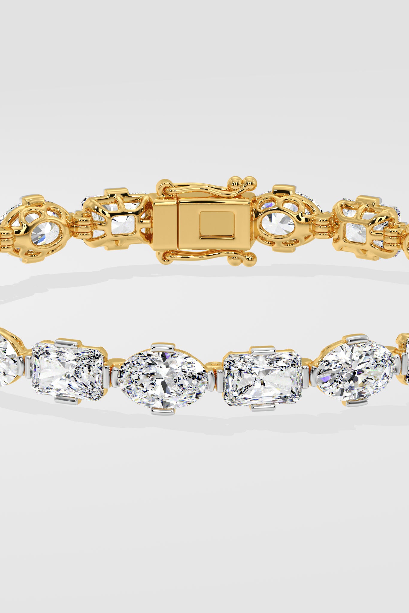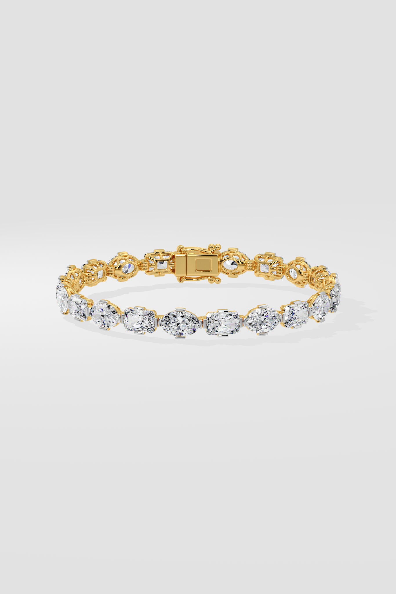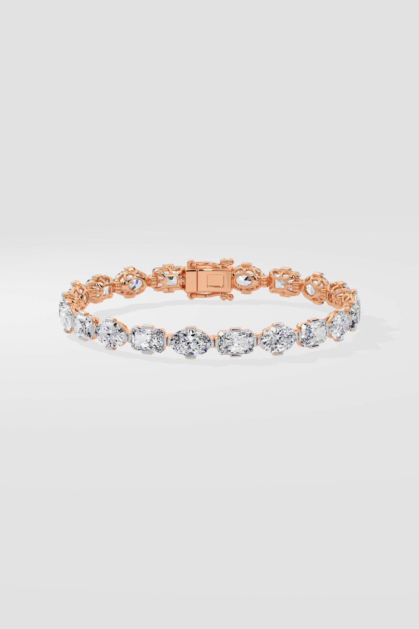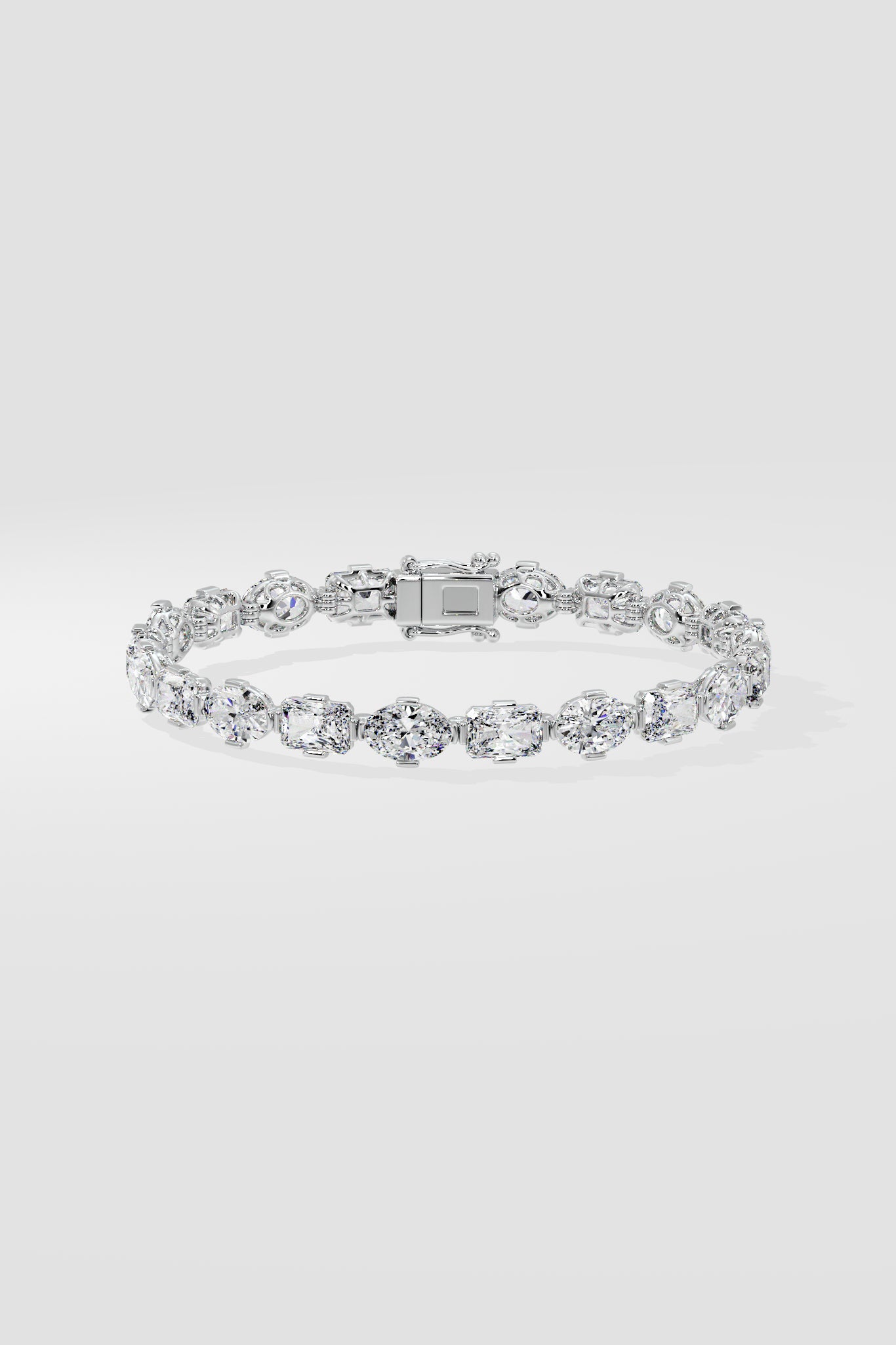 0.50 ct radiant and oval diamonds are set horizontally in a clean, seamless line. The mix of shapes adds a subtle twist to this otherwise classic, structured design.