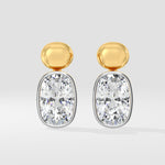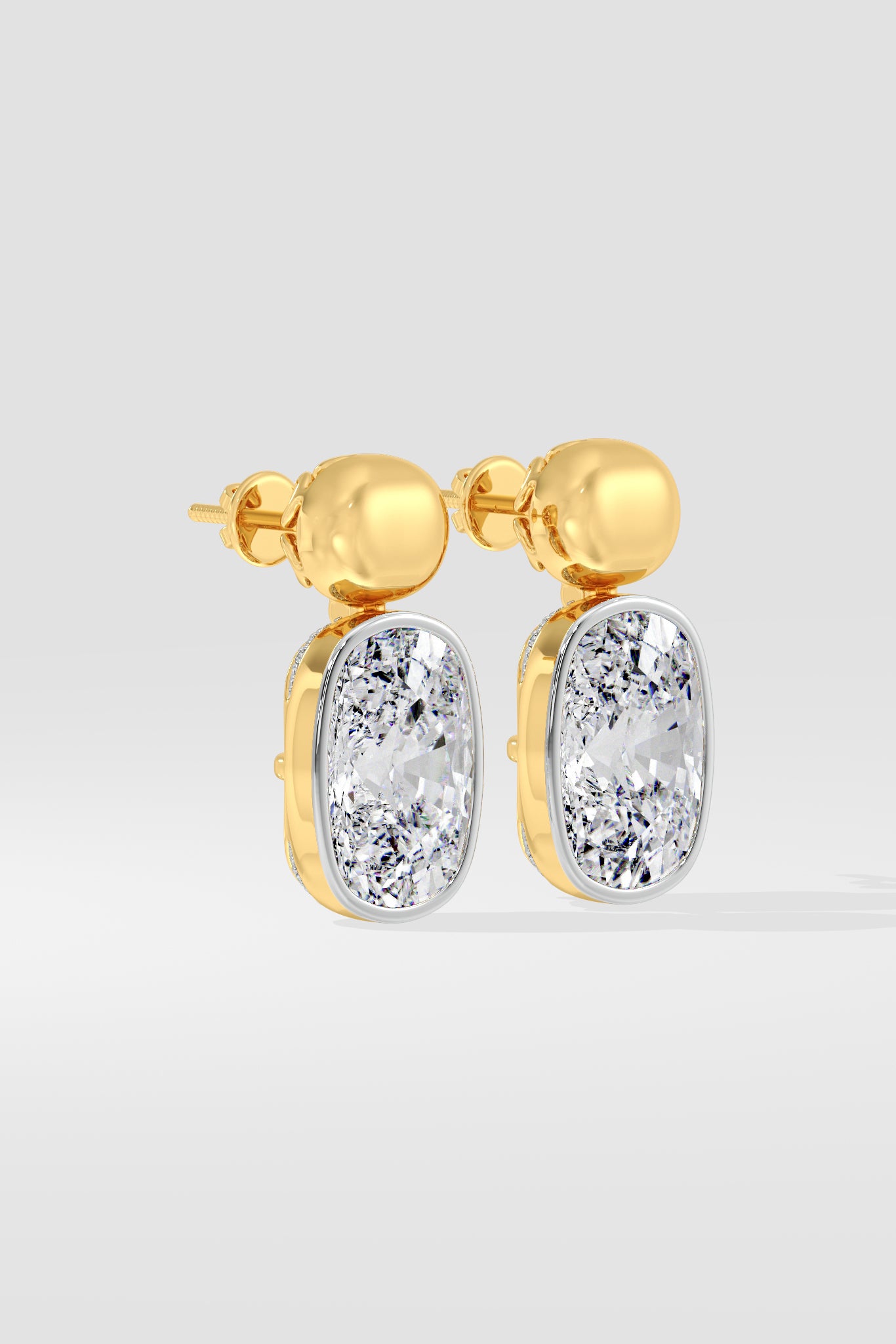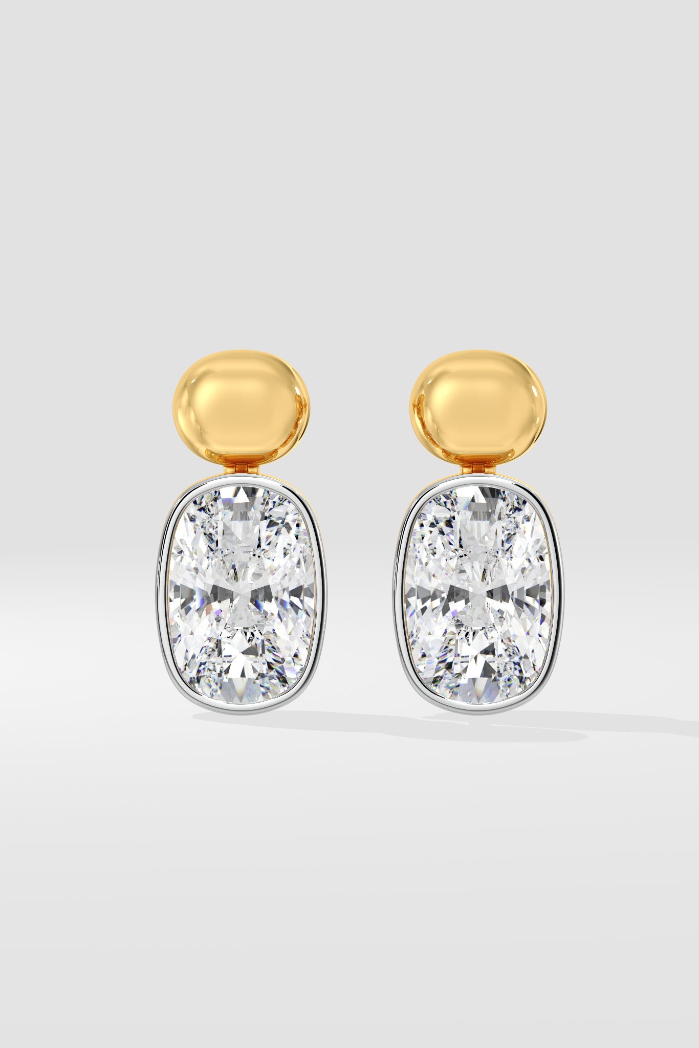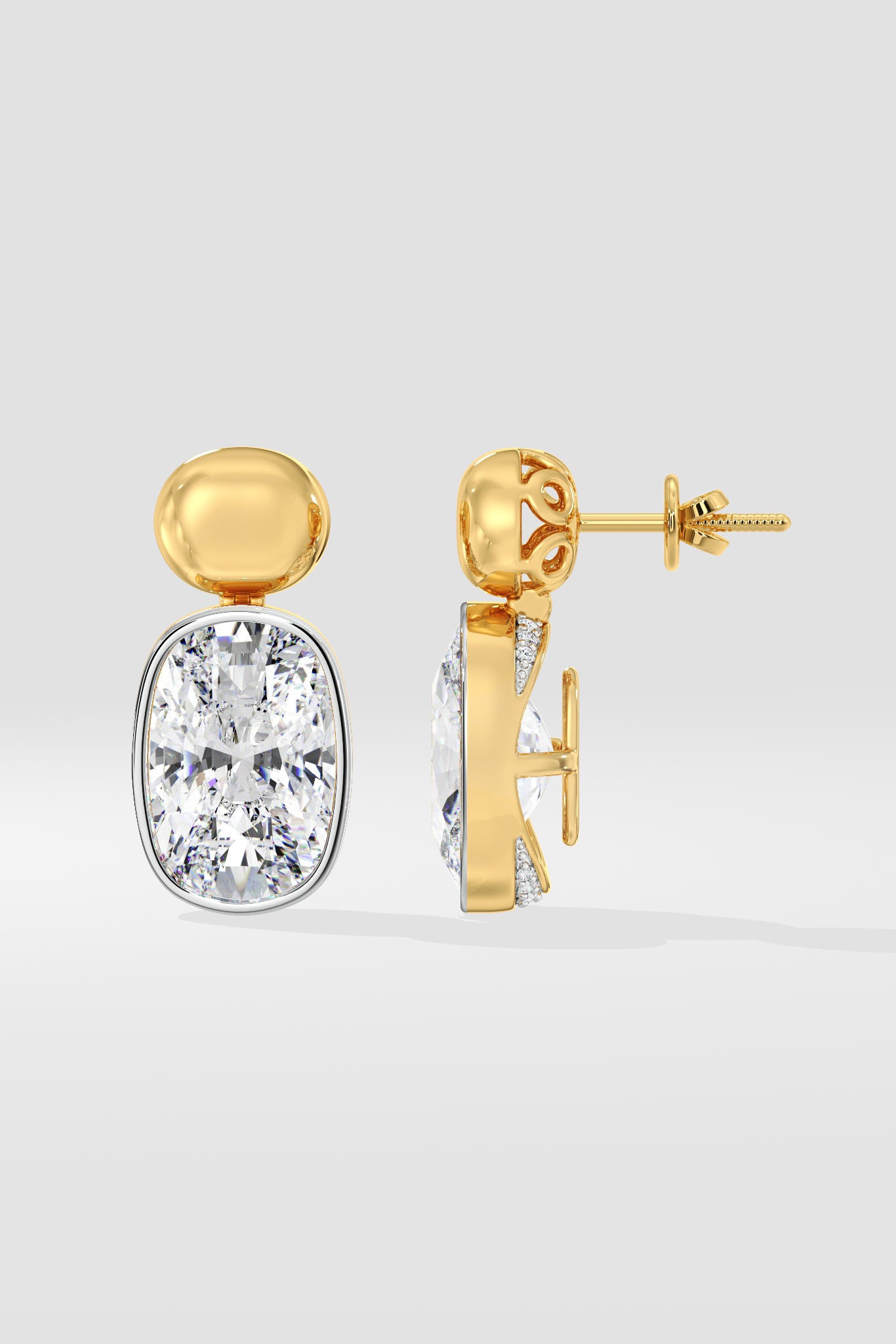 The Aureum Drops feature 4 Ct cushion-cut drops encased in a sleek bezel setting, crowned with a single polished gold ball on top. The fusion of radiant cushions and warm gold detailing creates a modern yet timeless look.