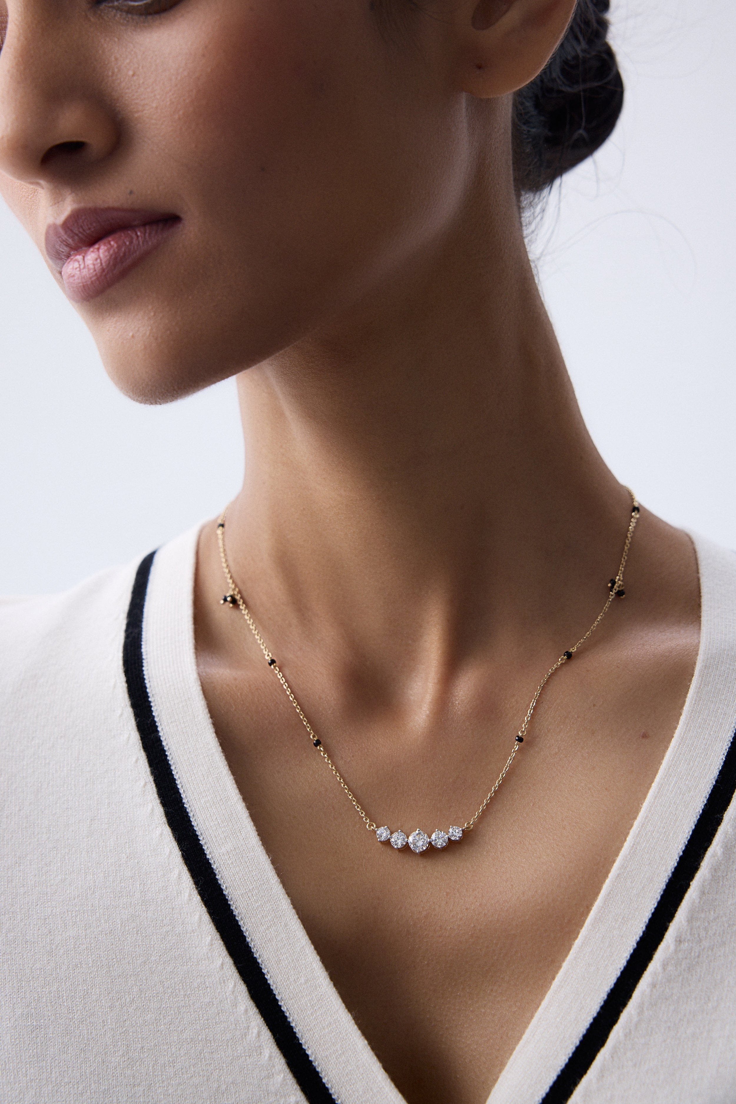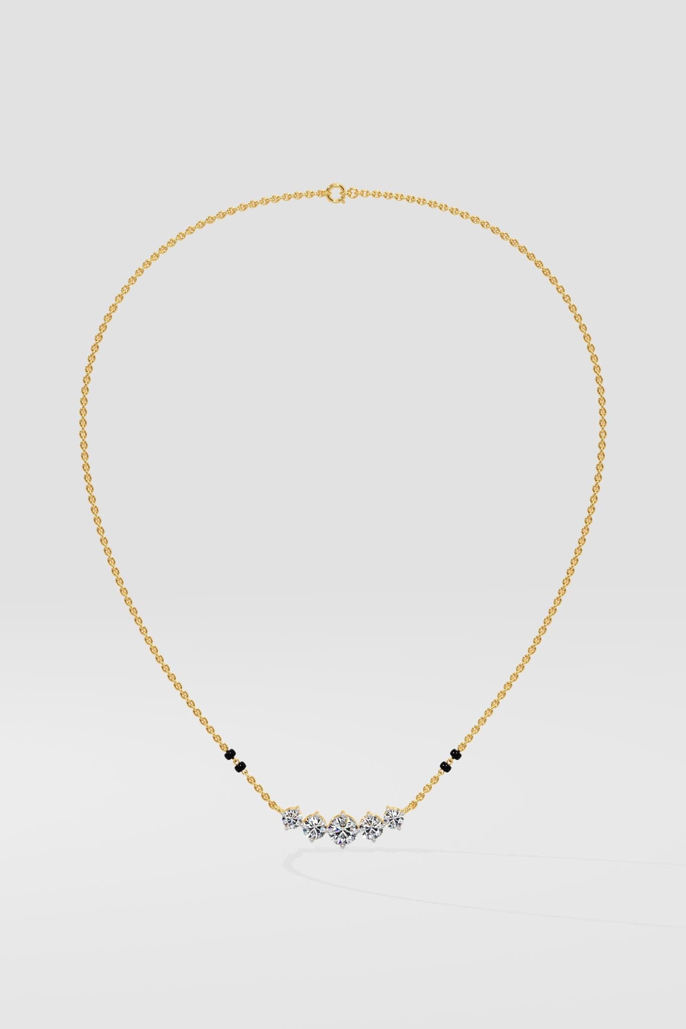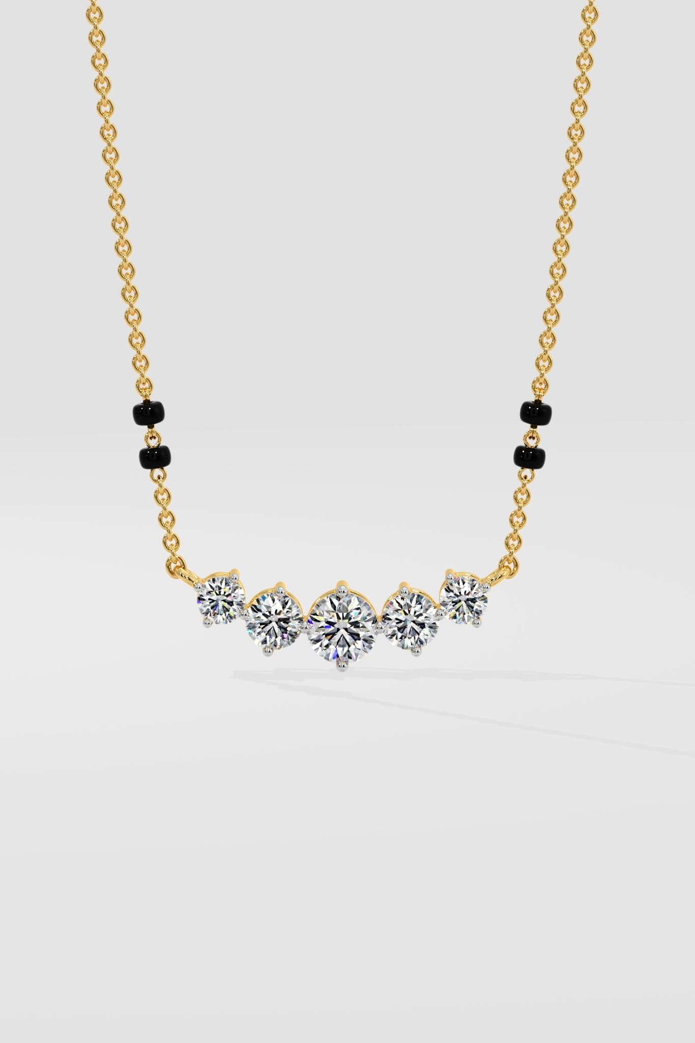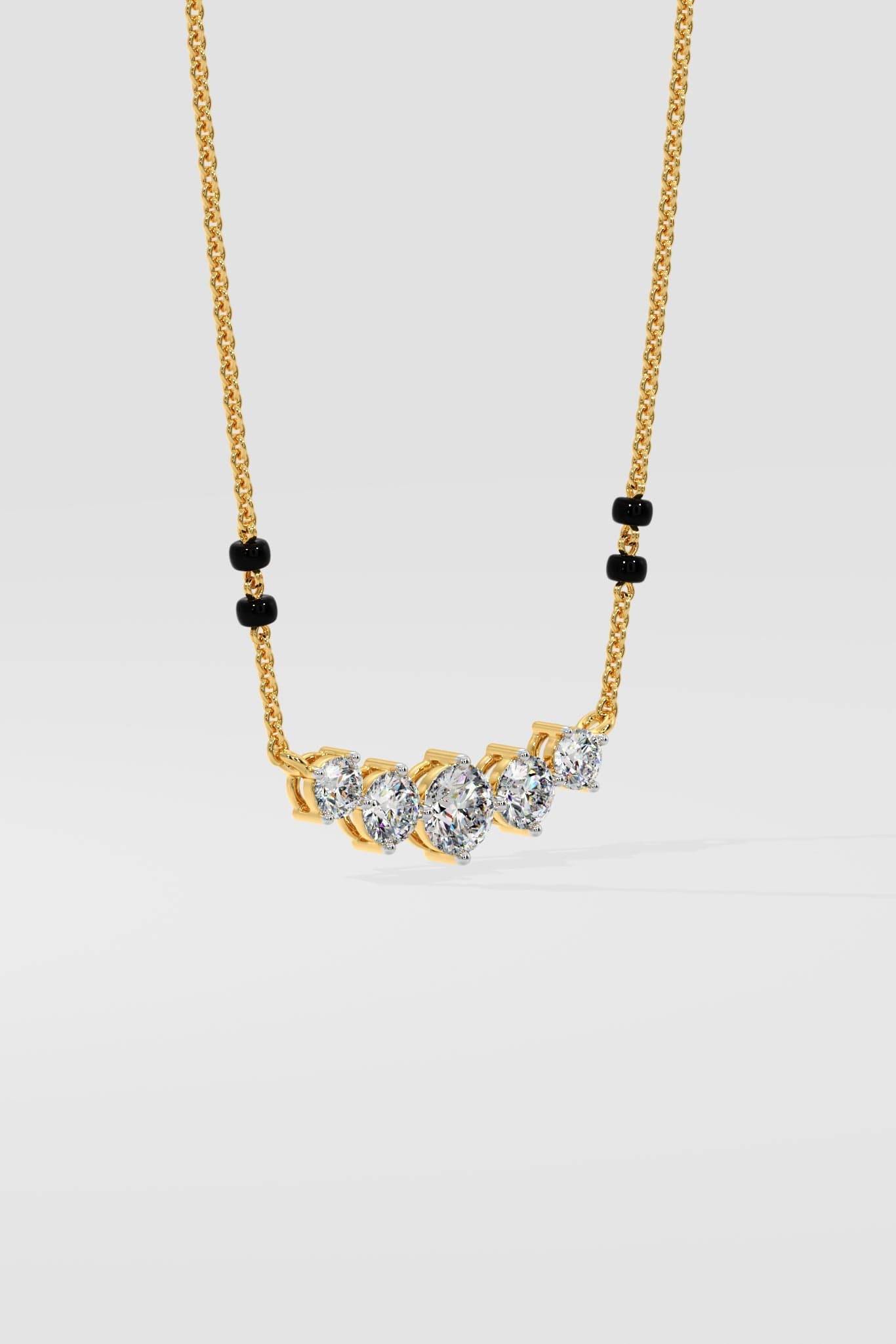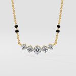 Eternal Sparkle Mangalsutra is a classic 5 stone style, starting with a 0.50 ct center stone and then 0.25 ct & 0.20 ct diamonds on each side respectively. A minimal, beautiful, daily diamond style.