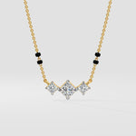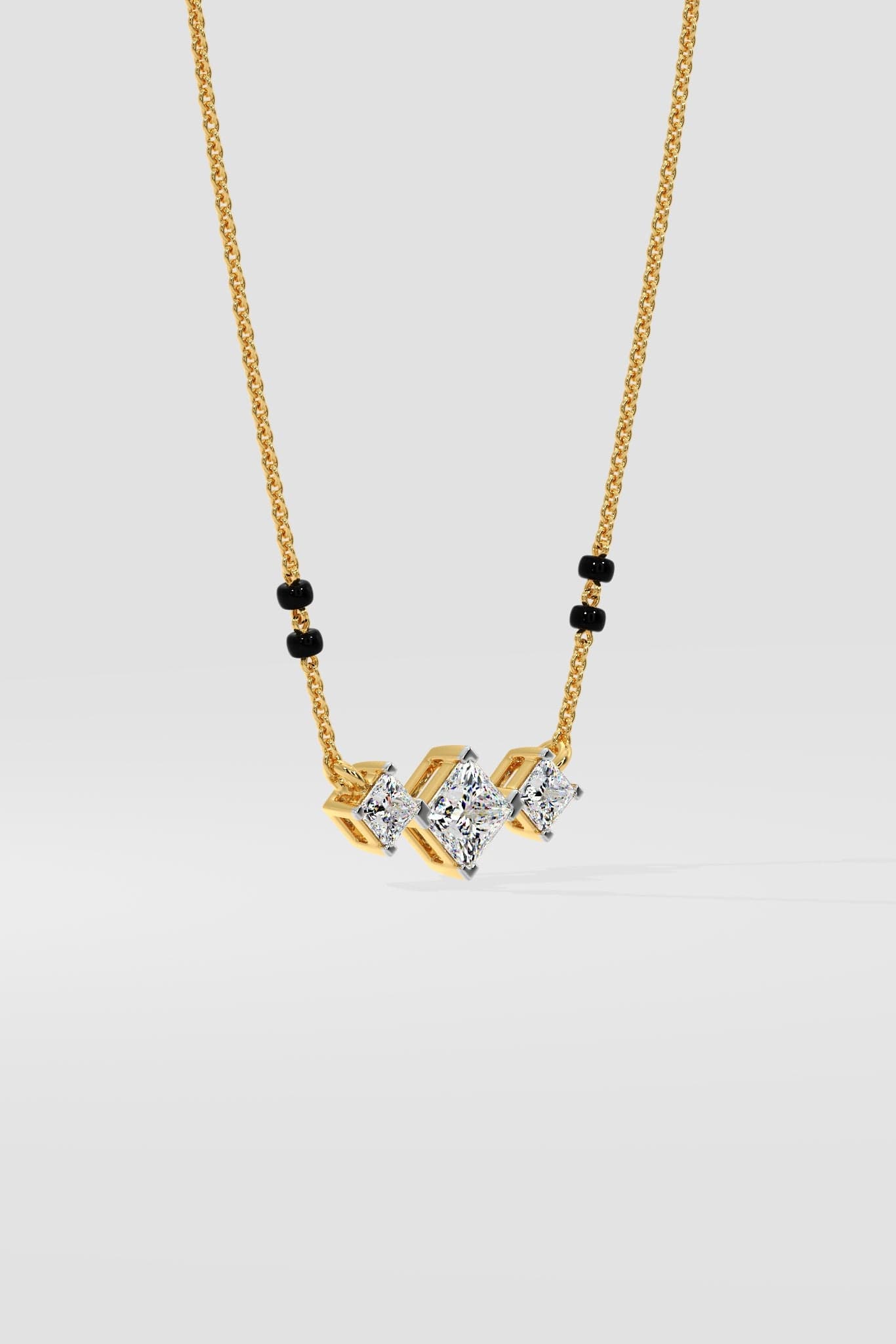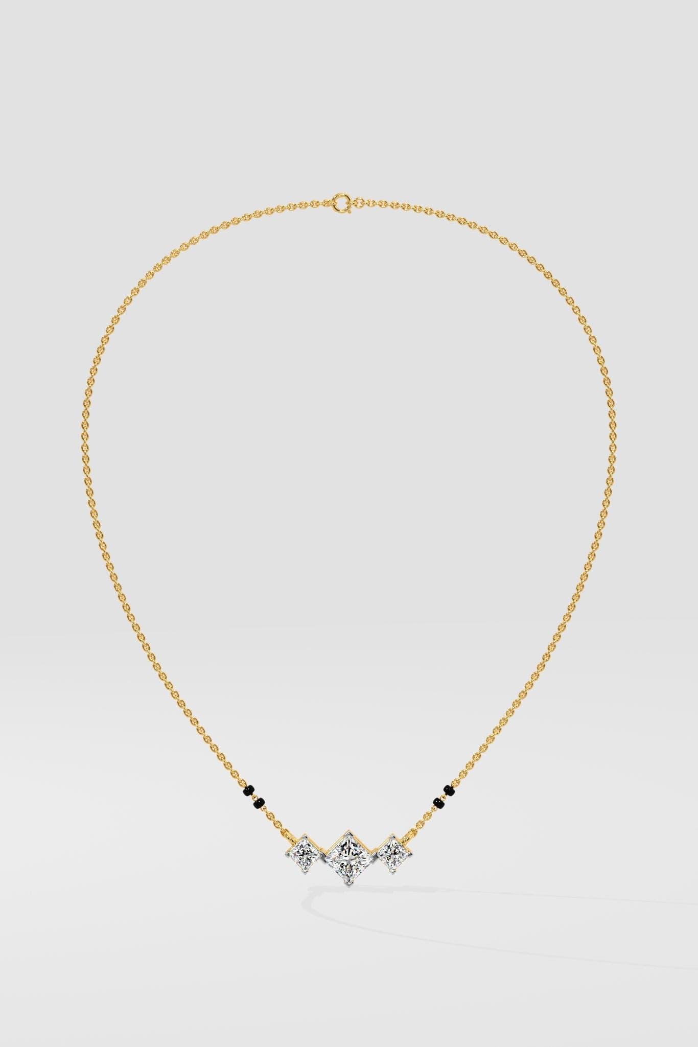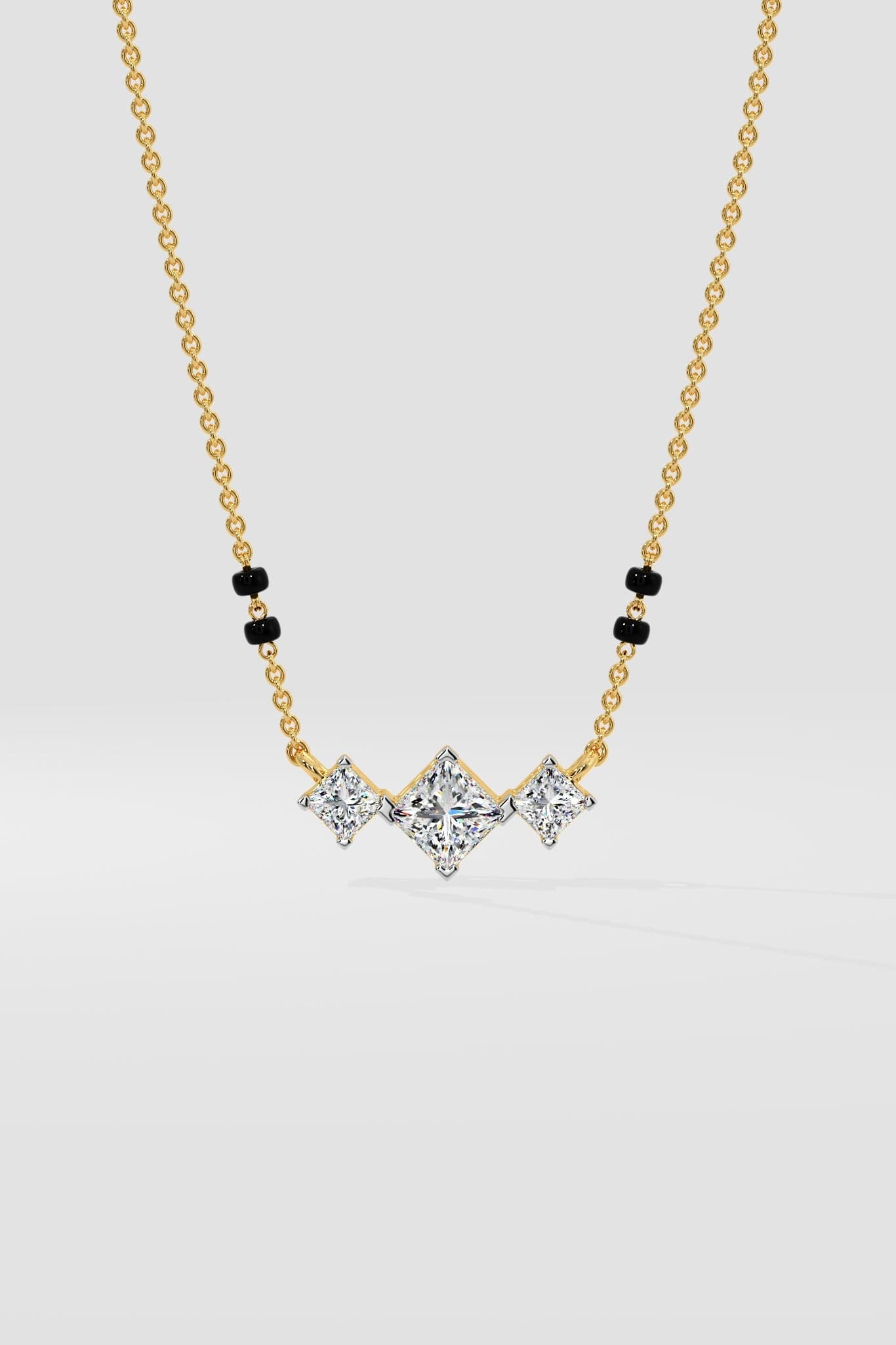 The Princess Trio Mangalsutra shines with a striking 0.50 ct princess-cut center diamond flanked by two 0.25 ct diamonds. Its minimal yet captivating design is the perfect for your daily style.