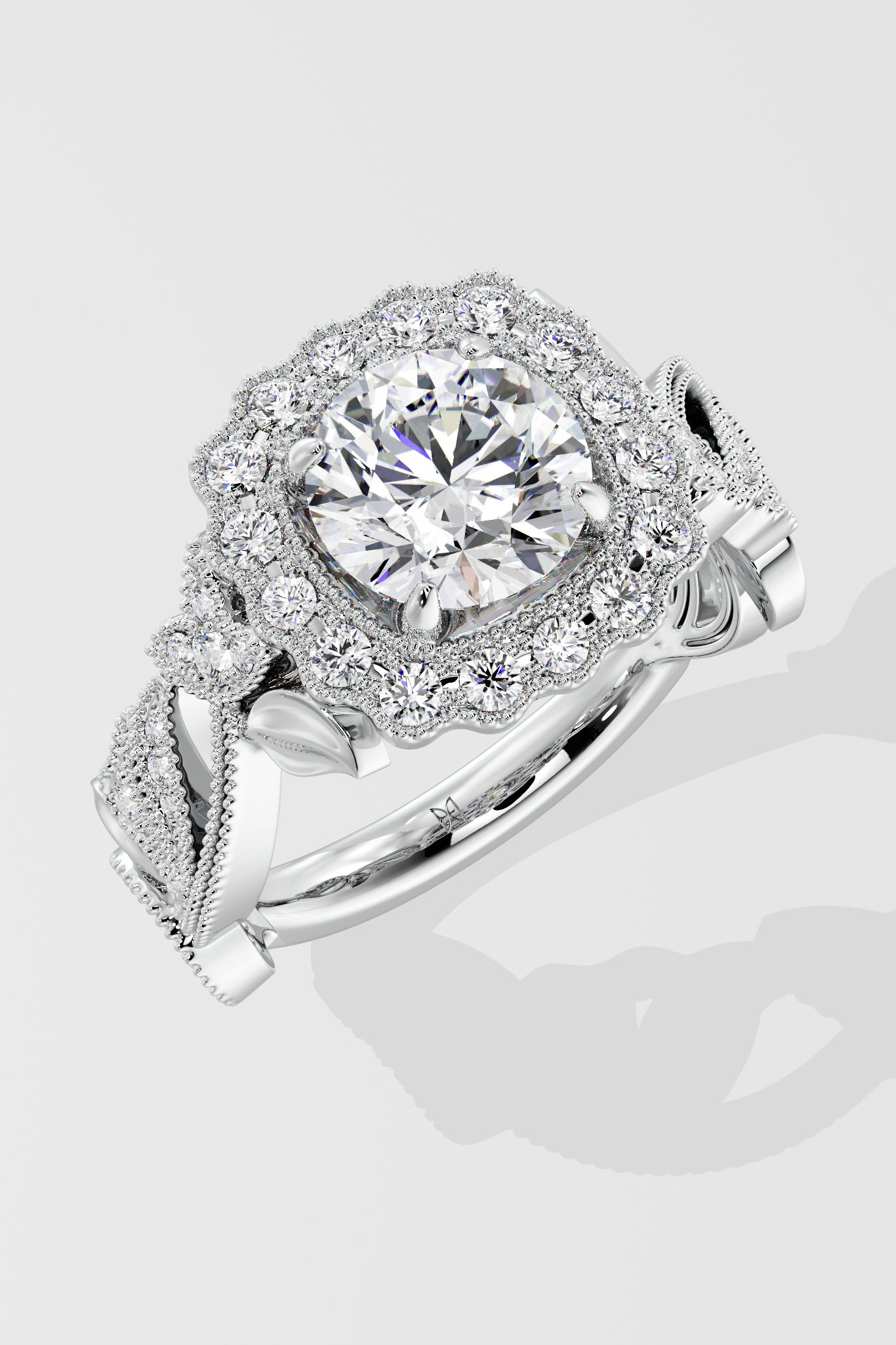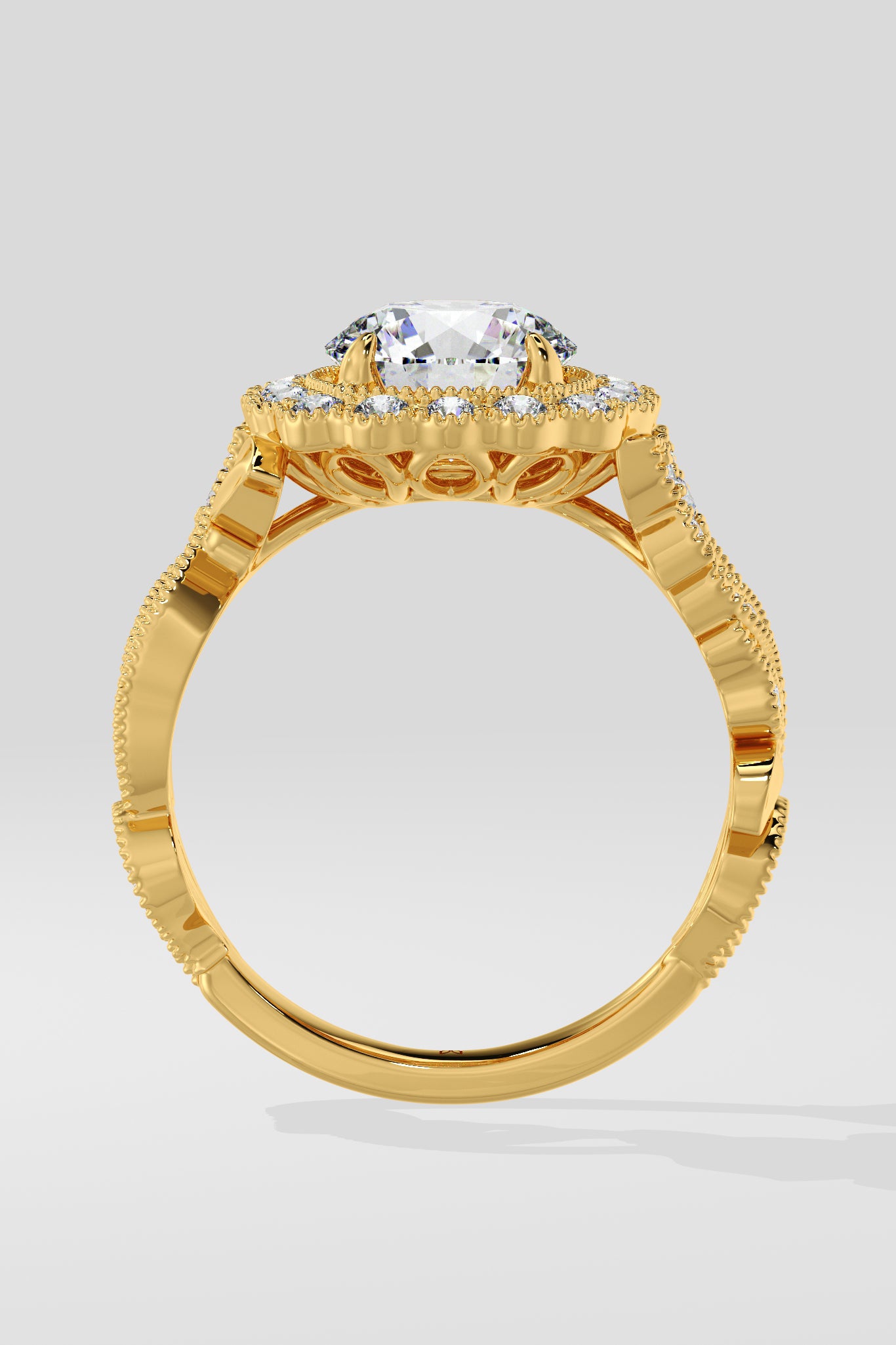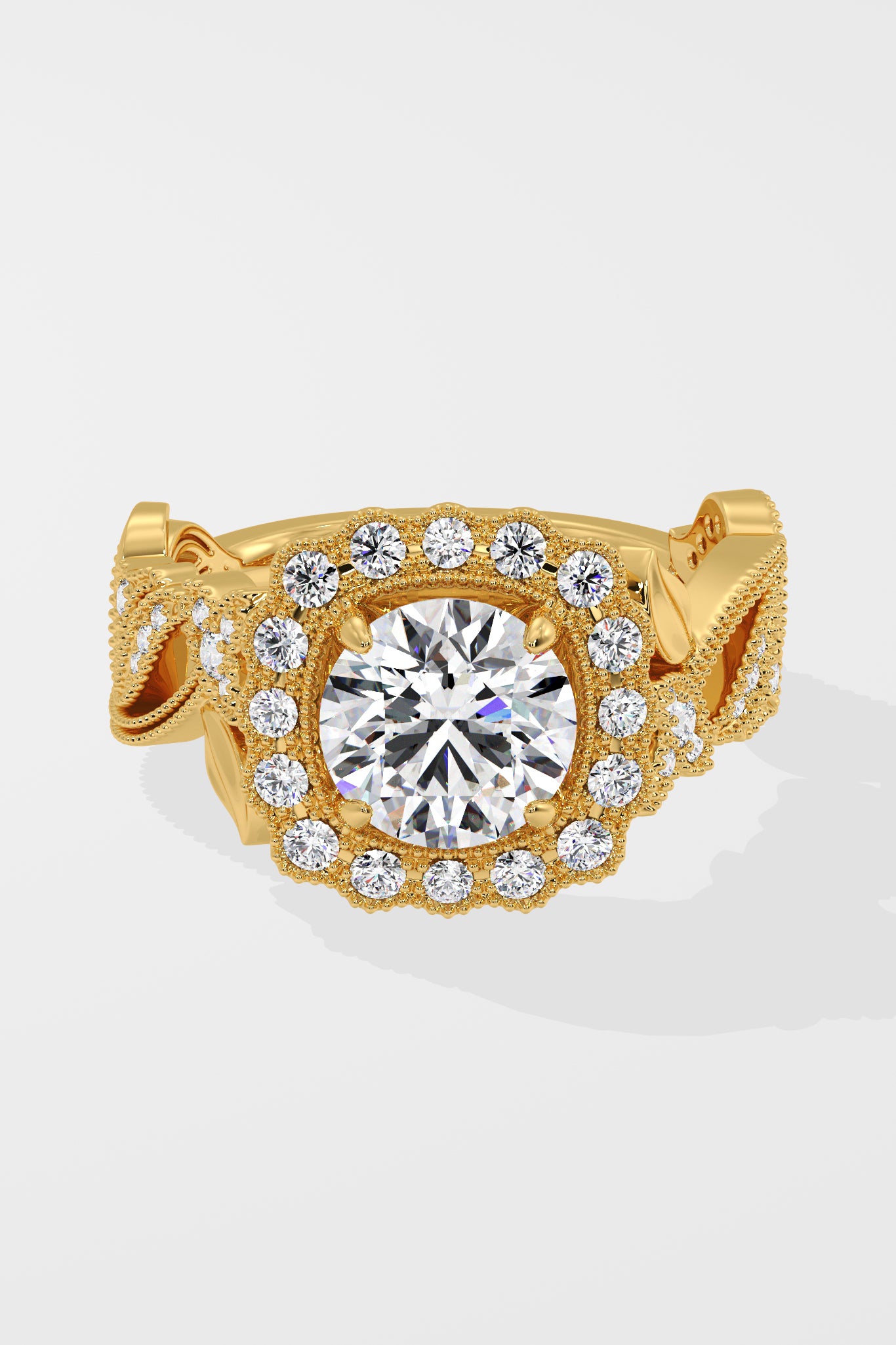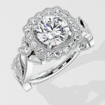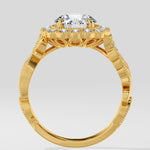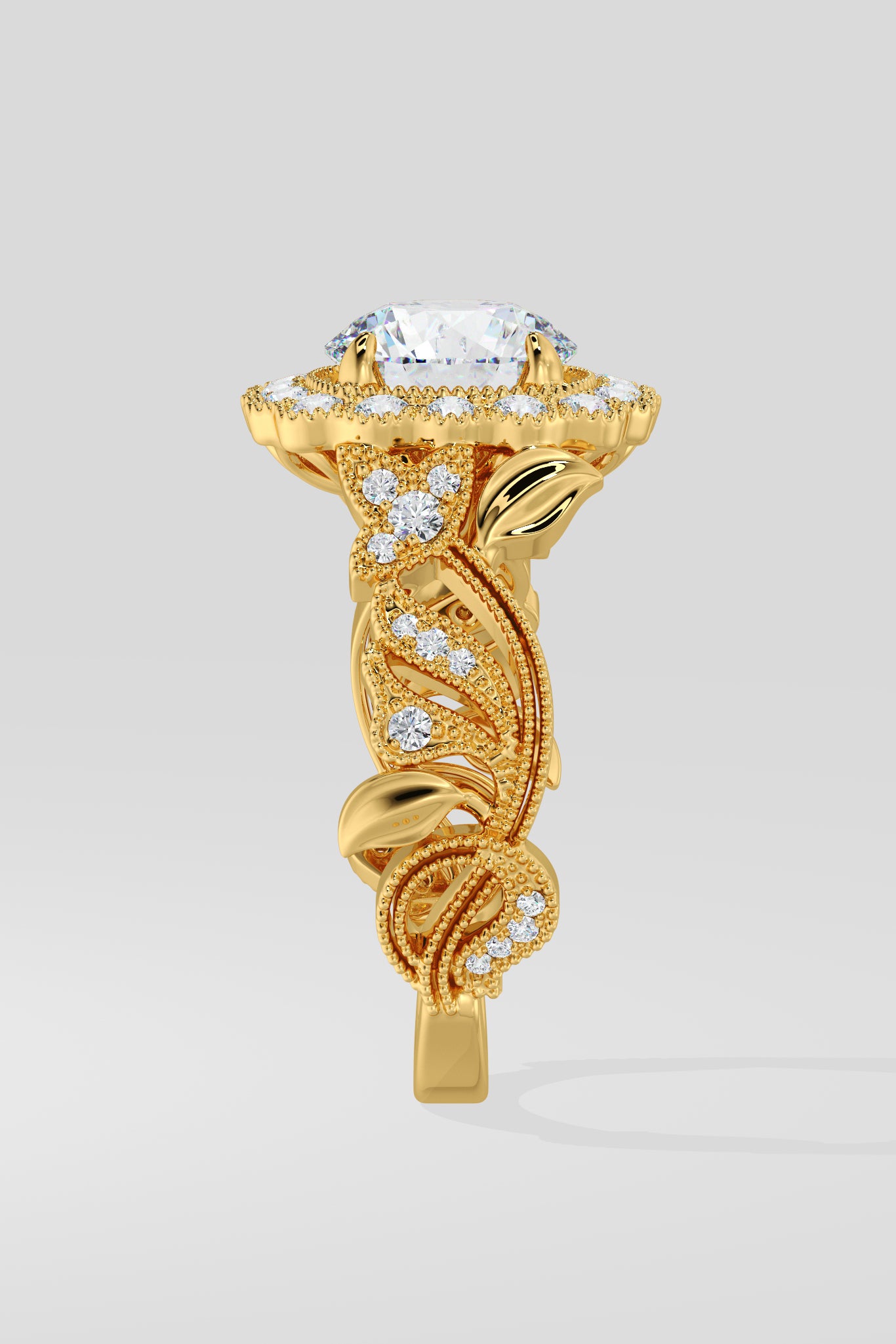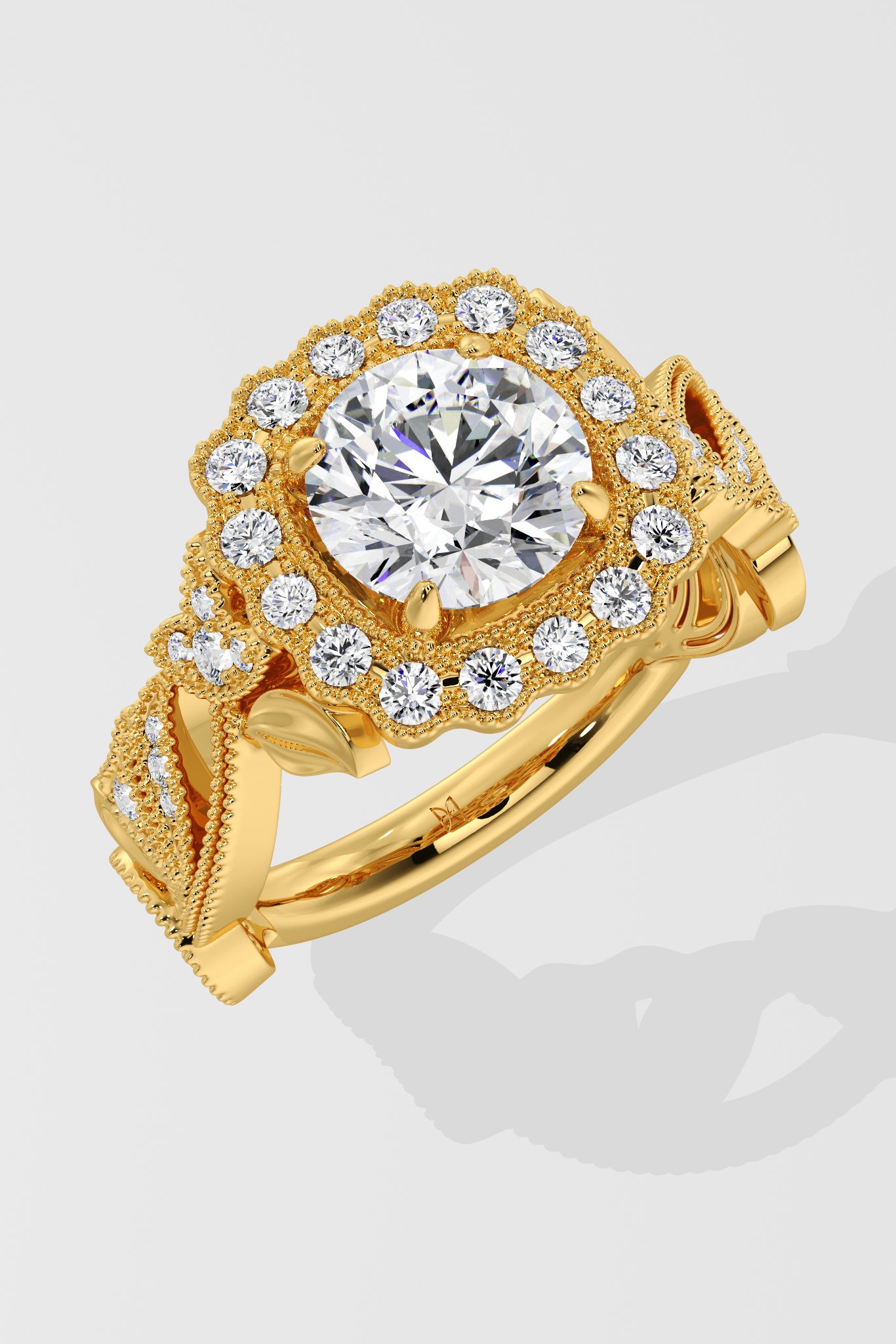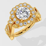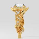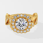Regal, radiant, unforgettable. A 1.5 Ct Round Diamond shines at the heart of the ring, framed with pavé diamonds. The Gold band flows with delicate vine-inspired engraving, each curve and detail crafted to evoke grace and nobility. This is where vintage craftsmanship meets feminine grace.