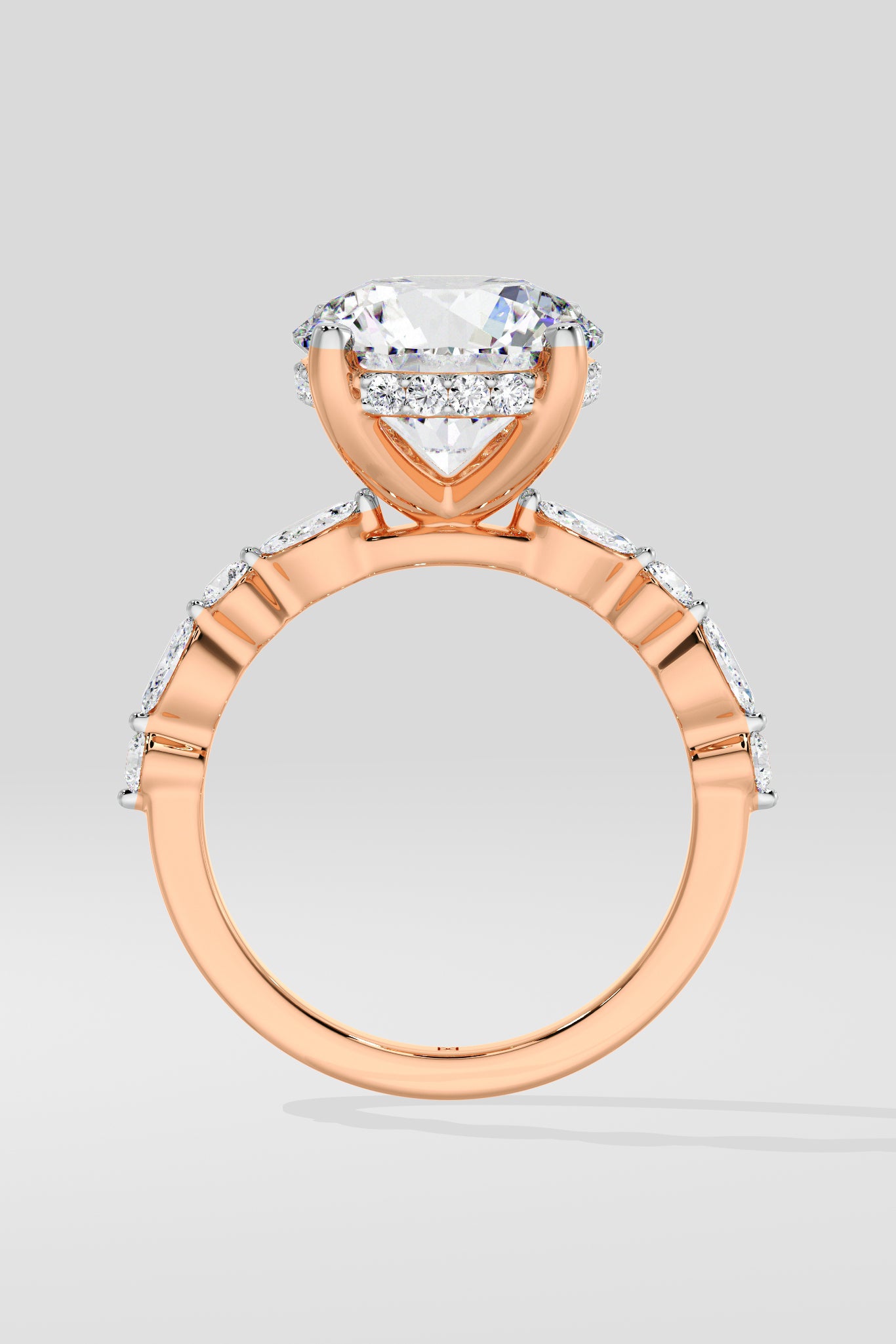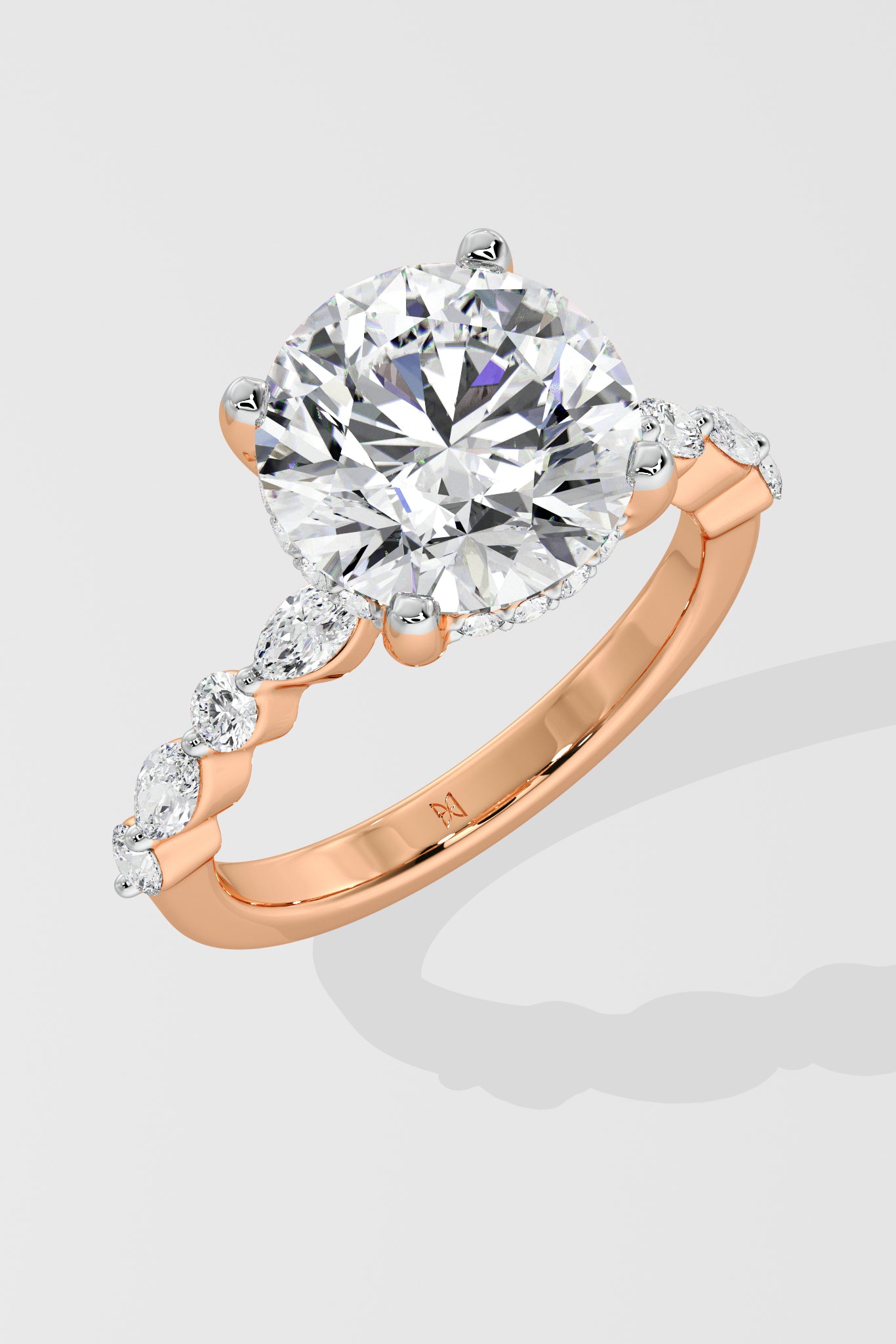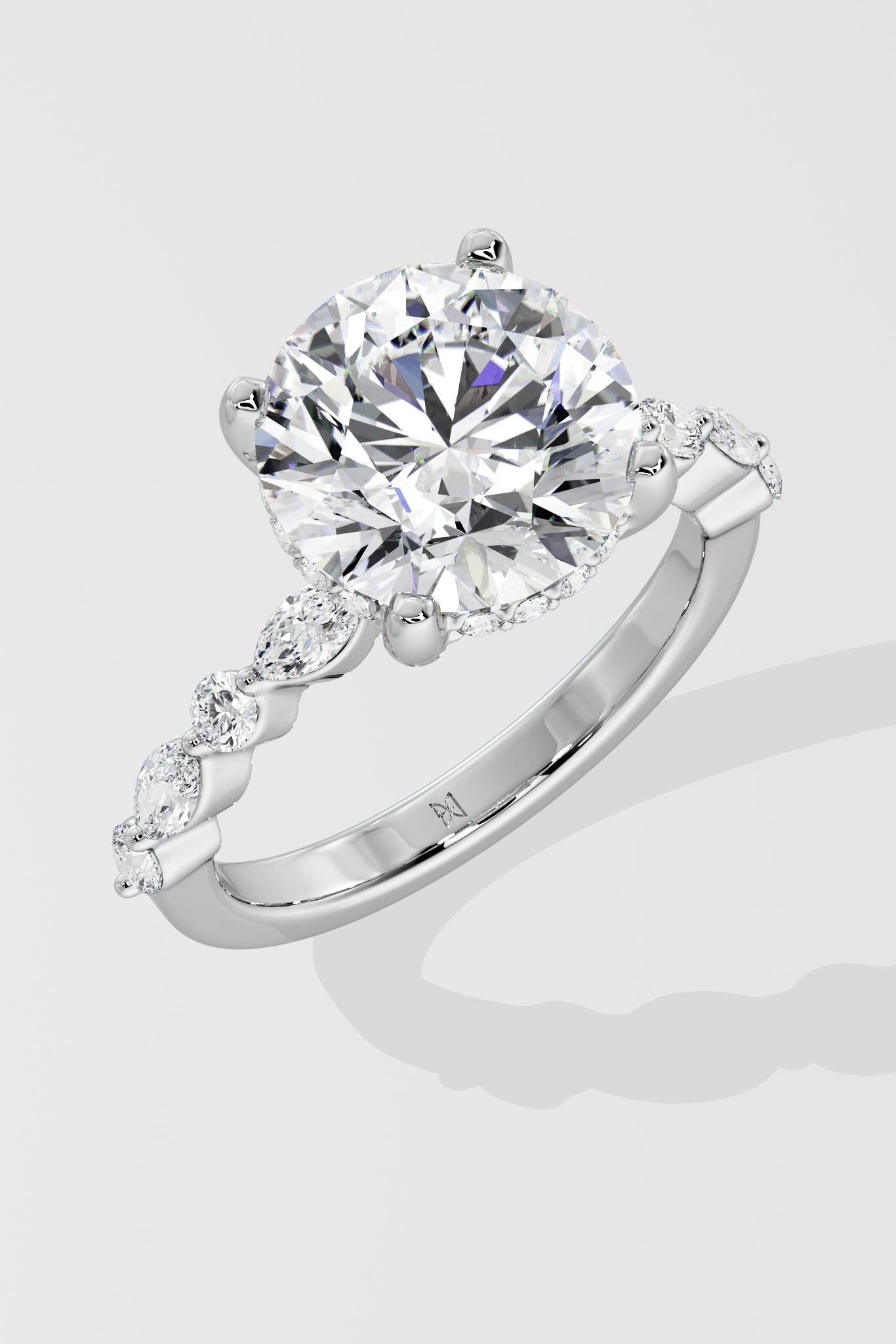 This Round Askew Solitaire Lab Grown Diamond Ring features a stunning 3 ct center enveloped with a hidden halo. The signature askew shank alternates between marquise and round diamonds, providing that all diamond look. A classic with a modern twist.