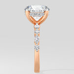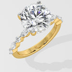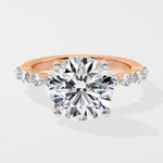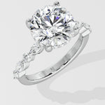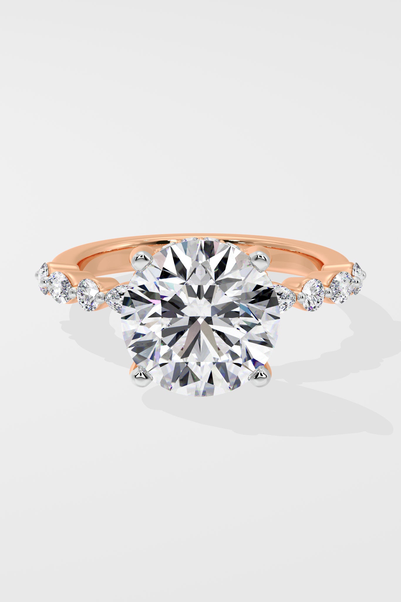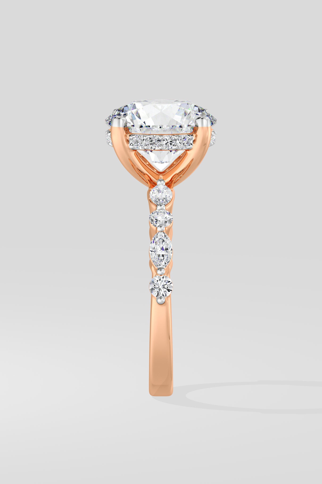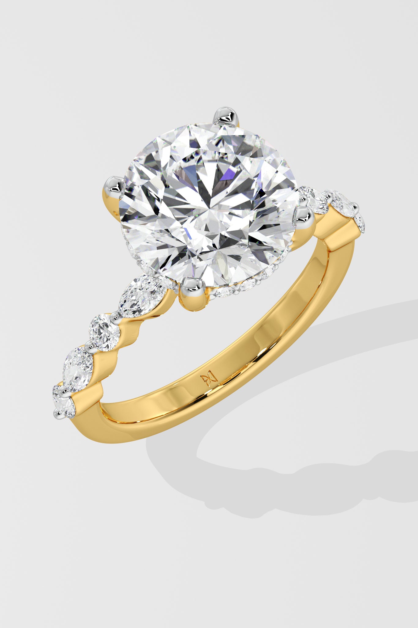 This Round Askew Solitaire Lab Grown Diamond Ring features a stunning 3 ct center enveloped with a hidden halo. The signature askew shank alternates between marquise and round diamonds, providing that all diamond look. A classic with a modern twist.