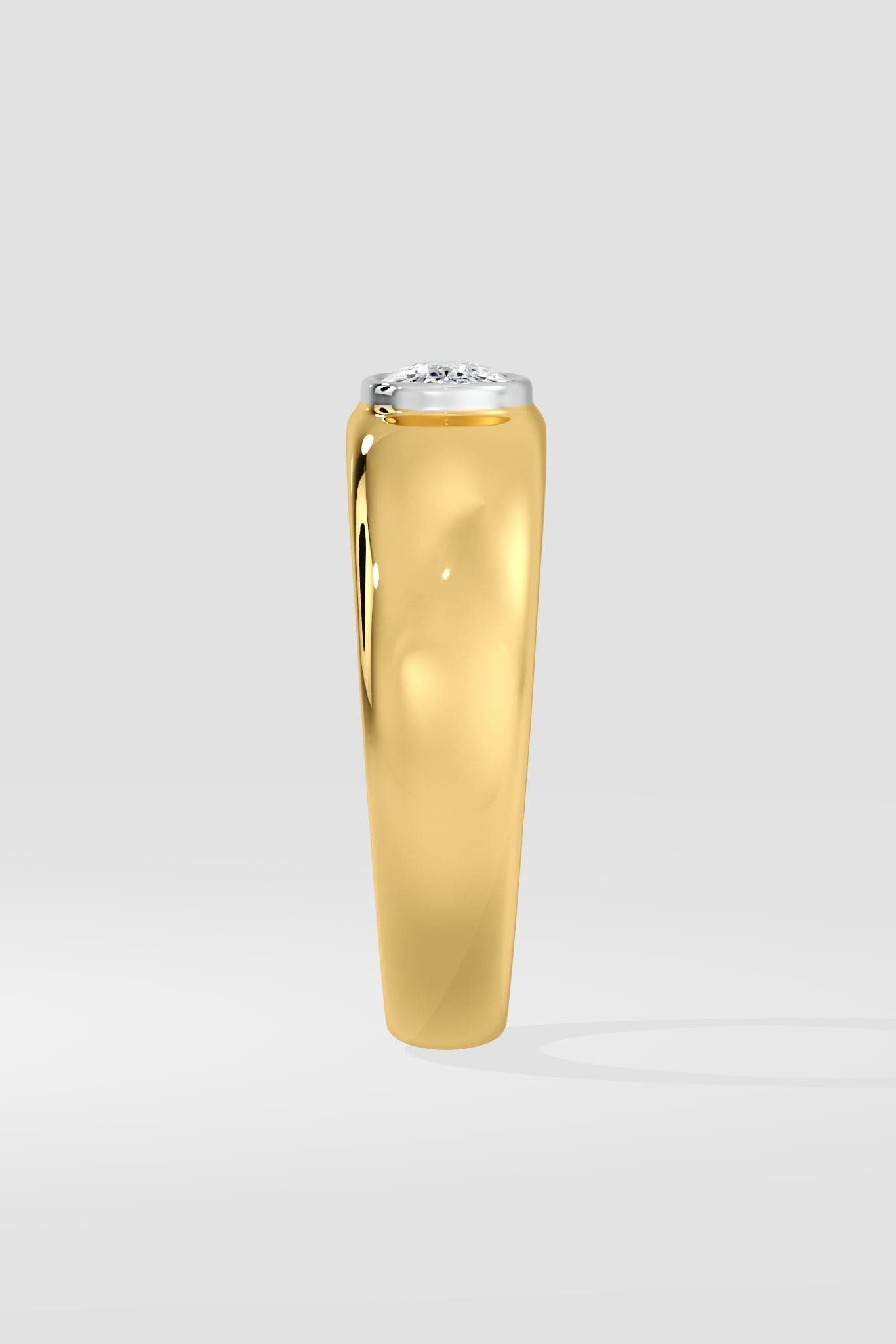 A bold 1 Ct Cushion-cut Diamond sits seamlessly in a rich gold bezel ring for Men. The dome-shaped solid gold band holds a commanding look.