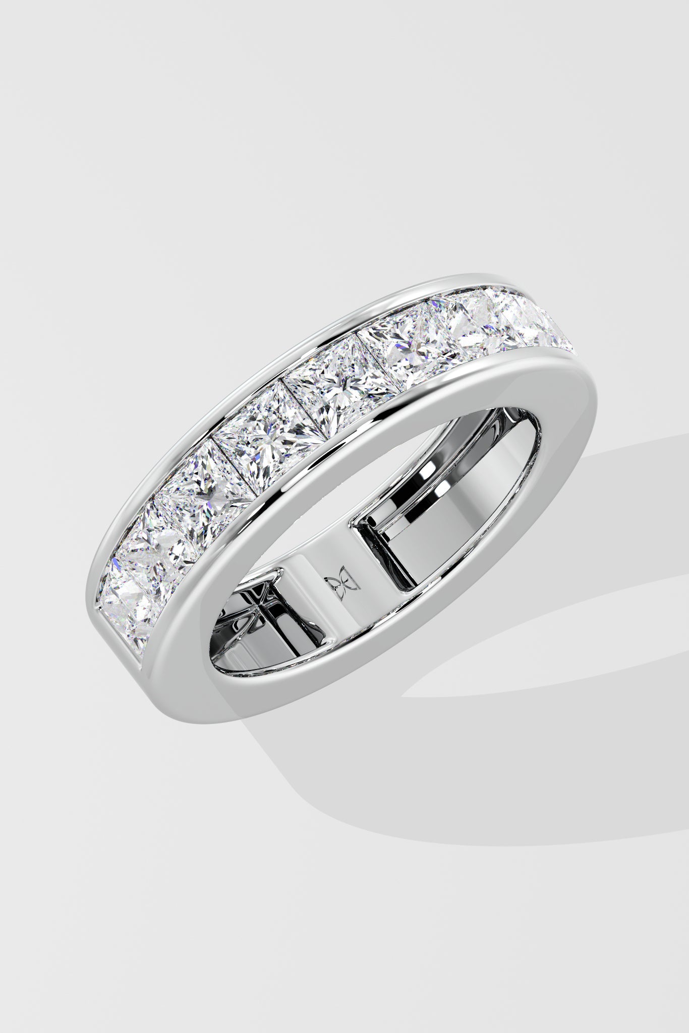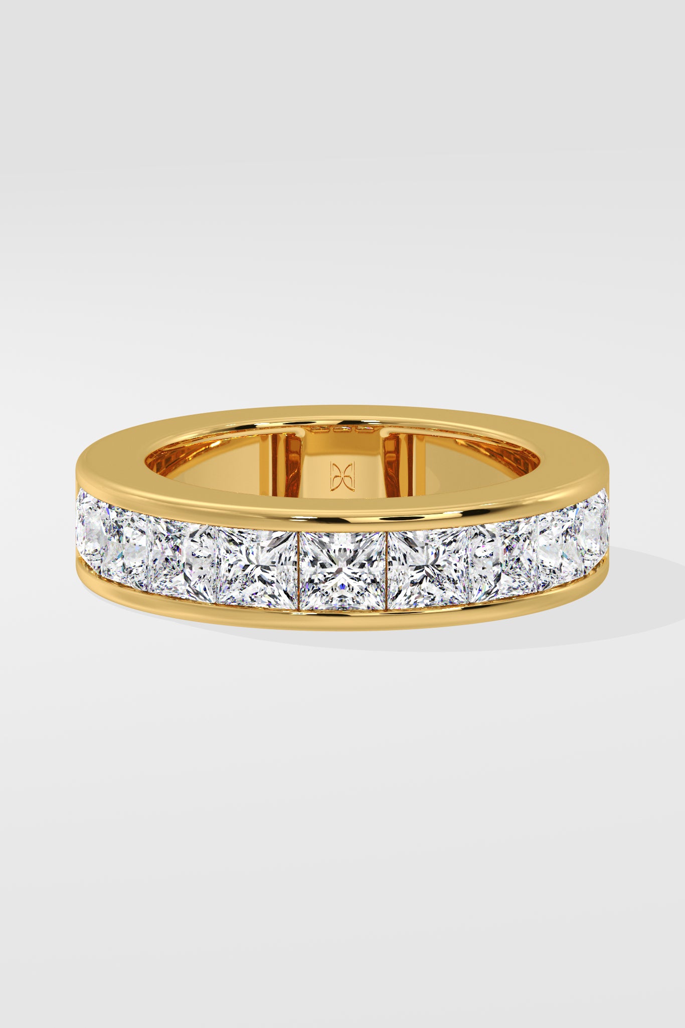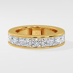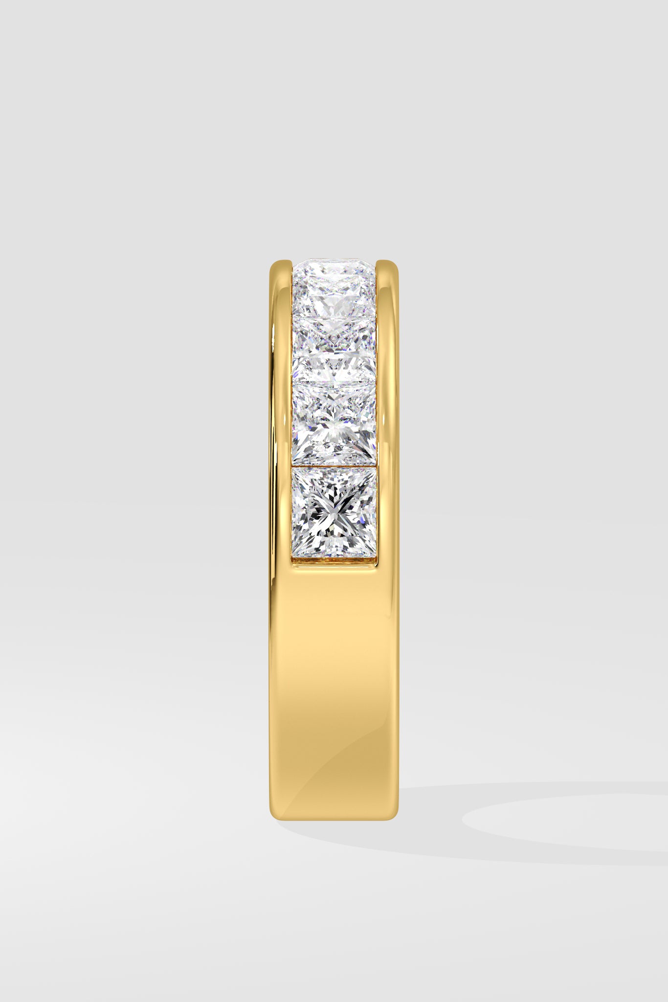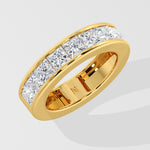 The Princess Channel Band features two sleek gold bands framing a central row of 0.30 Ct Princess-cut Diamonds, pavé set with precision. A classic, refined in form and finish.