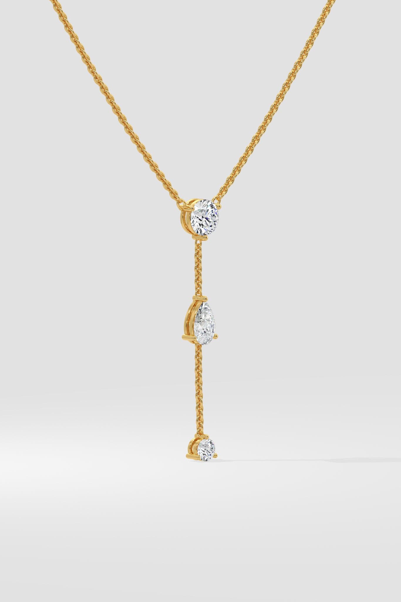 This elegant Lariat Necklace features a 1 Ct Round-cut diamond at its anchor, gracefully accented by a 0.75 Ct pear-shaped drop, and a 0.25 Ct round diamond tracing its fluid line. Designed to move with you, it combines modern sophistication with timeless elegance.