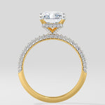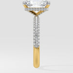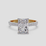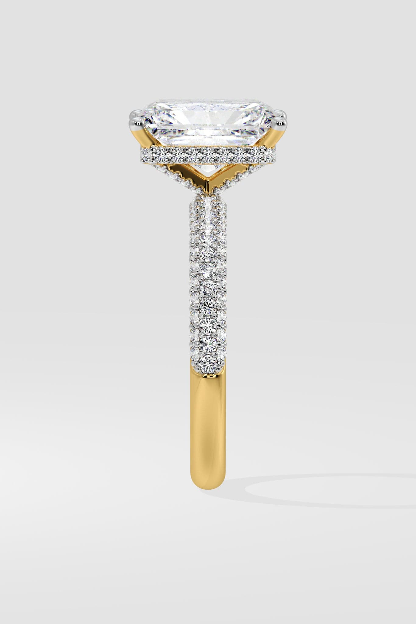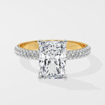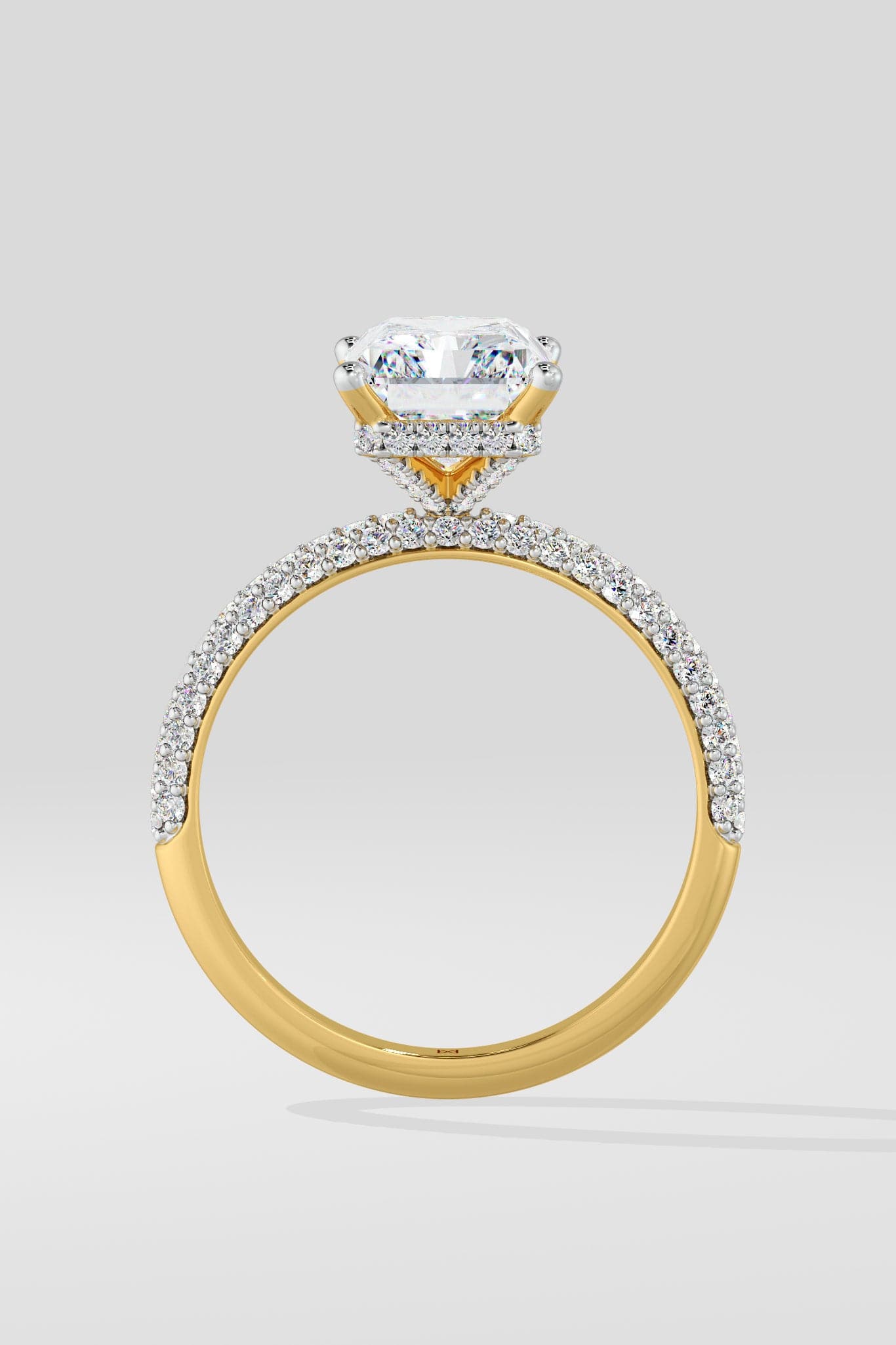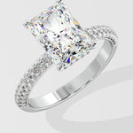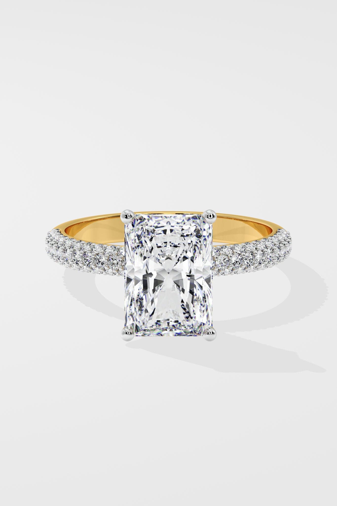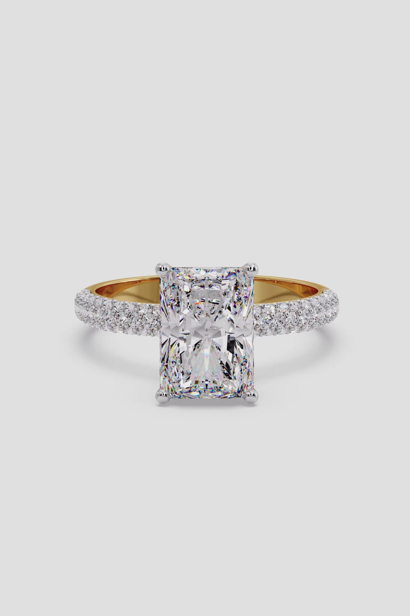 The 2.5 ct Lab Grown Reverie Radiant Ring features a radiant-cut diamond set on a pave band. The band has three rows of small diamonds in a pave setting that add that charming sparkle.