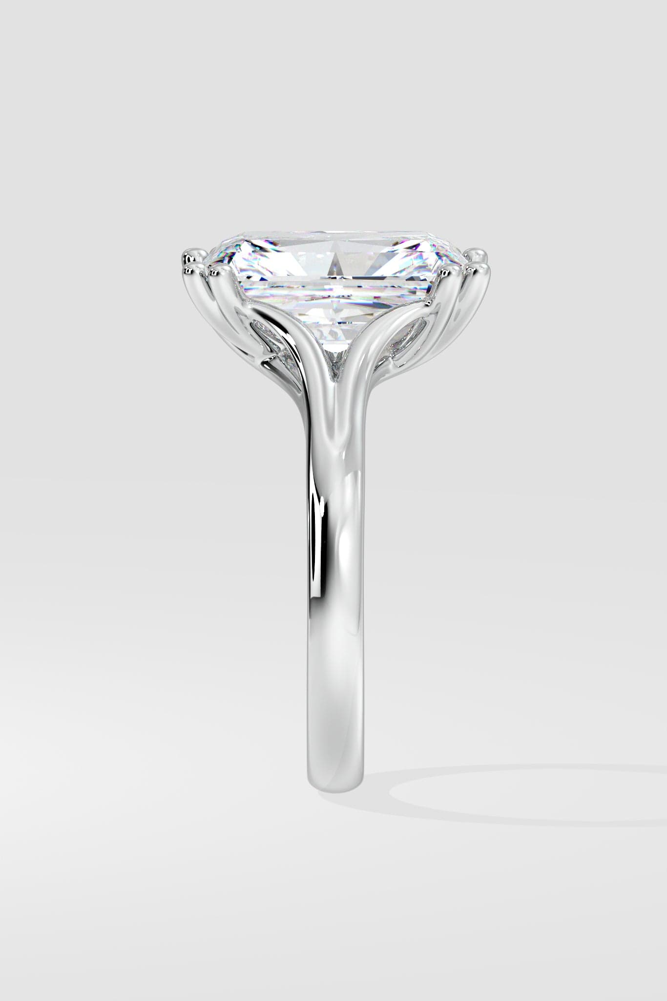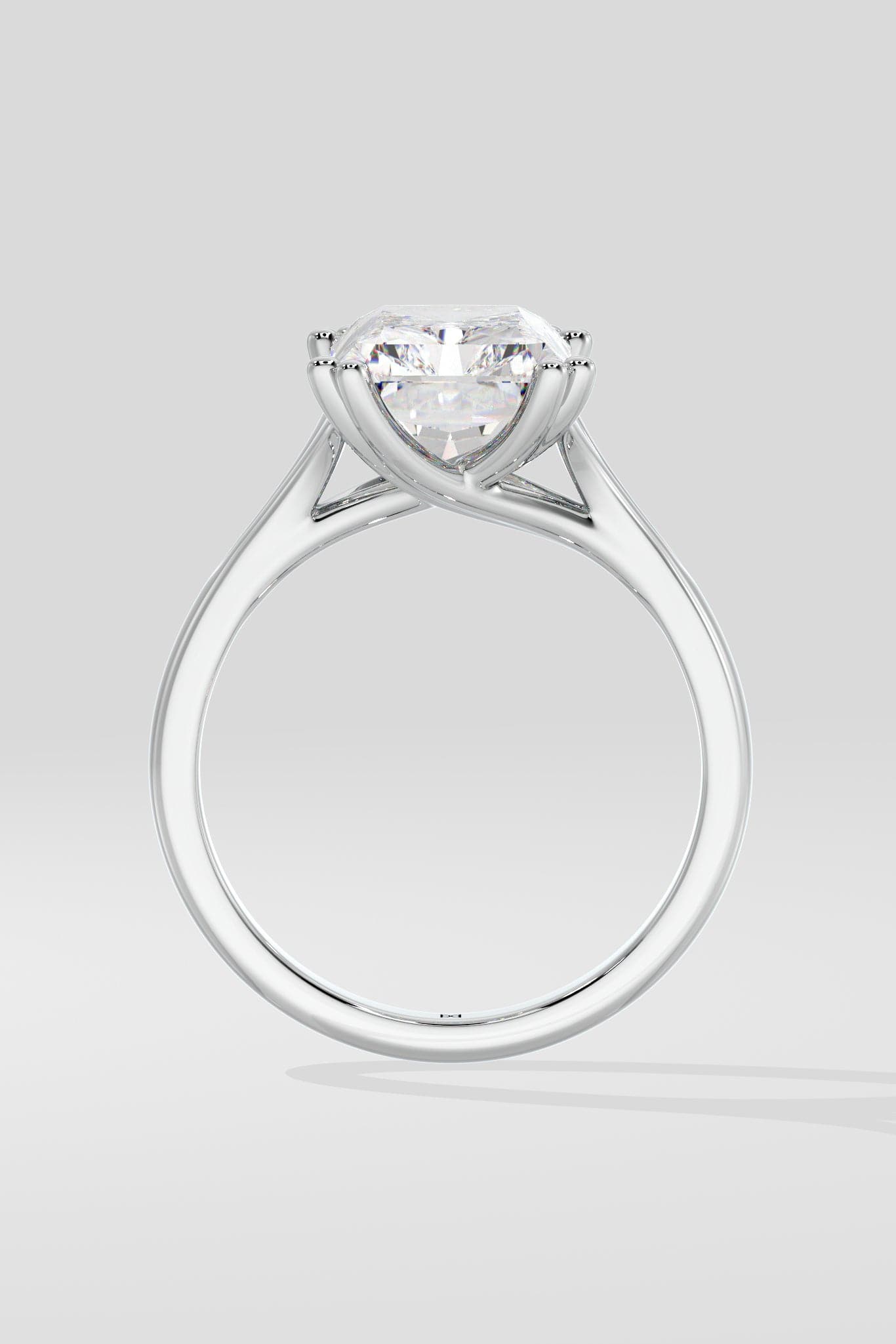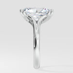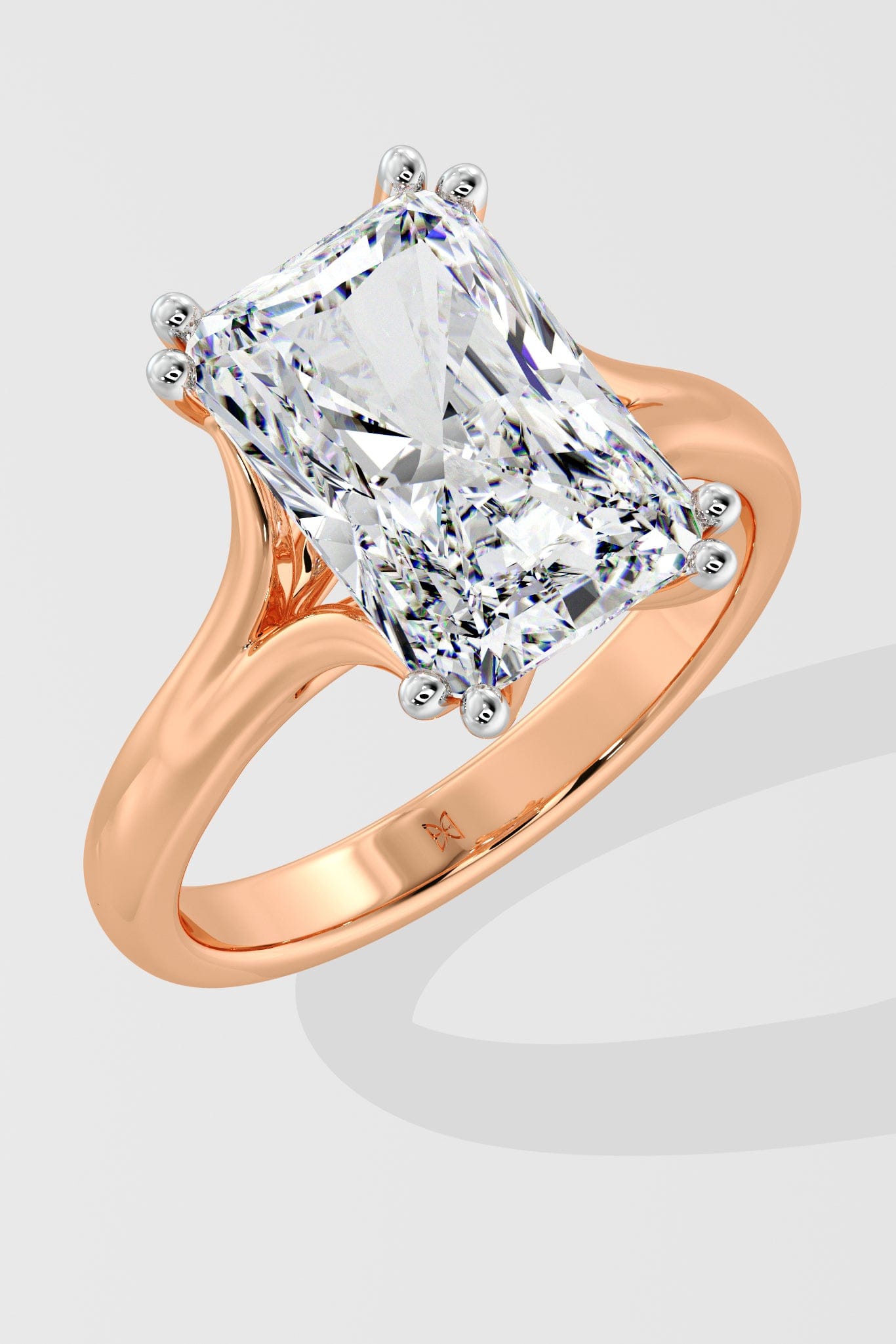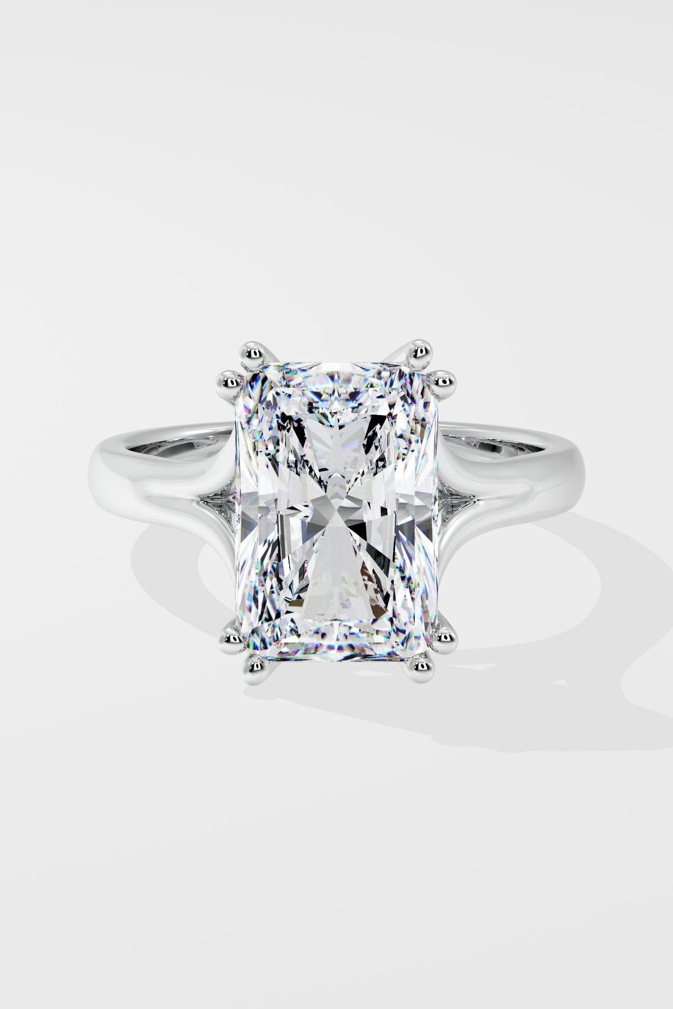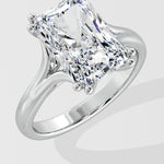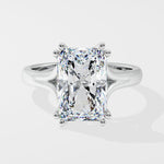 A bold 3.5 ct radiant-cut center diamond sits on the split shank band. The band's sleek curves offer a balanced contrast to the sharp edges of the radiant cut, creating a modern yet timeless silhouette. The double prongs add the detailed touch to complete the ring.