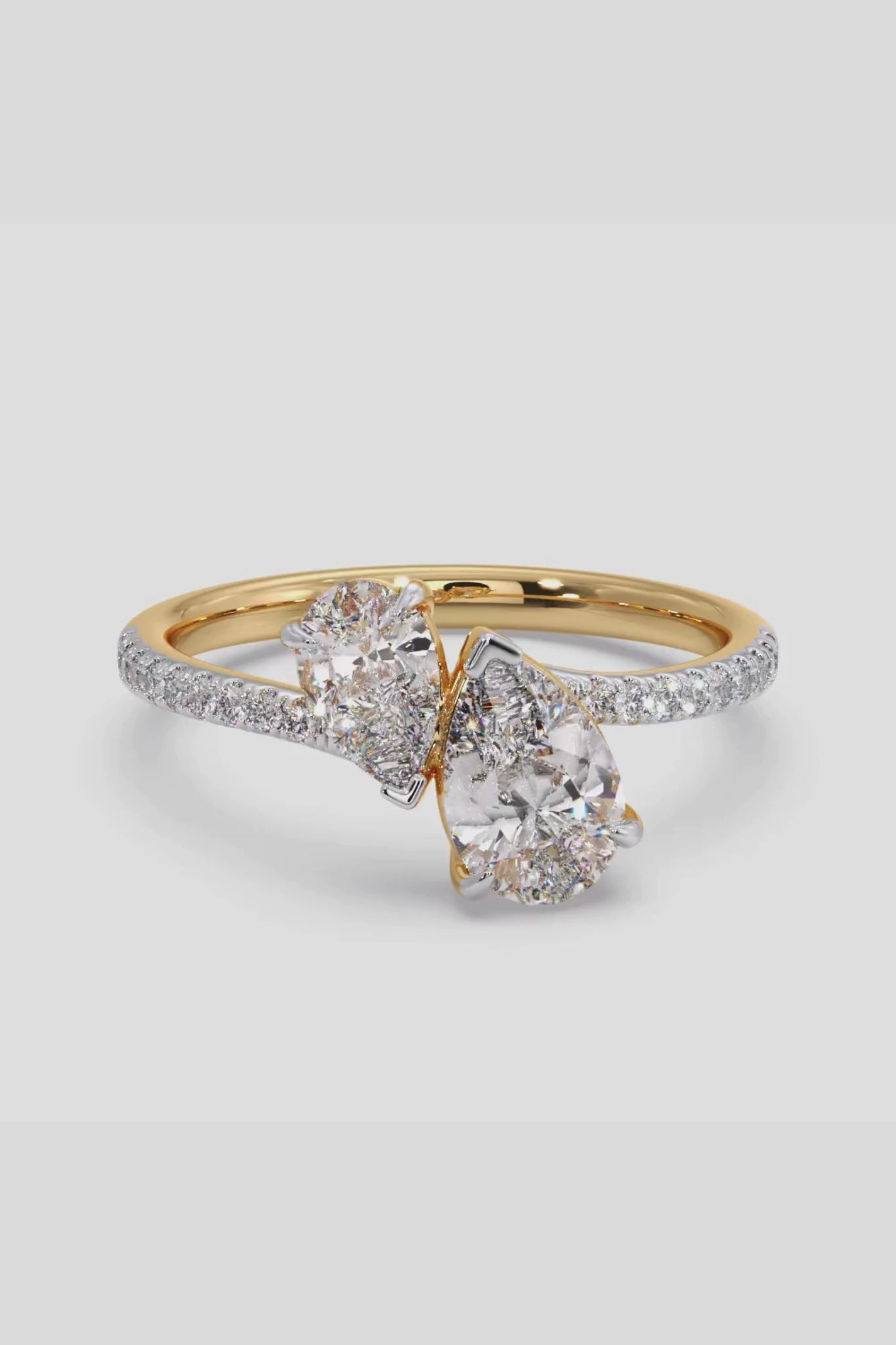 The Alternate Pear Solitaire Ring features a 1 ct Pear solitaire and a 1/2 ct set opposite to each other. Keeping up with the 2 stone trend, this ring is elegant yet bold.