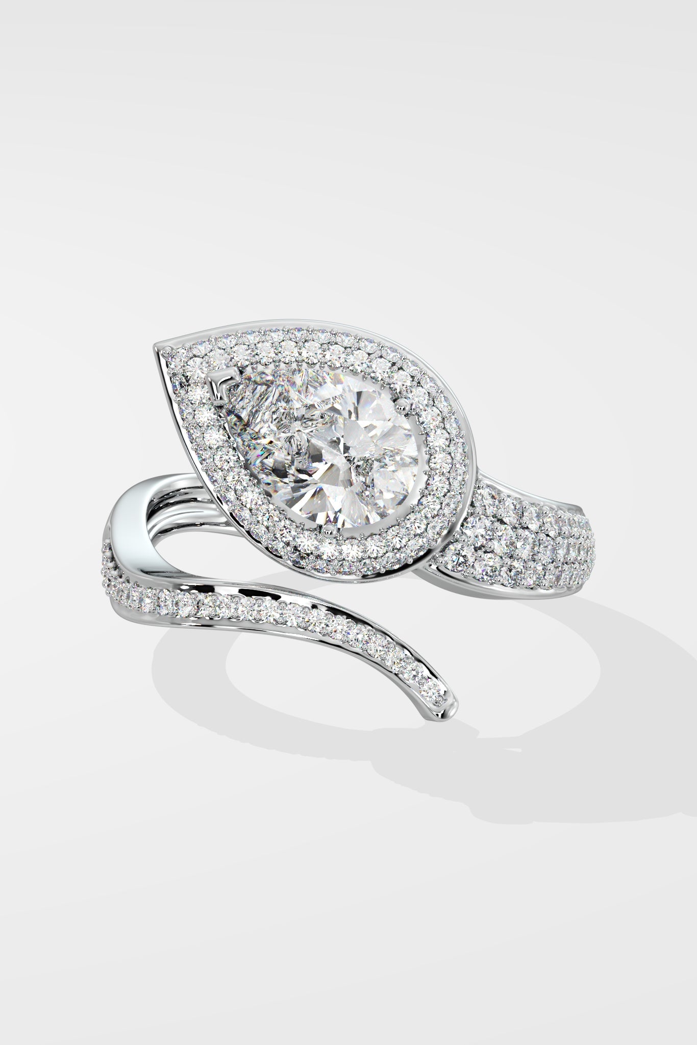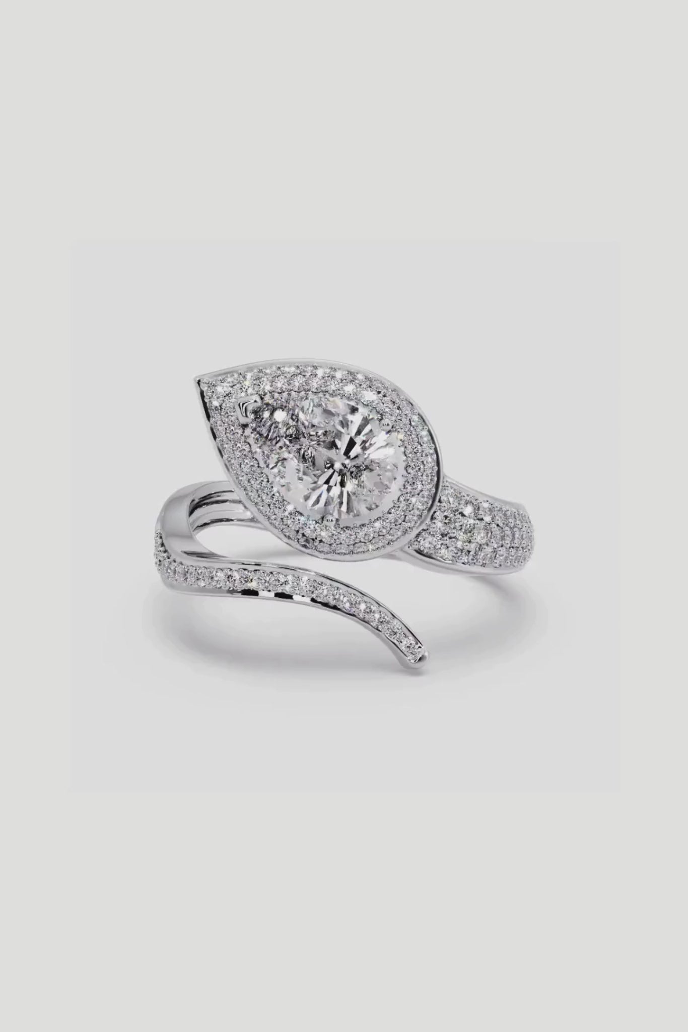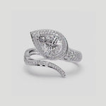 The Ellipses Ring features a stunning 1 ct angular pear-shaped solitaire with a halo. The Pear shaped diamond offers more spread for the same carat wt. The asymmetrical fully diamond-encrusted shank completes this bold and contemporary design.