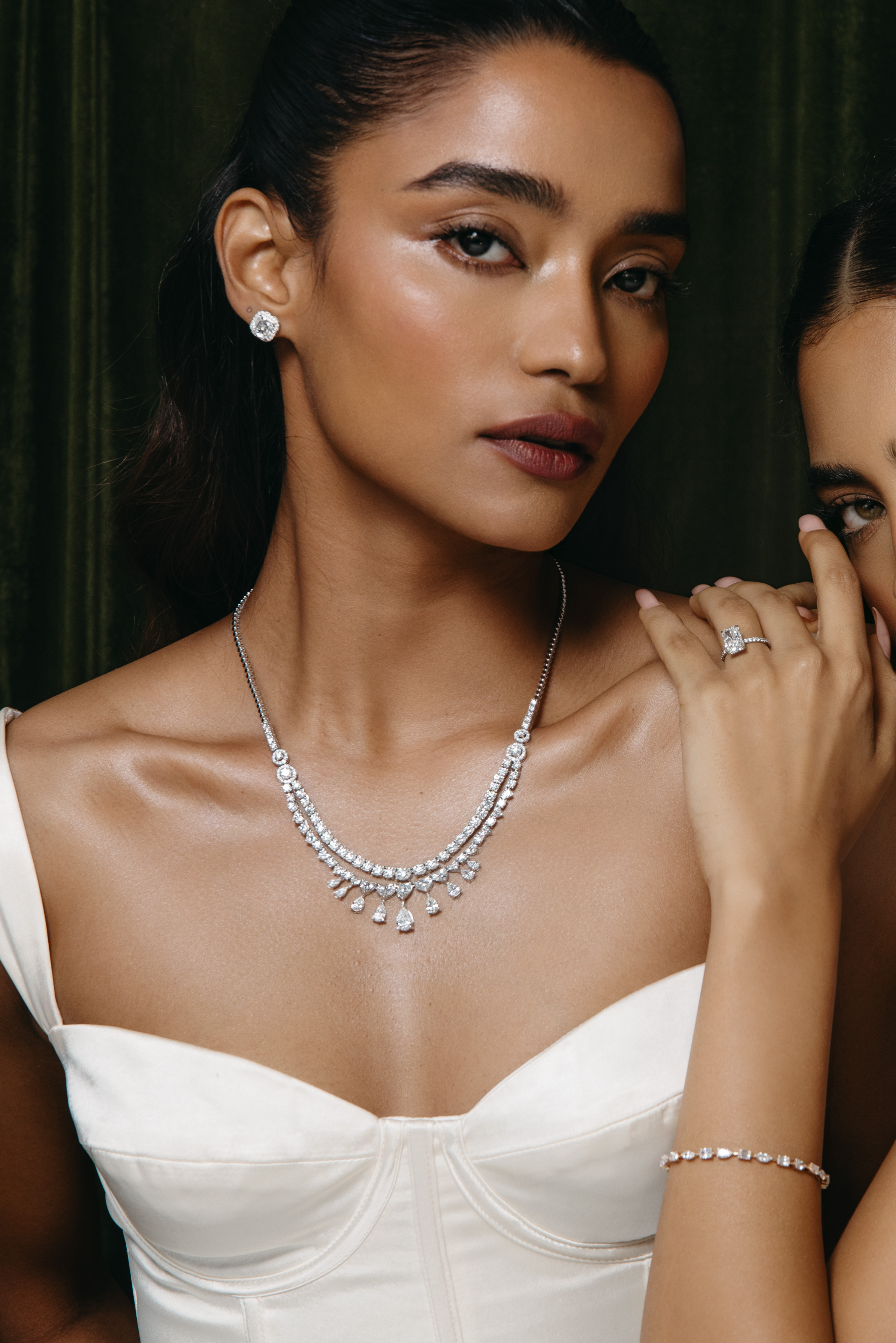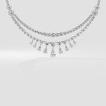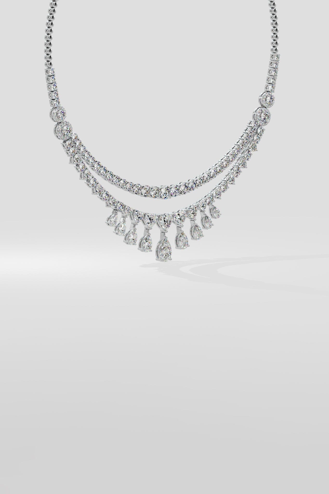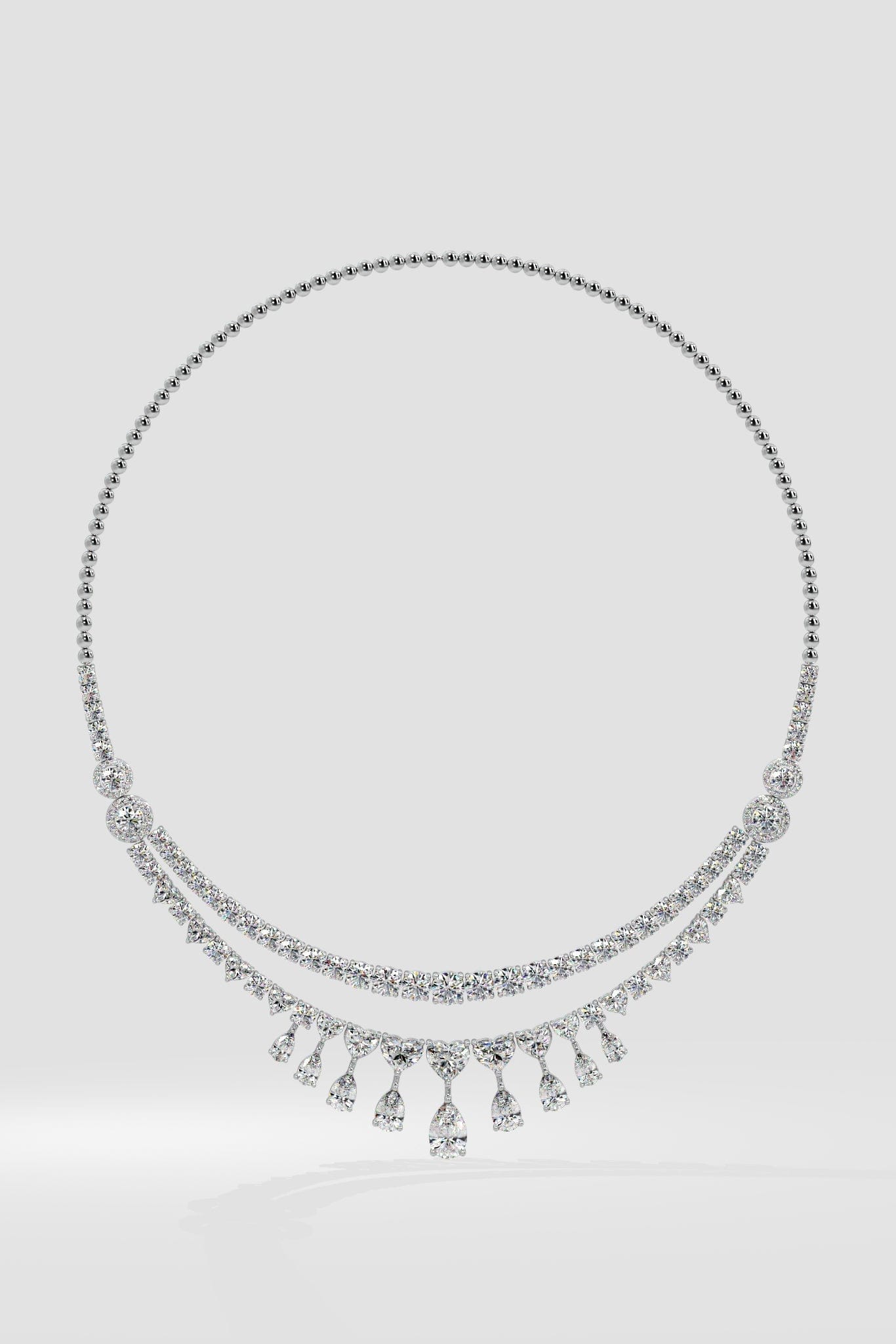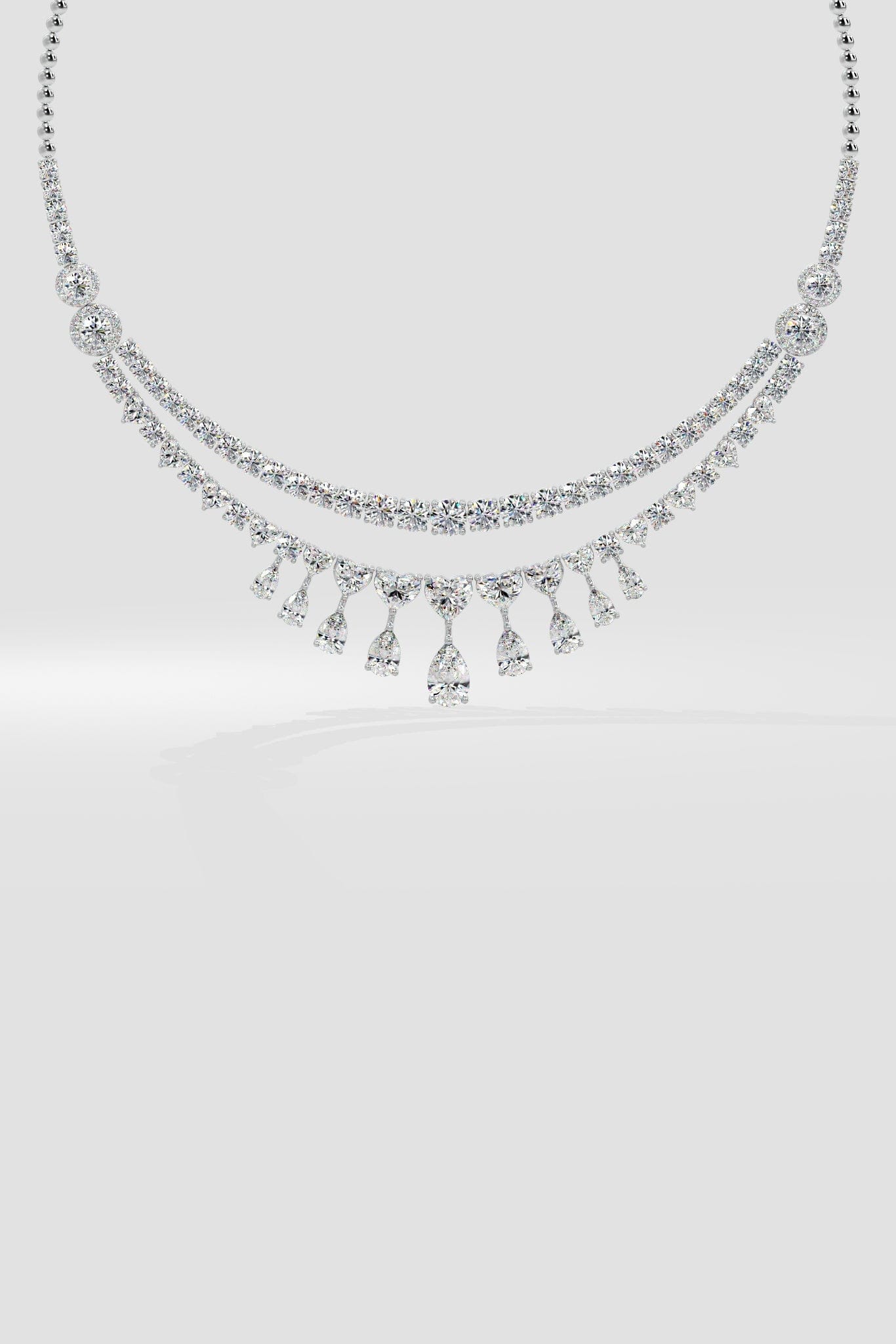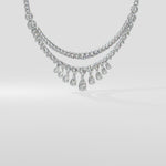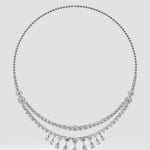 The Amirah necklace is a breathtaking union of Hearts and Pears. The top row is classic round brilliants, followed by perfectly sized graduating hearts. Beautifully sitting at the base are the pears; starting with a 1 ct diamond at the centre, the 9 diamonds fan out. Perfectly balanced, and idefinitely mesmerising, this necklace is a timless keepsake.
