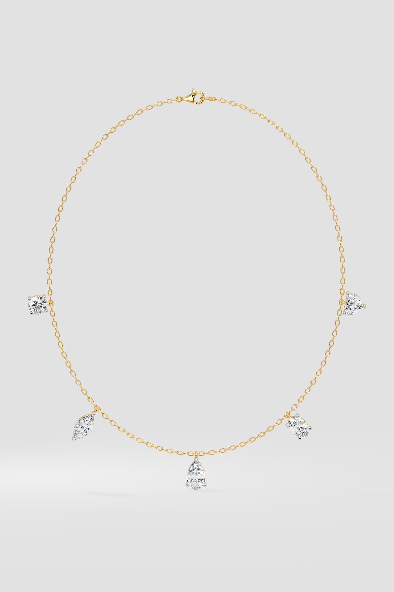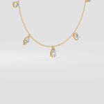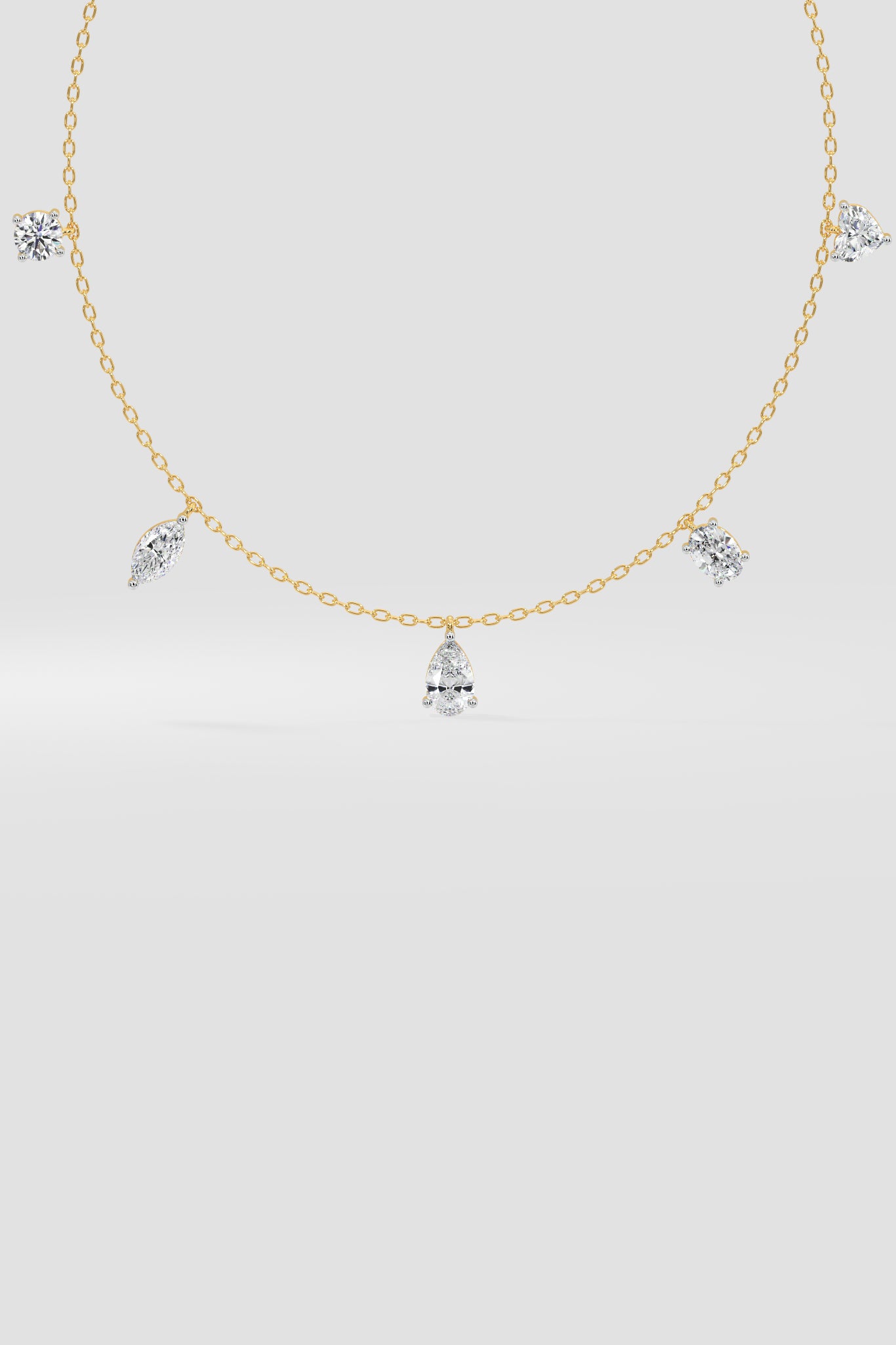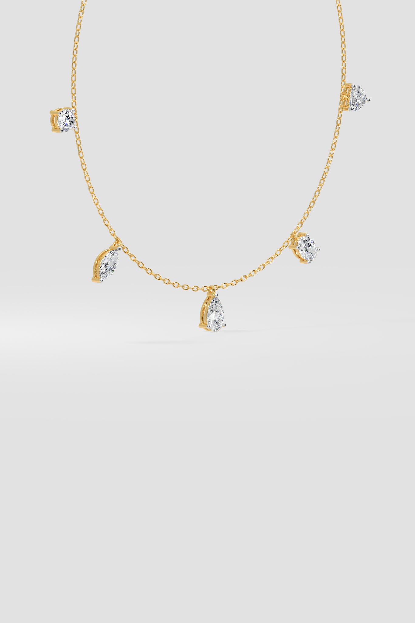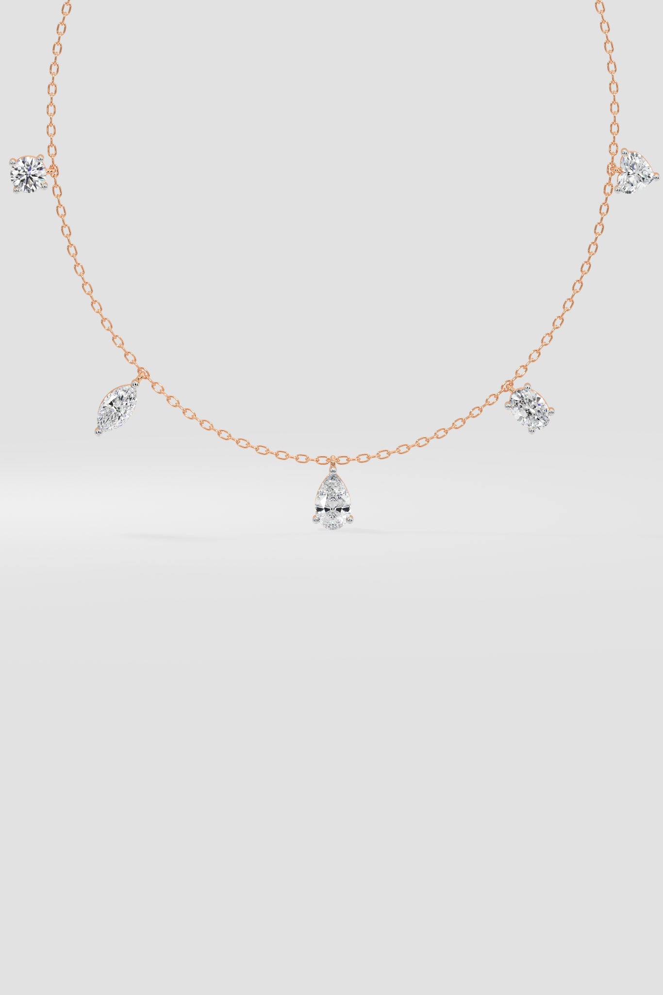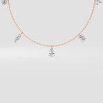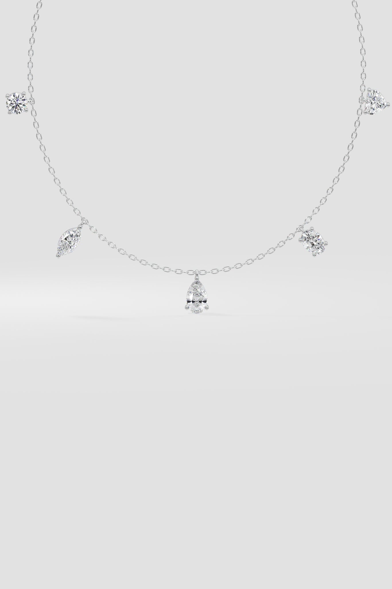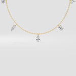 The Askew Trinklet Necklace is an ode to the many sides of you. It features a 1 Ct Pear at the centre, and 0.75 Ct mixed cuts throughout. Each distinct shape reflects a different facet of your personality, coming together in a way that feels beautifully honest. Askew by design, it reminds you that your uniqueness is meant to be worn, lived, and seen.