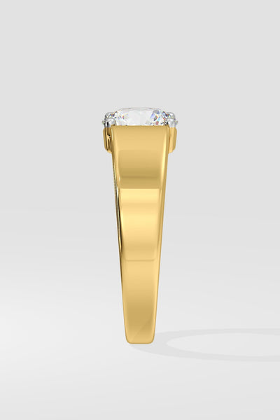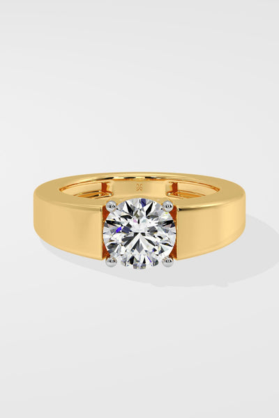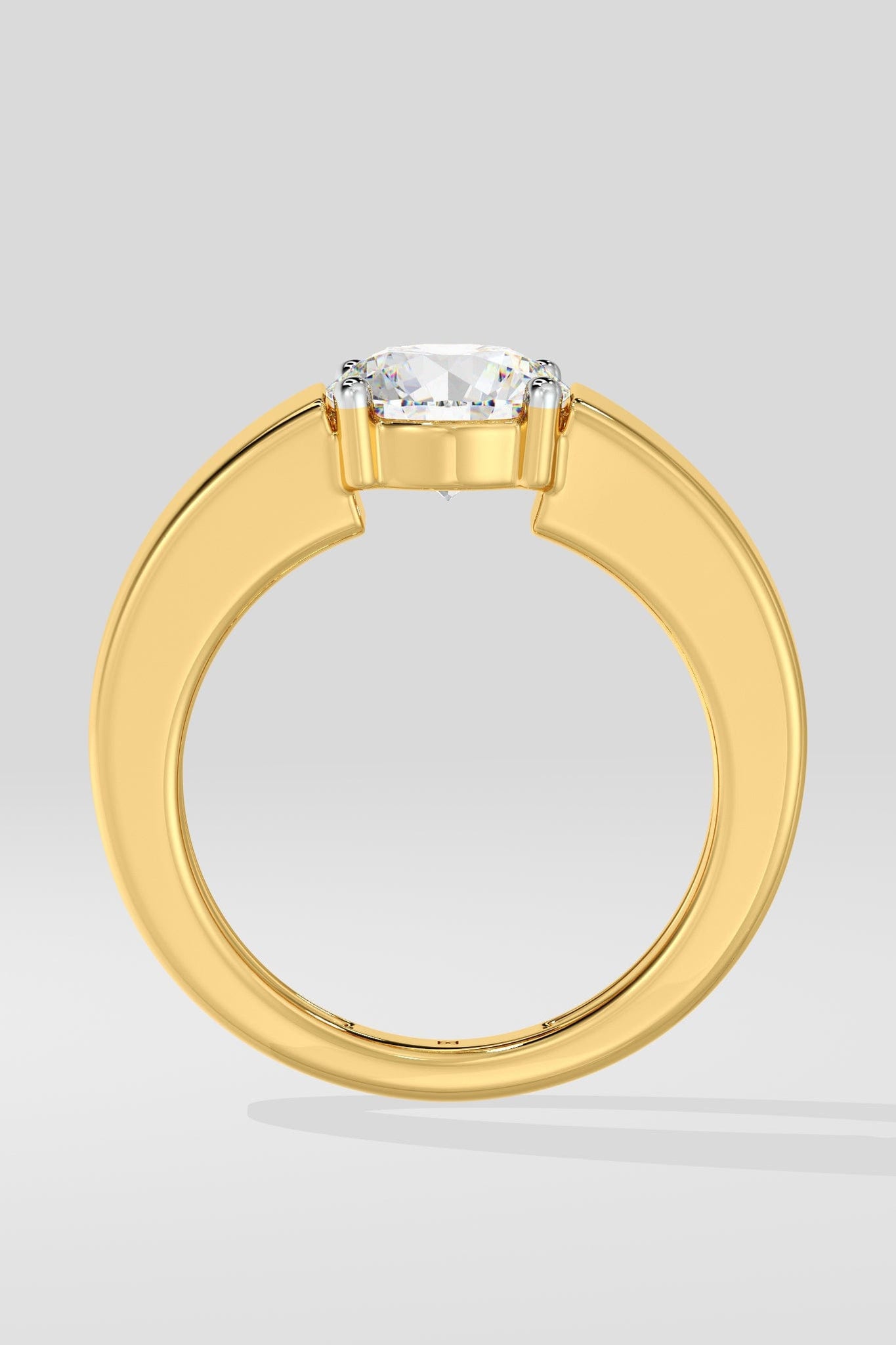 This Bar Set Solitaire Ring is a timeless classic, featuring a round 1.5 ct center diamond held securely between two sleek metal bars. The band is wide and durable, making it an ideal choice for everyday wear.