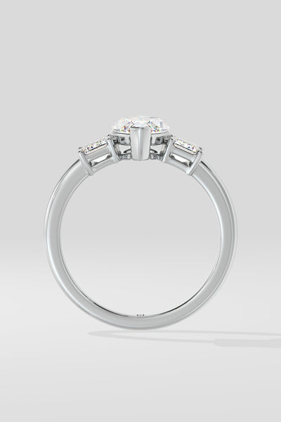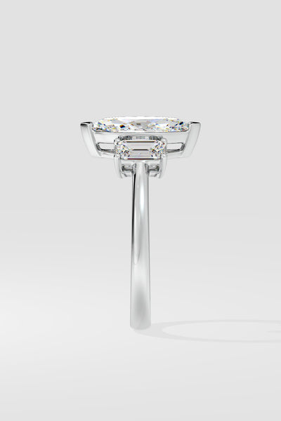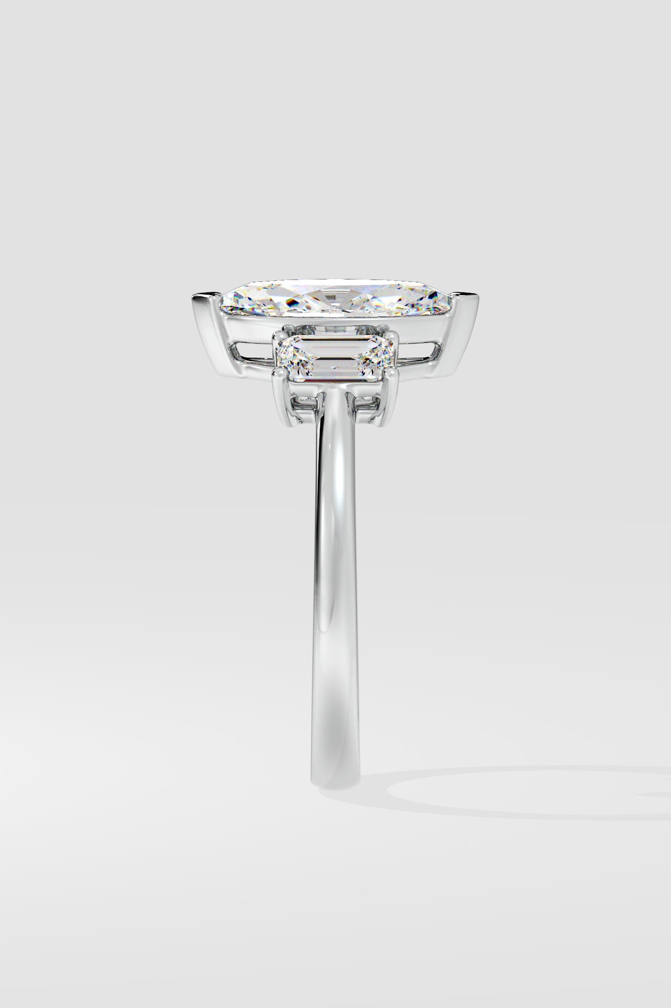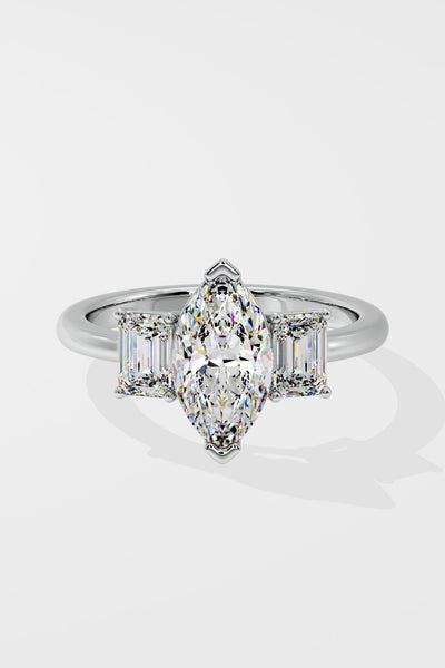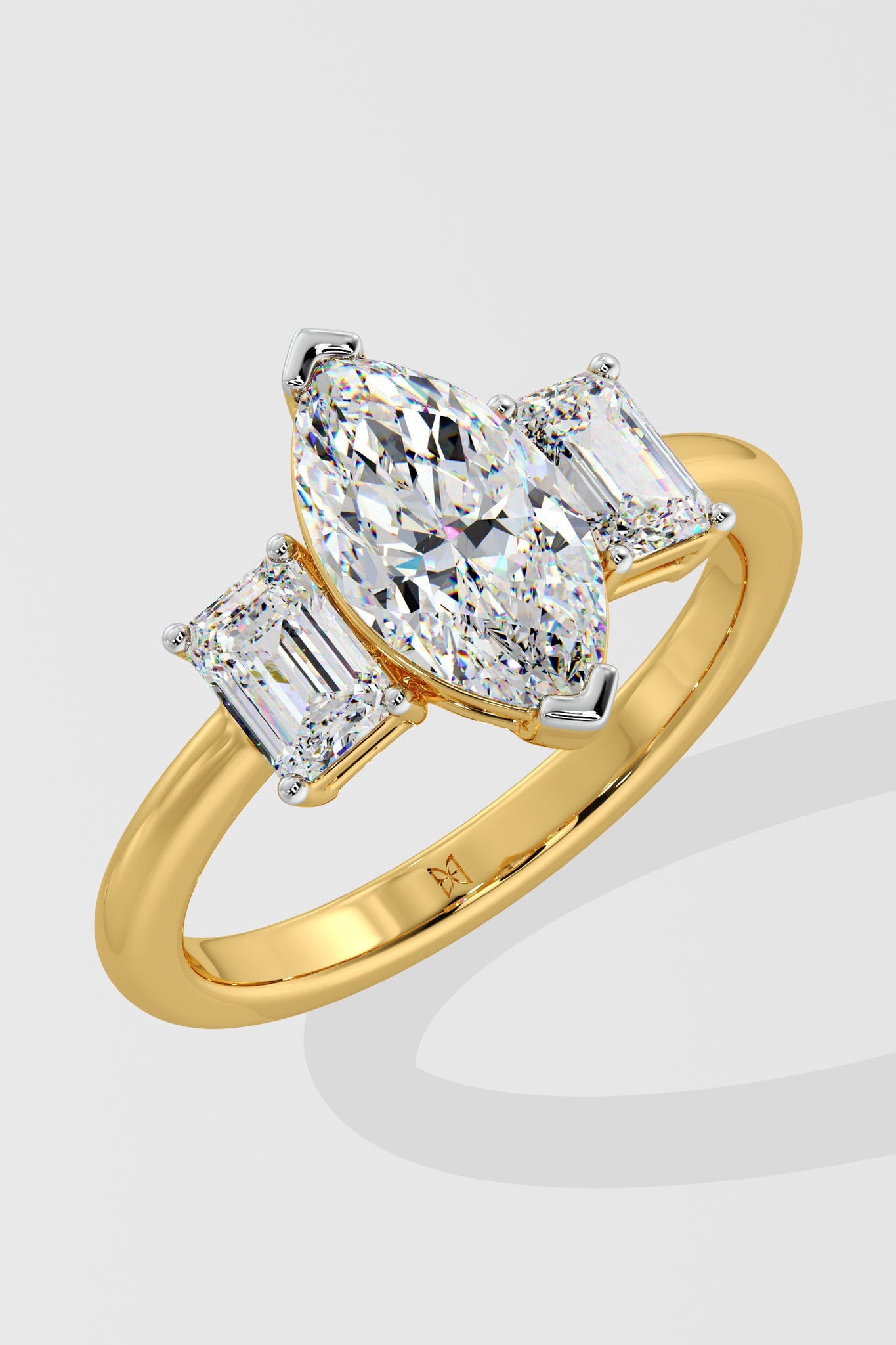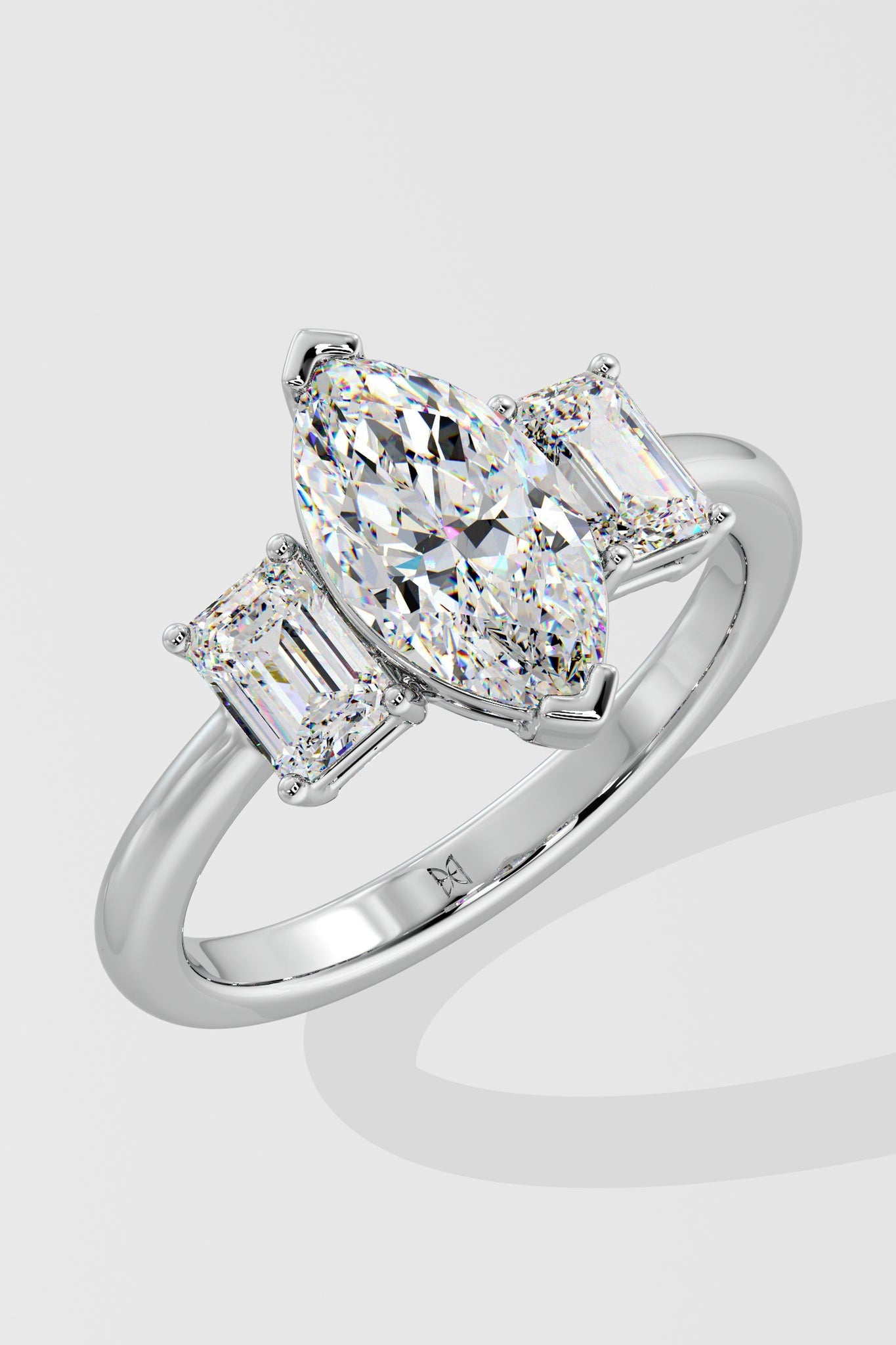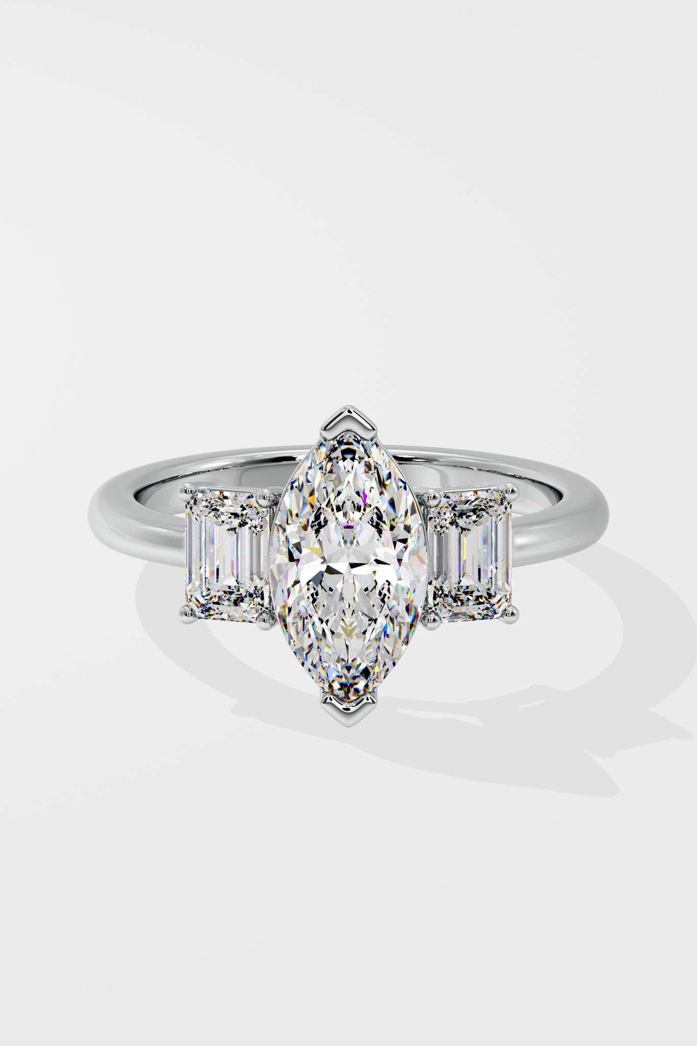 Lab Grown Diamond Trio Ring features a striking 1 carat Marquise-cut Diamond flanked by two Emerald-cut Diamonds, creating a harmonious trio of brilliance. Edgy, experimental, and out of the box.