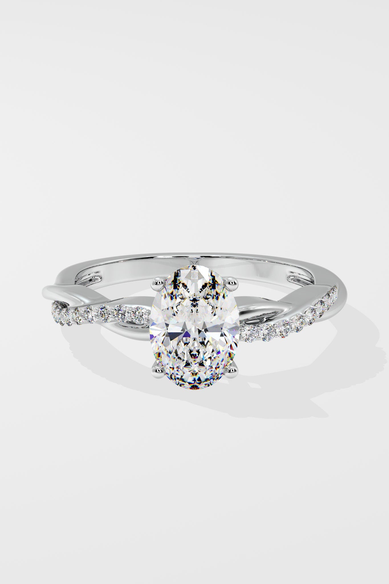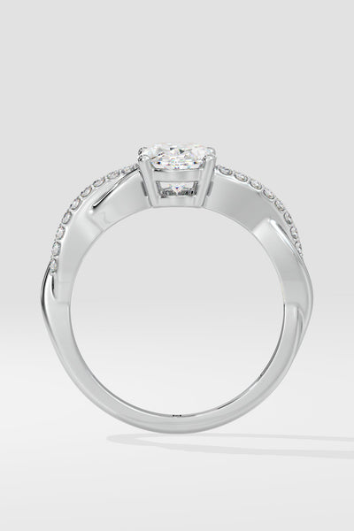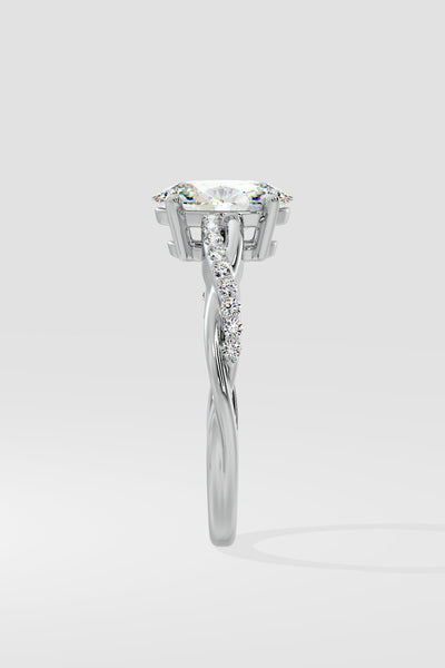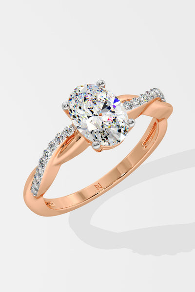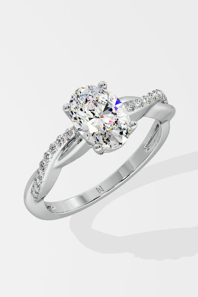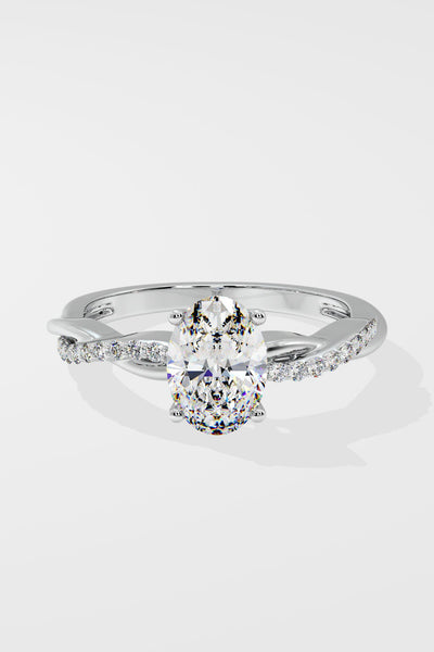The Oval Infinity Ring features a 1.5 ct set on a twisted band, blending sleek metal with diamond accents. Its design mimics a beautifully wrapped ribbon, adding a unique touch to this timeless piece.