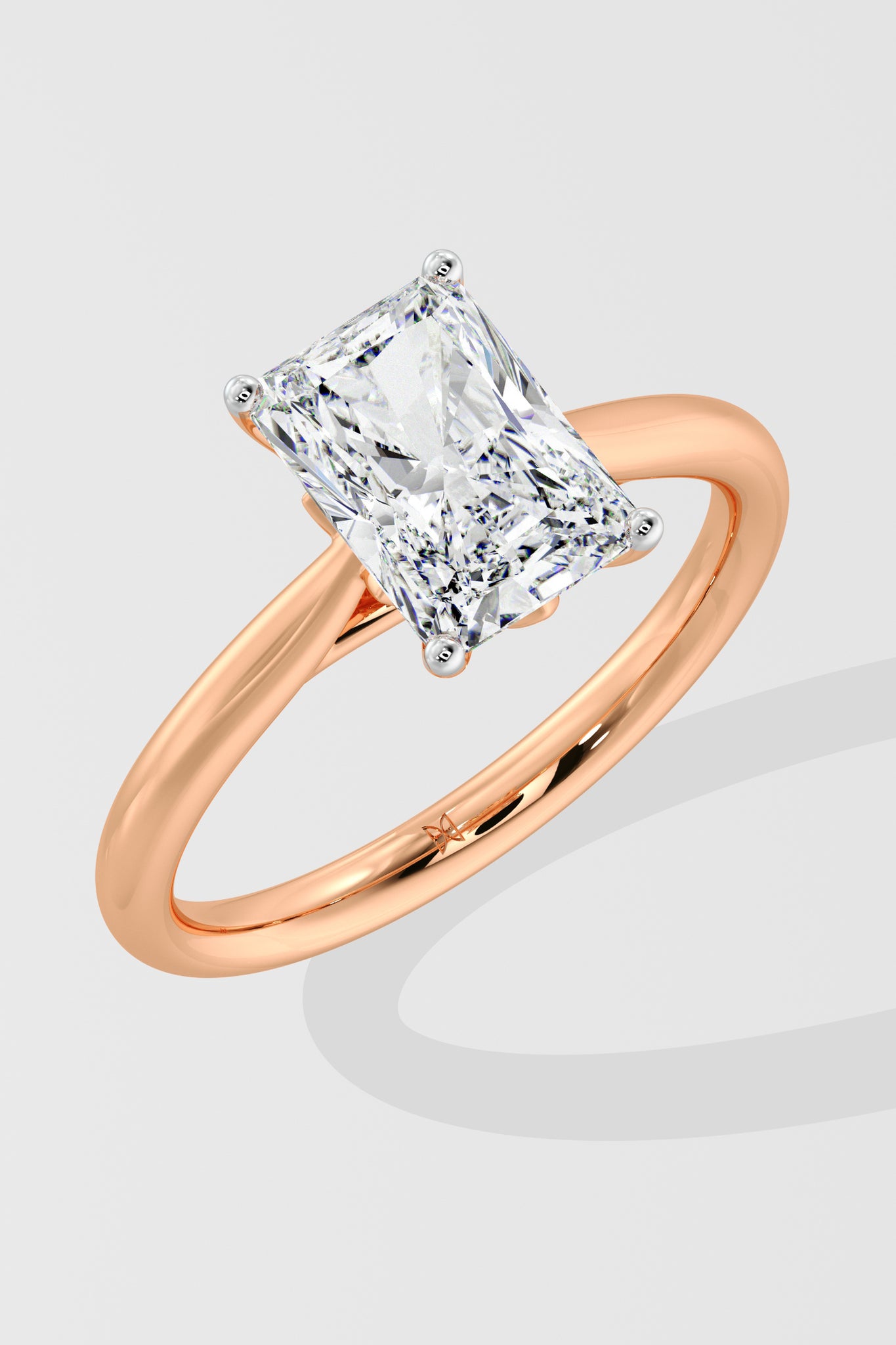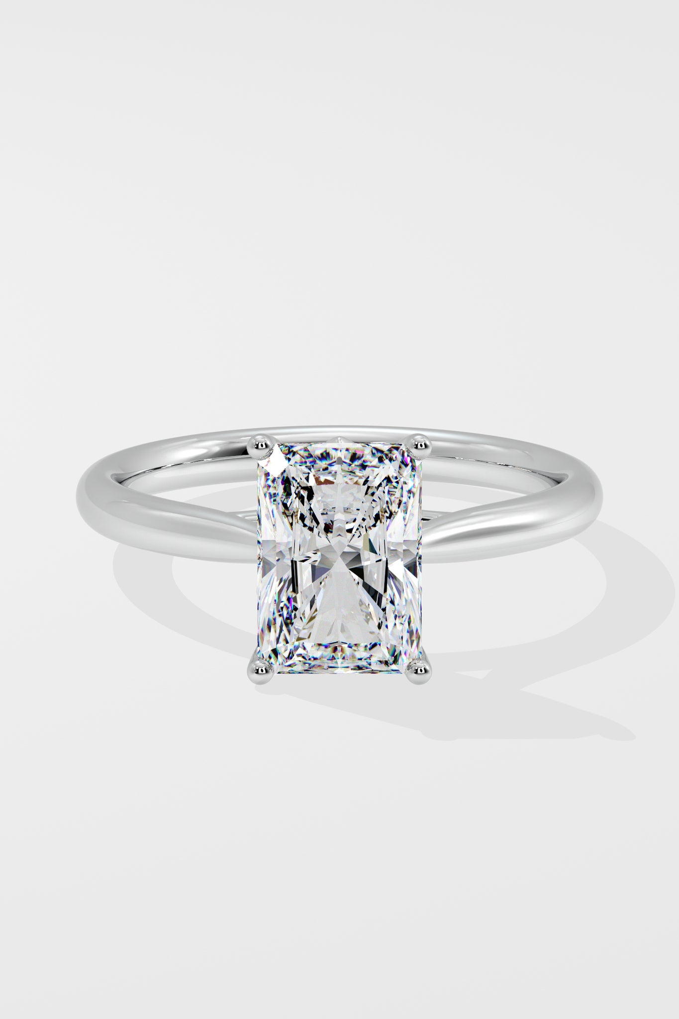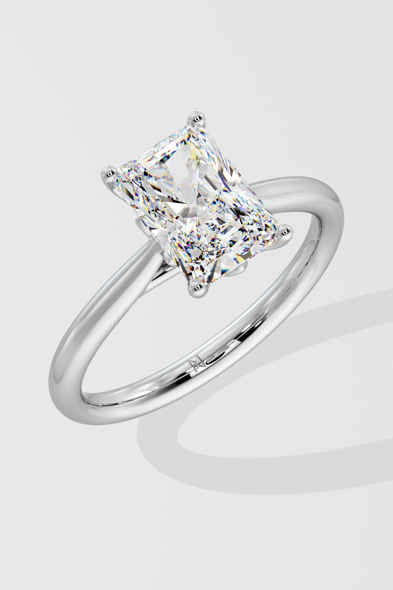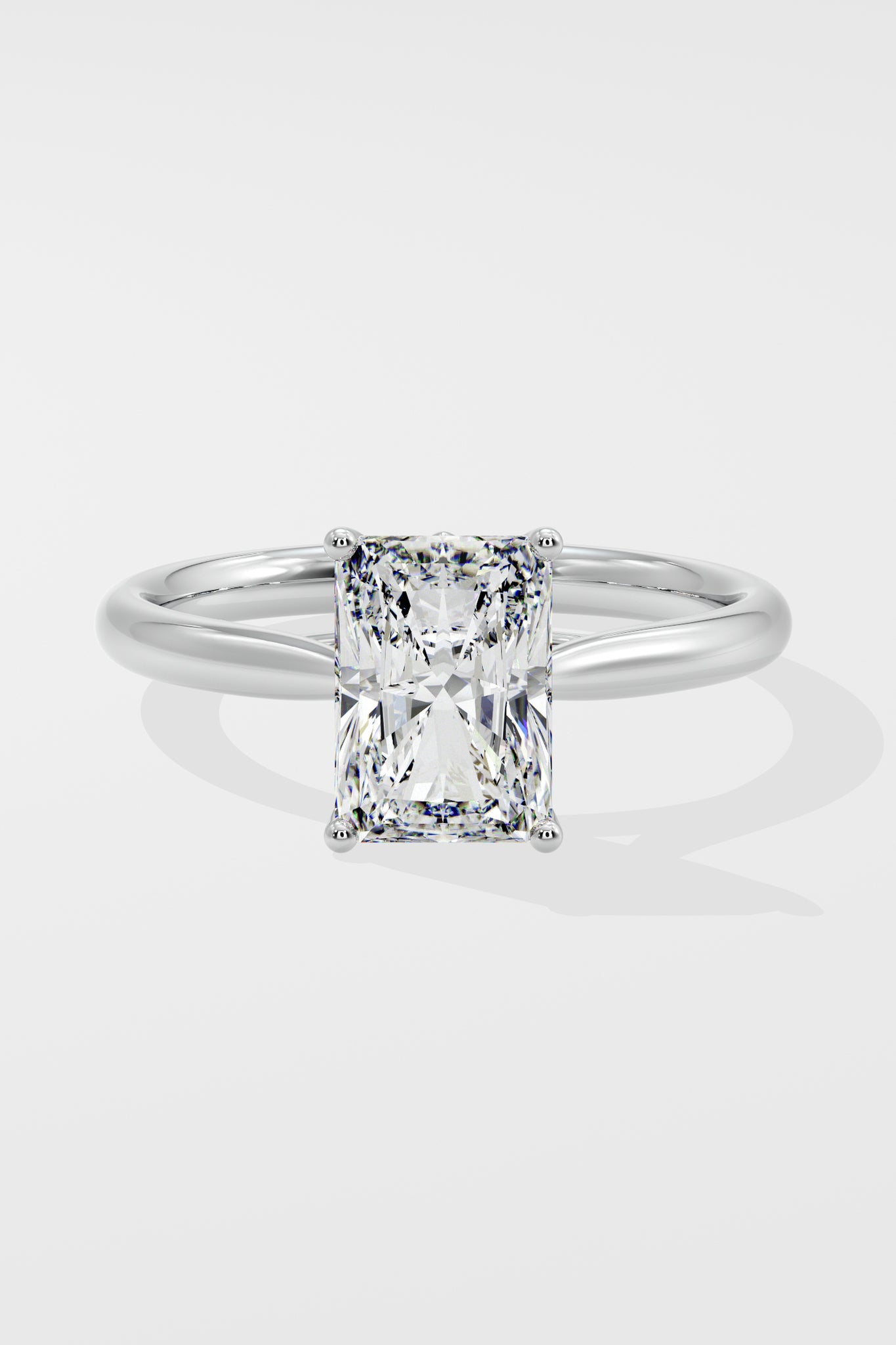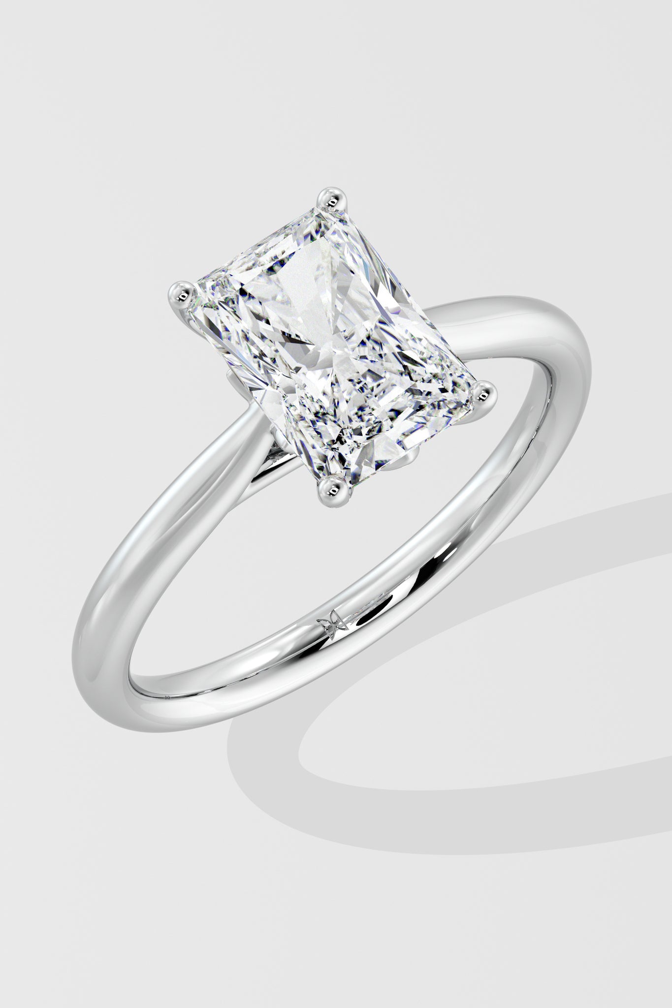 Lab Grown Diamond Solitaire Ring features a 1.5 ct single perfect Radiant Cut diamond. Due to the number of facets, the Radiant sparkles more than the Emerald cut.