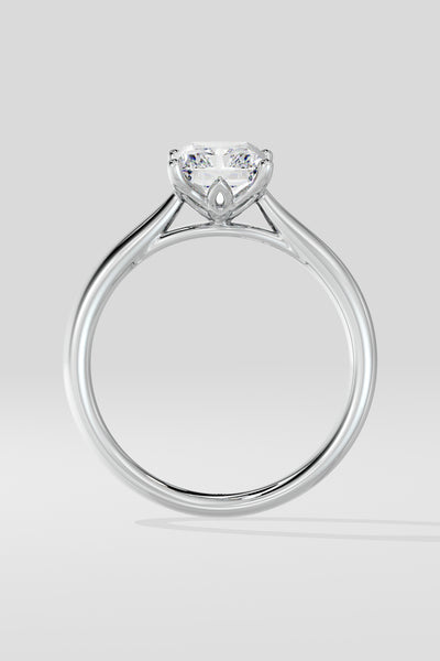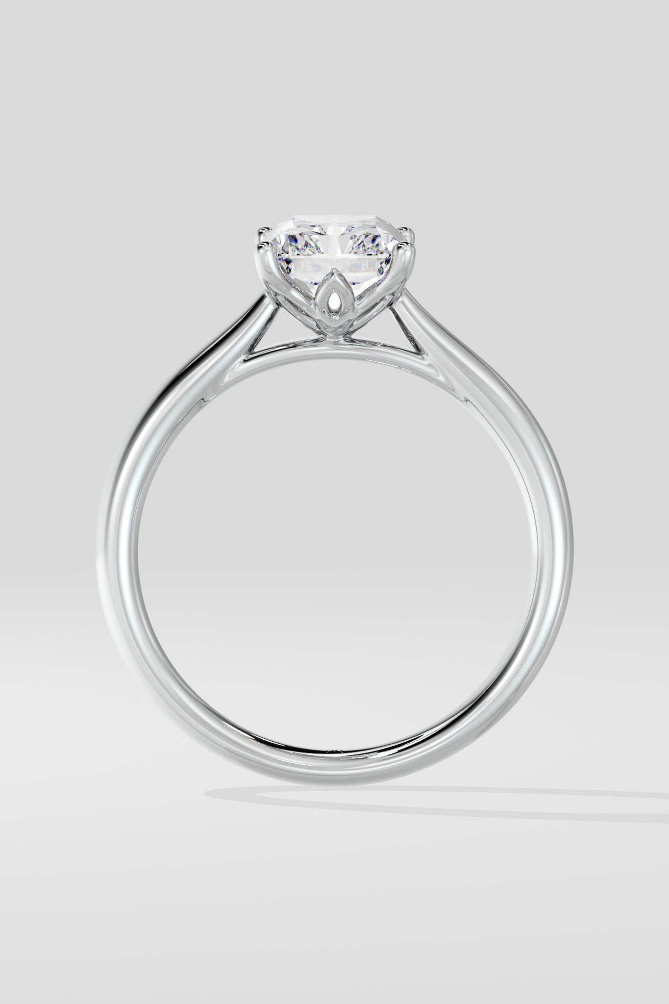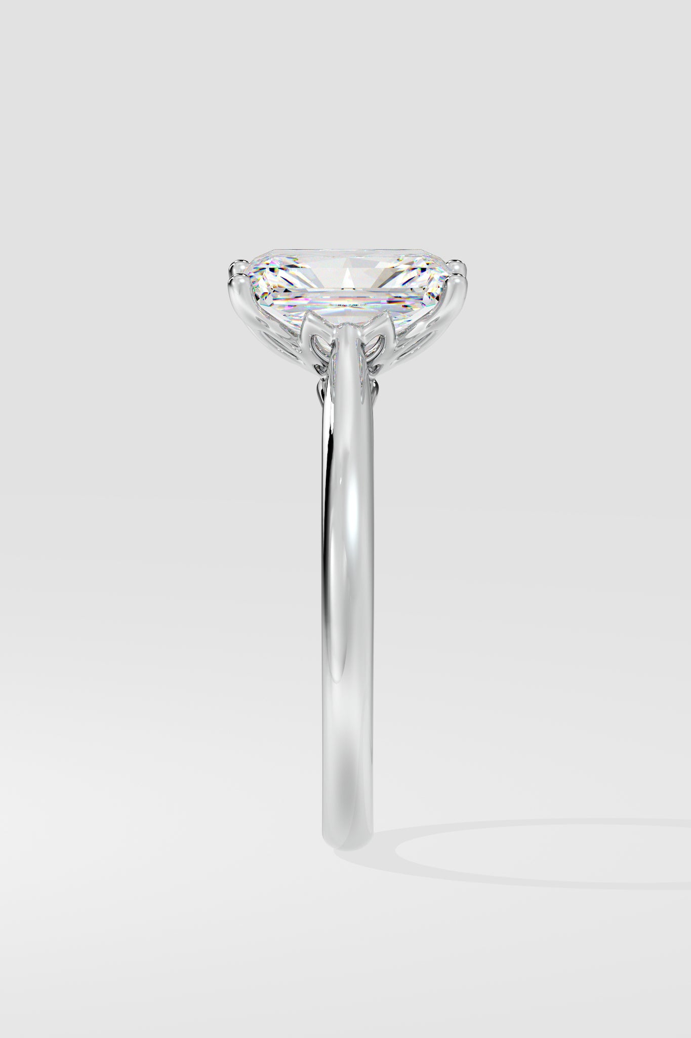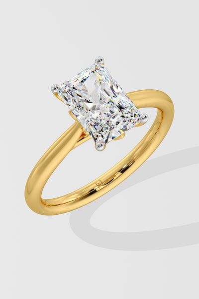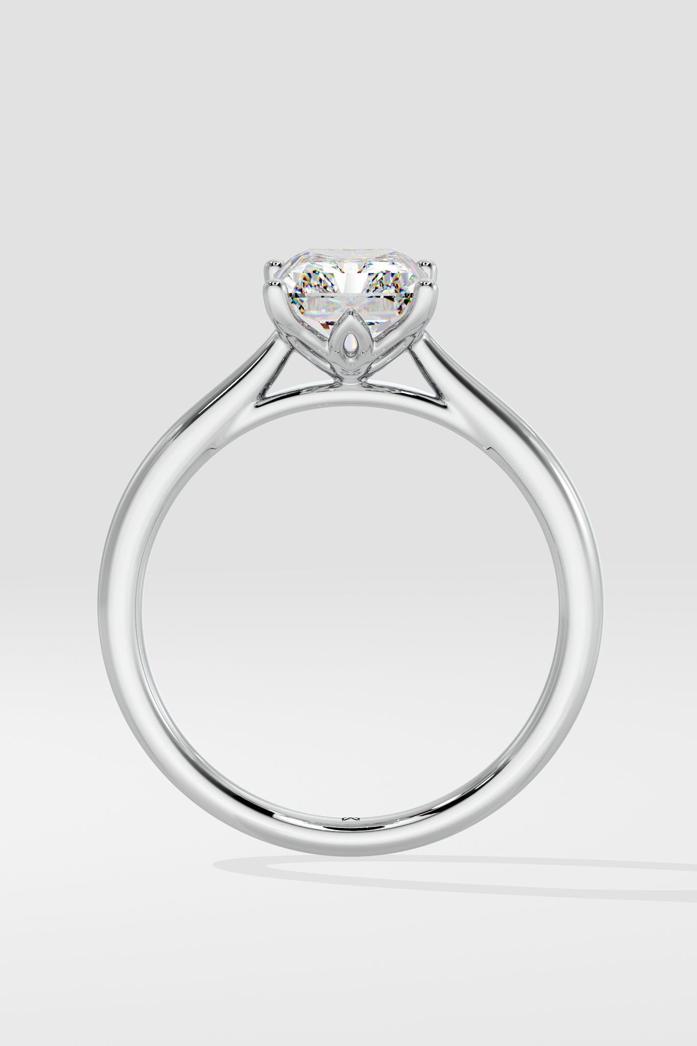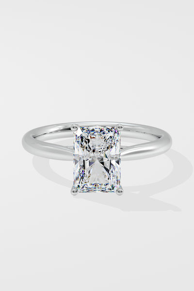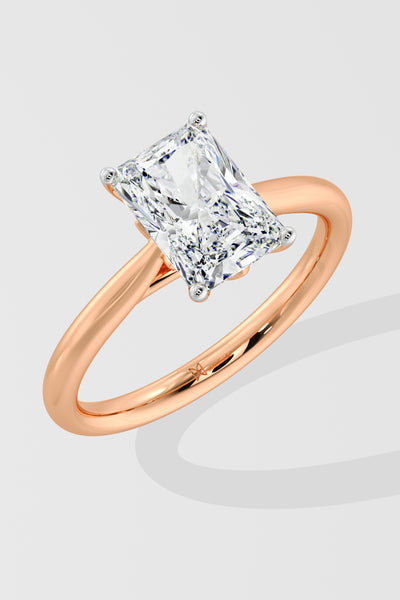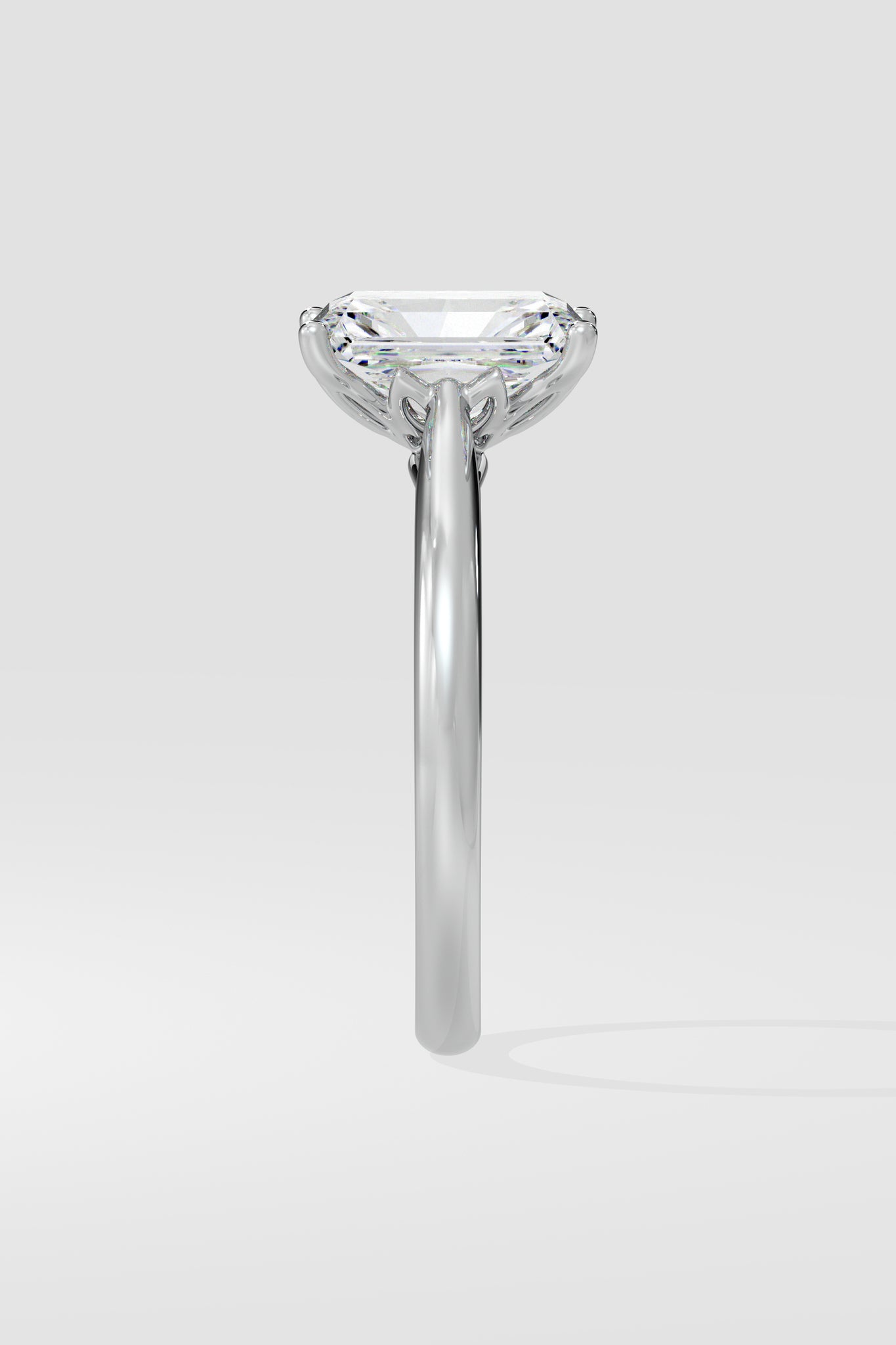 Lab Grown Diamond Solitaire Ring features a 1.5 ct single perfect Radiant Cut diamond. Due to the number of facets, the Radiant sparkles more than the Emerald cut.