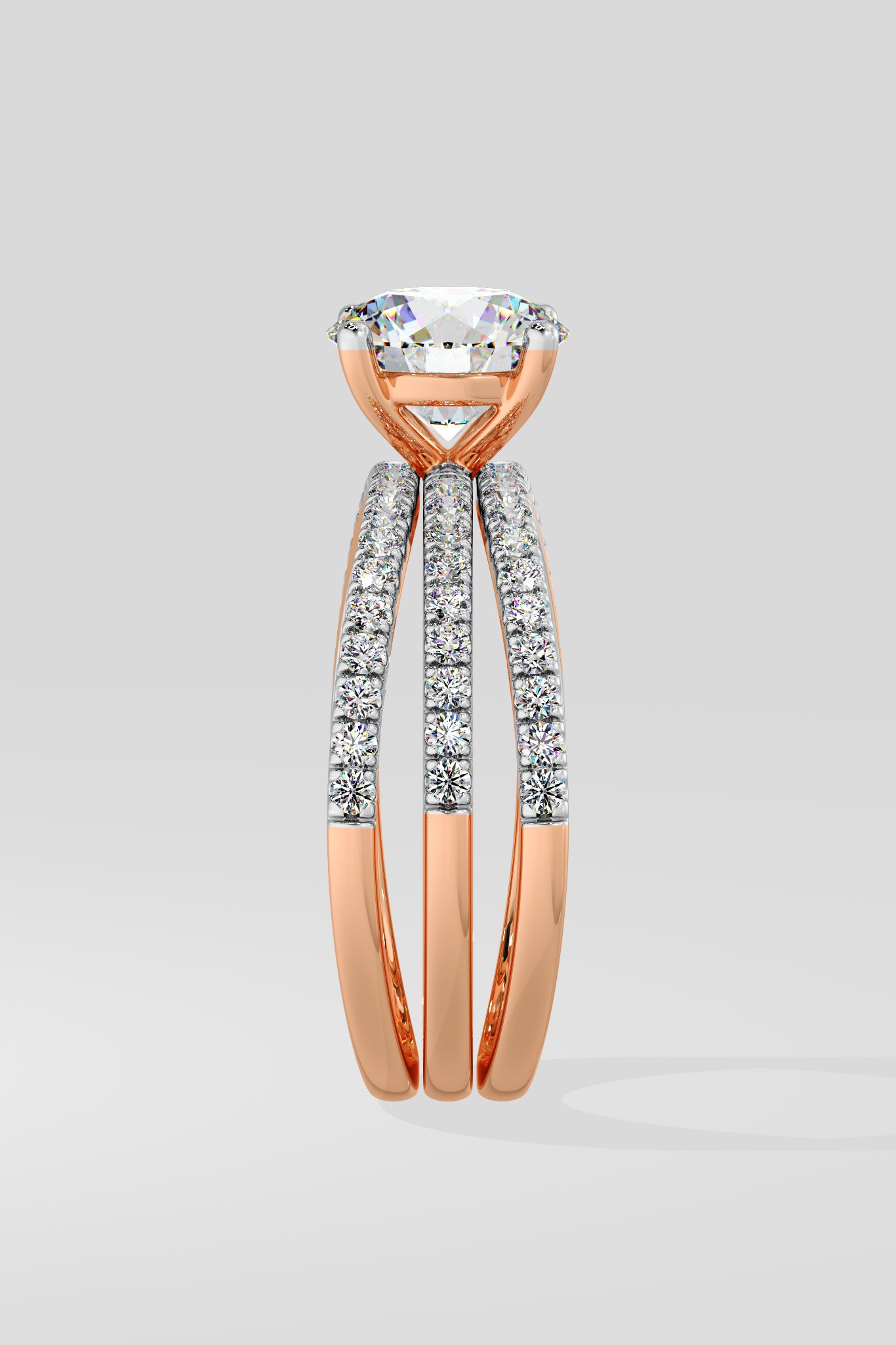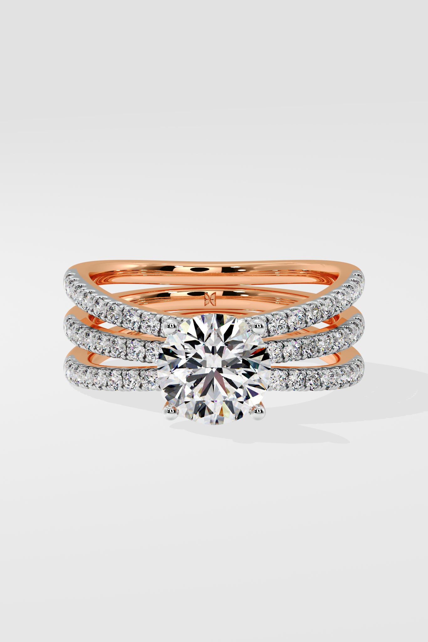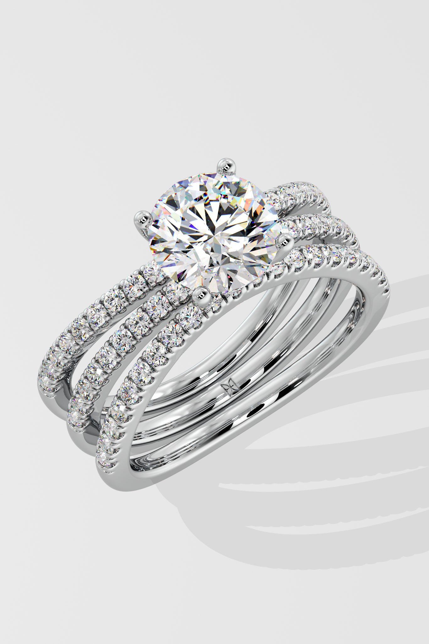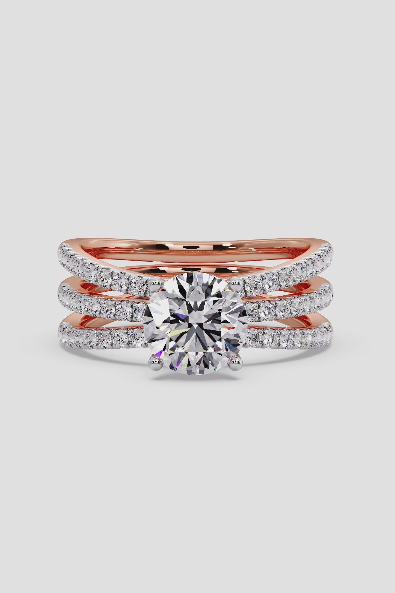 Lab Grown Diamond Triple Band Solitaire Ring featuring a striking 1.5 ct center diamond, set atop three angular, diamond-studded bands. The stacked design adds depth and brilliance, creating a bold yet elegant statement piece.