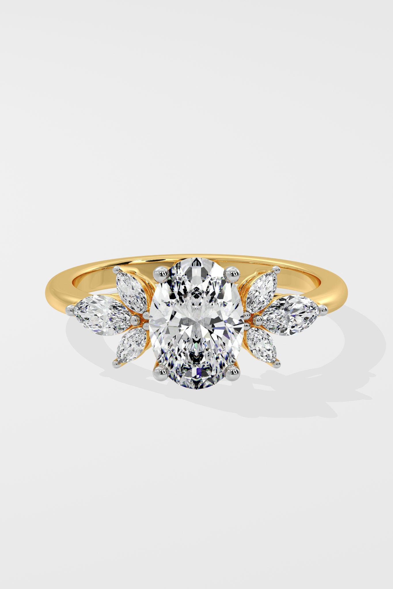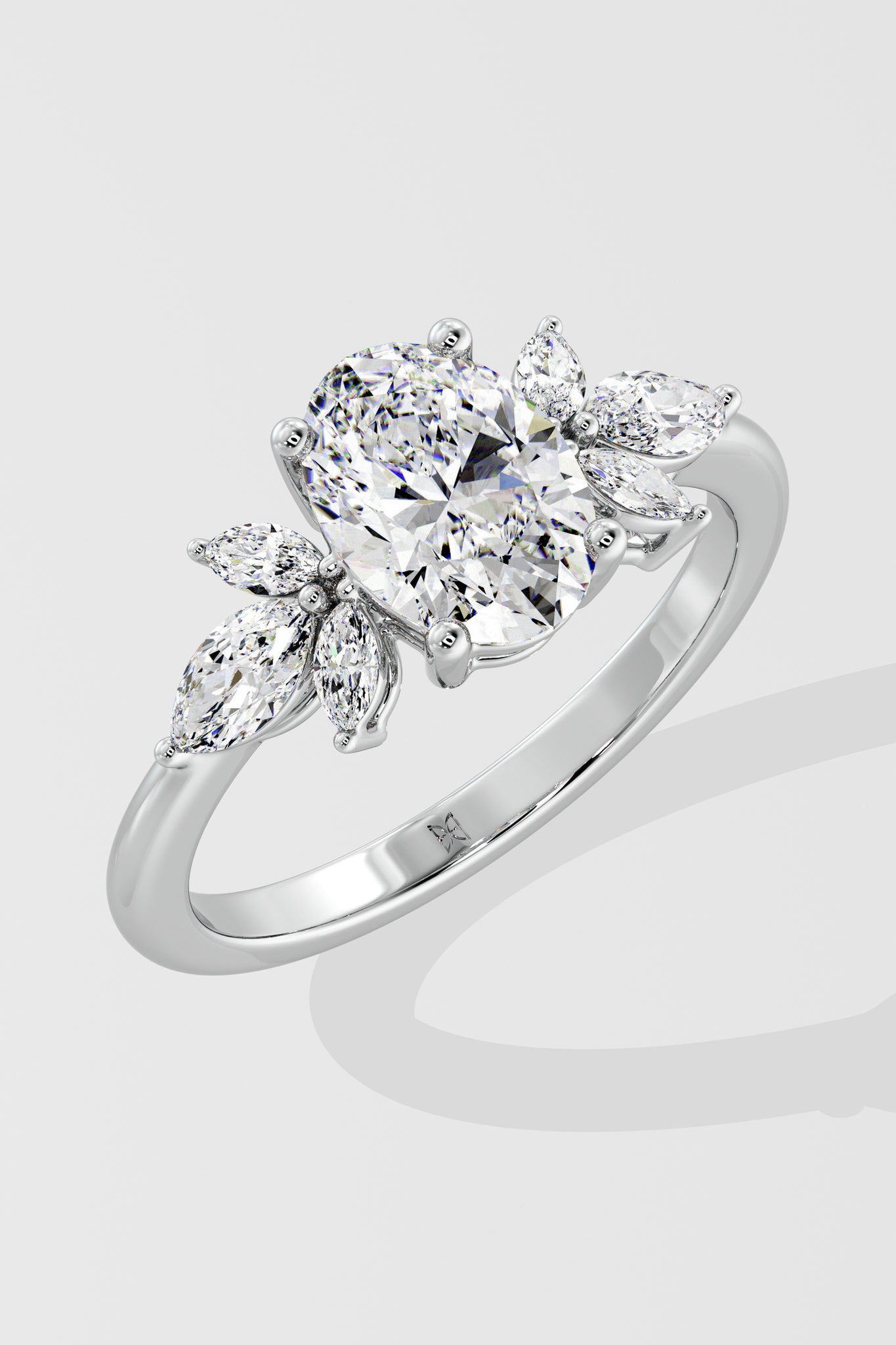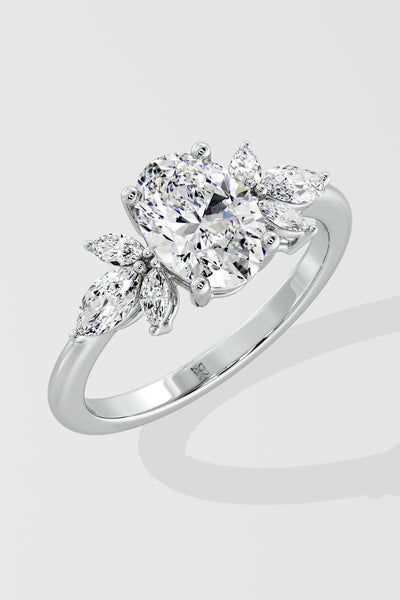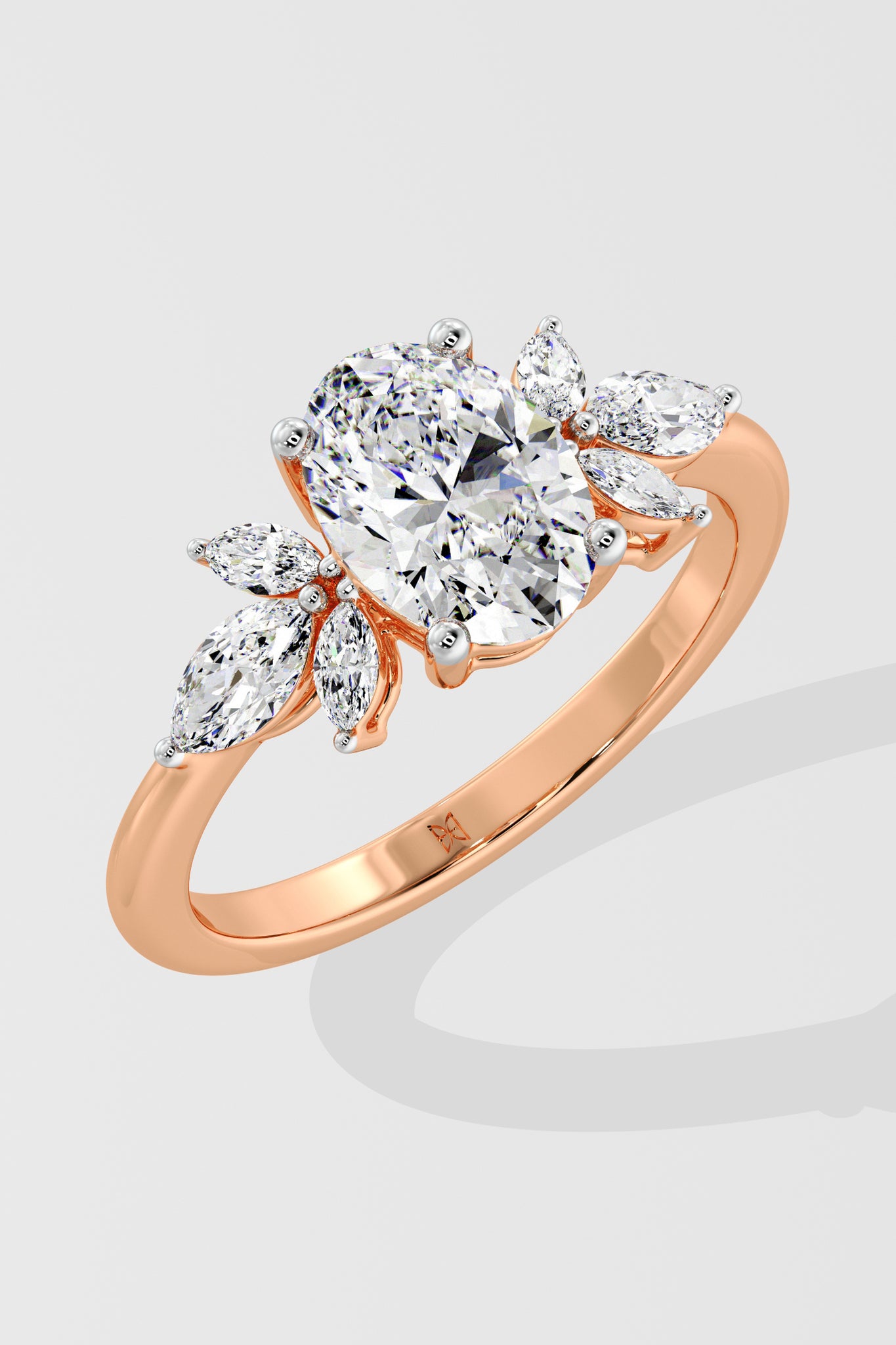 The Freesia 1 ct Oval Ring features a 1 Ct Oval Diamond at the center, flanked by marquise diamonds arranged in a leaf-like design. Set on a band, it brings a nature-inspired structure to a classic shape.