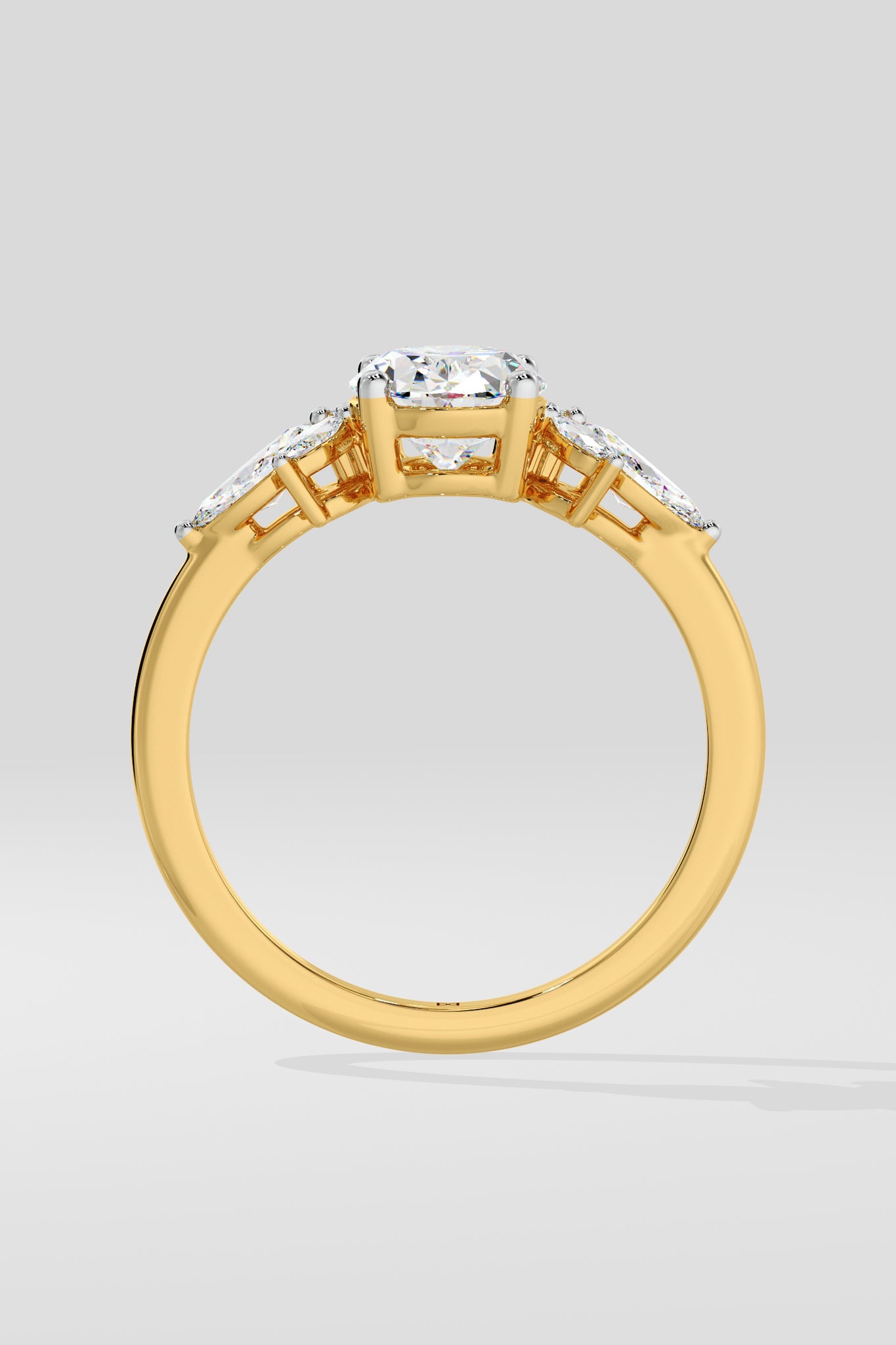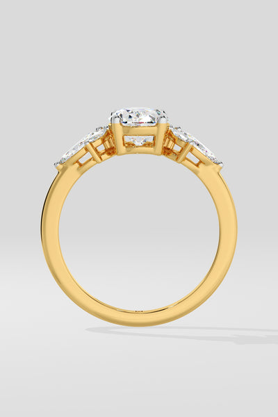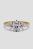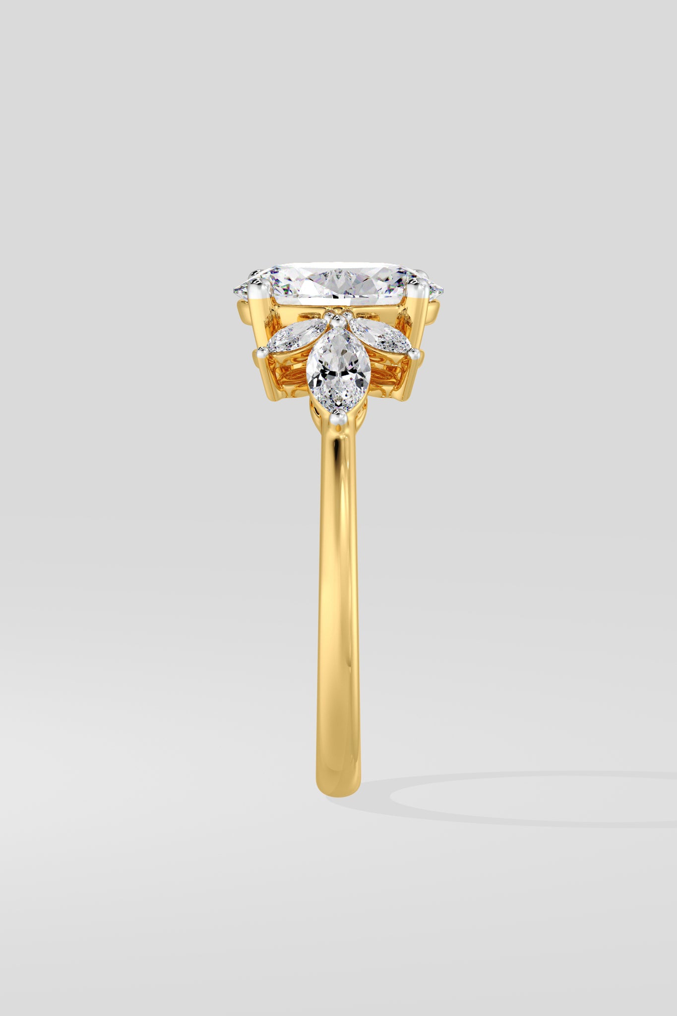 The Freesia 1 ct Oval Ring features a 1 Ct Oval Diamond at the center, flanked by marquise diamonds arranged in a leaf-like design. Set on a band, it brings a nature-inspired structure to a classic shape.