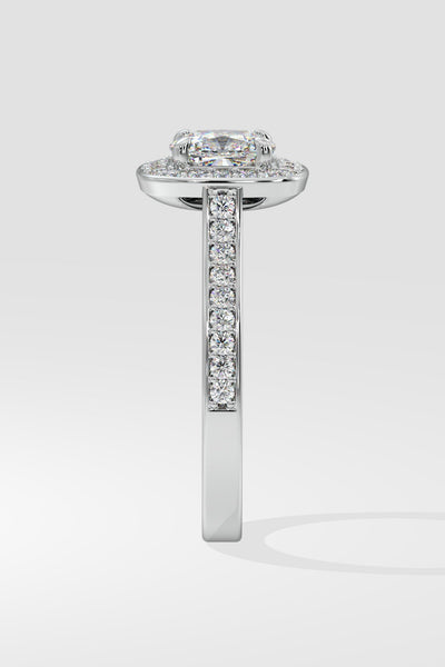 Lab Grown Diamond Cushion Solitaire Ring features a 1 Ct cushion center with a classic halo. The cushion is a modern diamond shape which is rectangular with rounded edges, gaining immense popularity and truly new age.