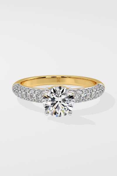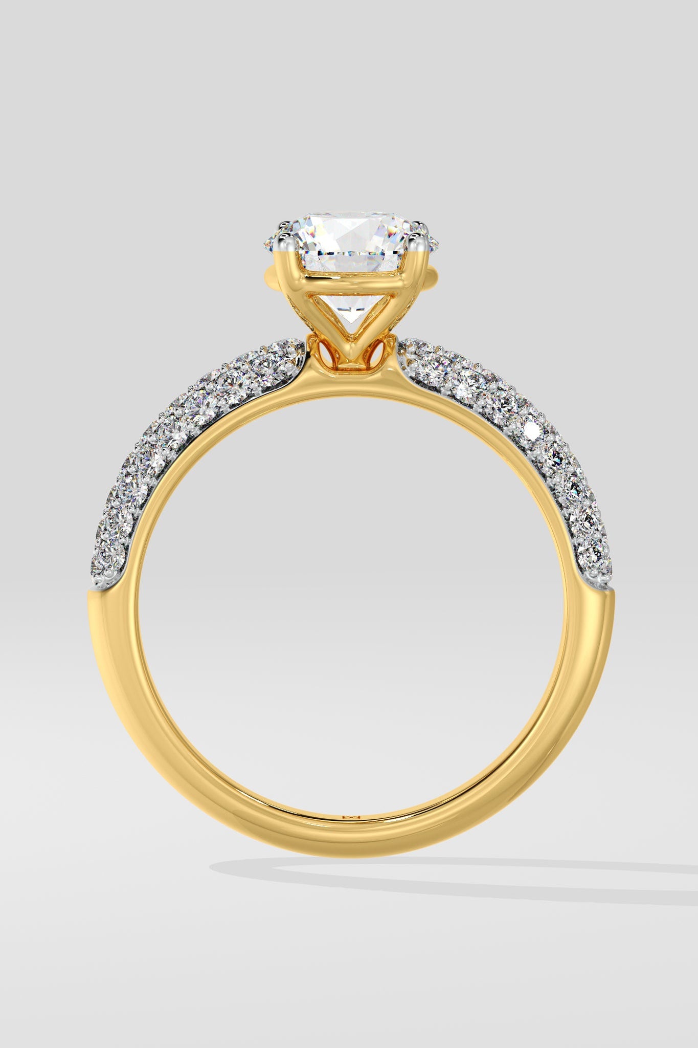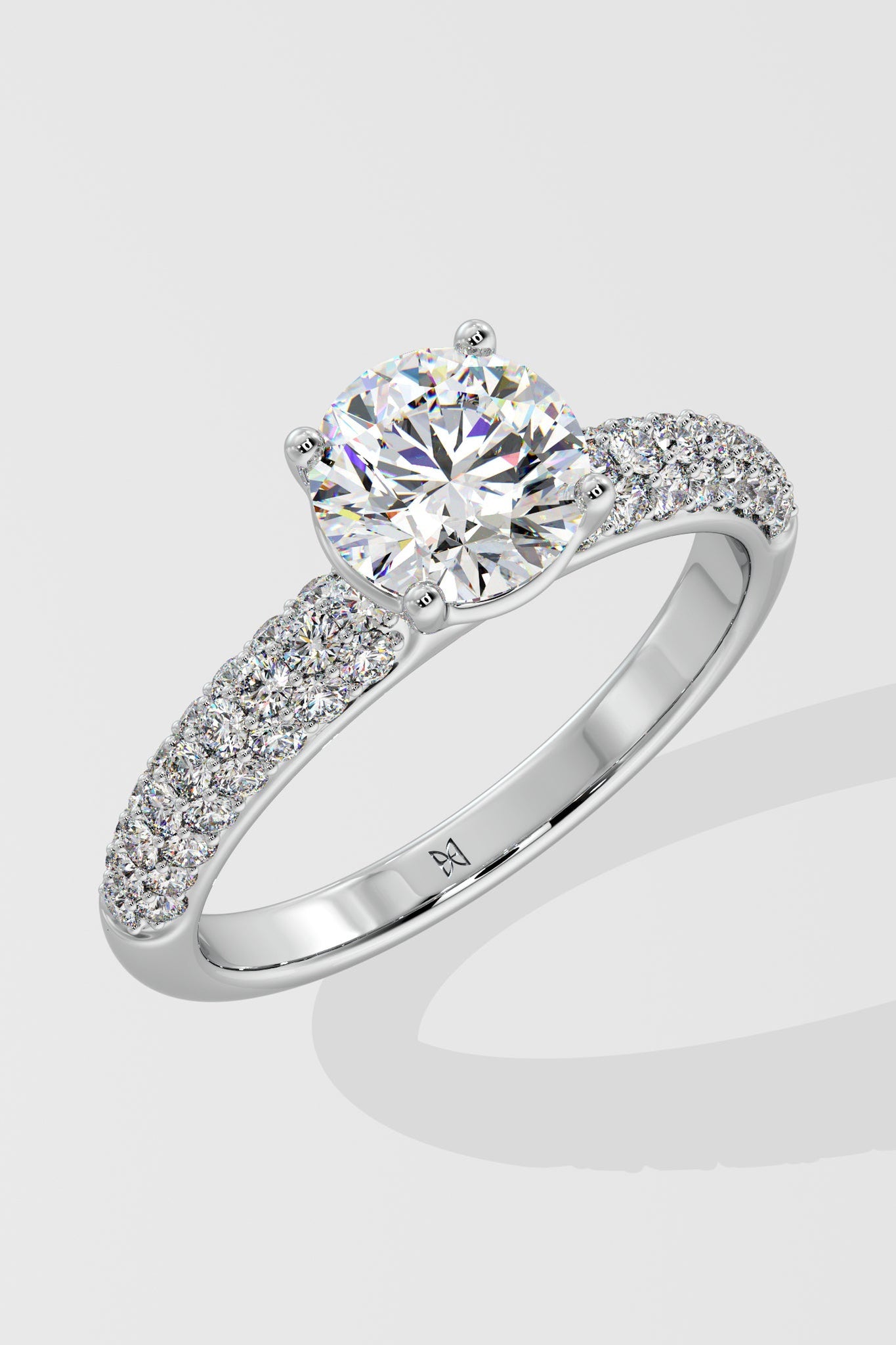 The Lab Grown Diamond all time classic and favourite Pave Solitaire Ring features a brilliant 1 Ct round center diamond and a shimmering 3-row channel setting along the shank. Designed for comfort and style, this ring holds undeniable charm and sparkle.