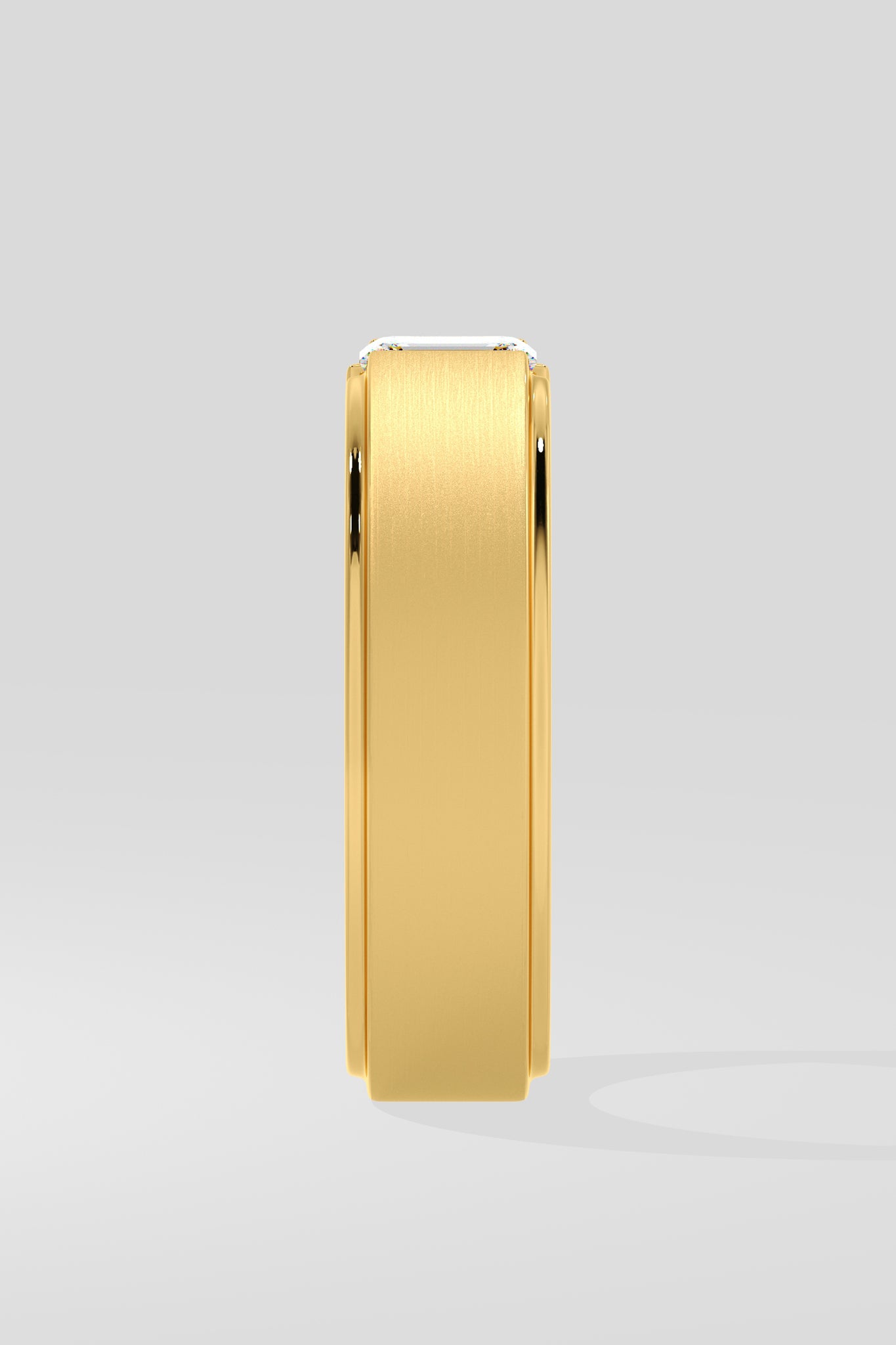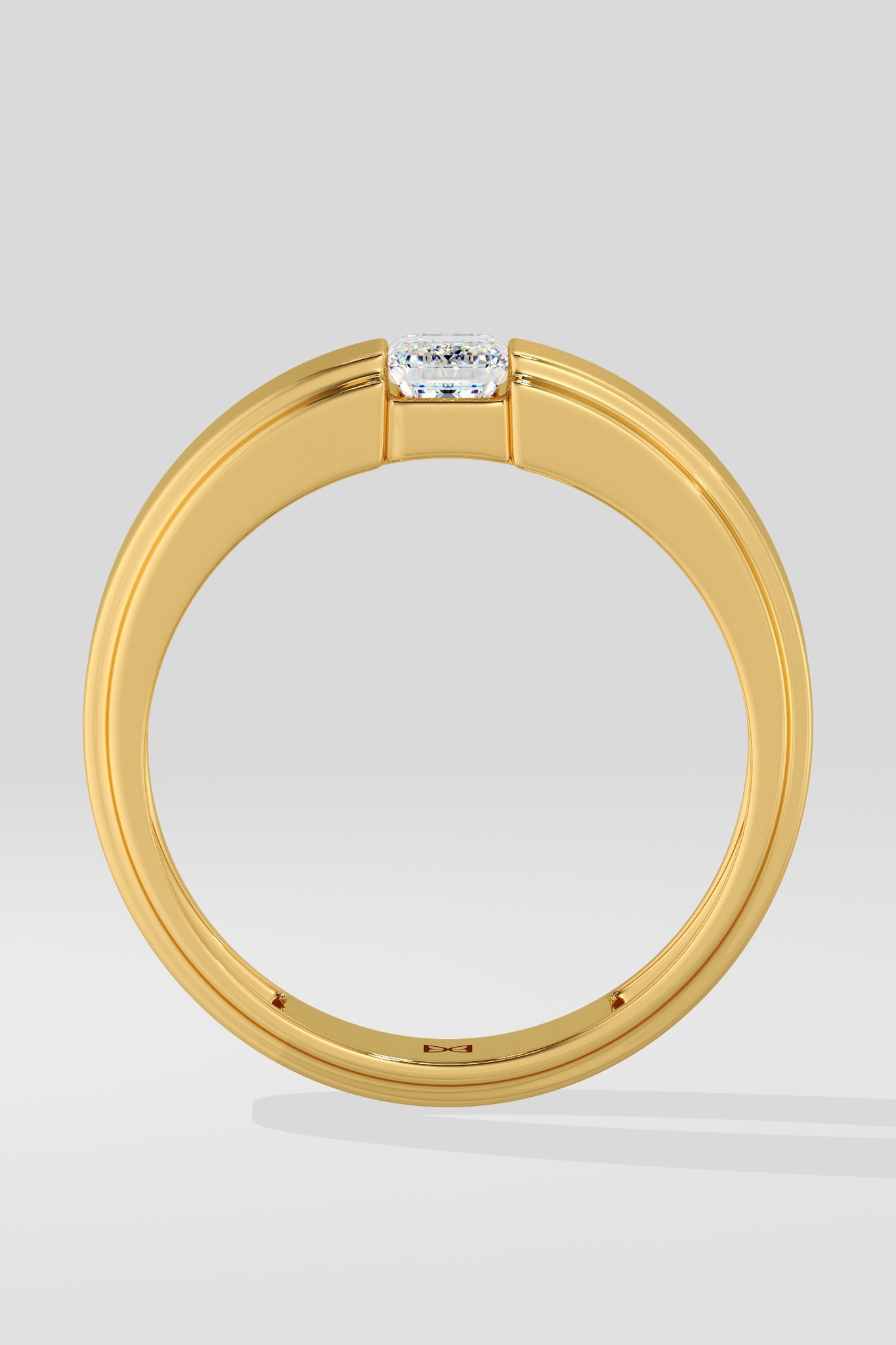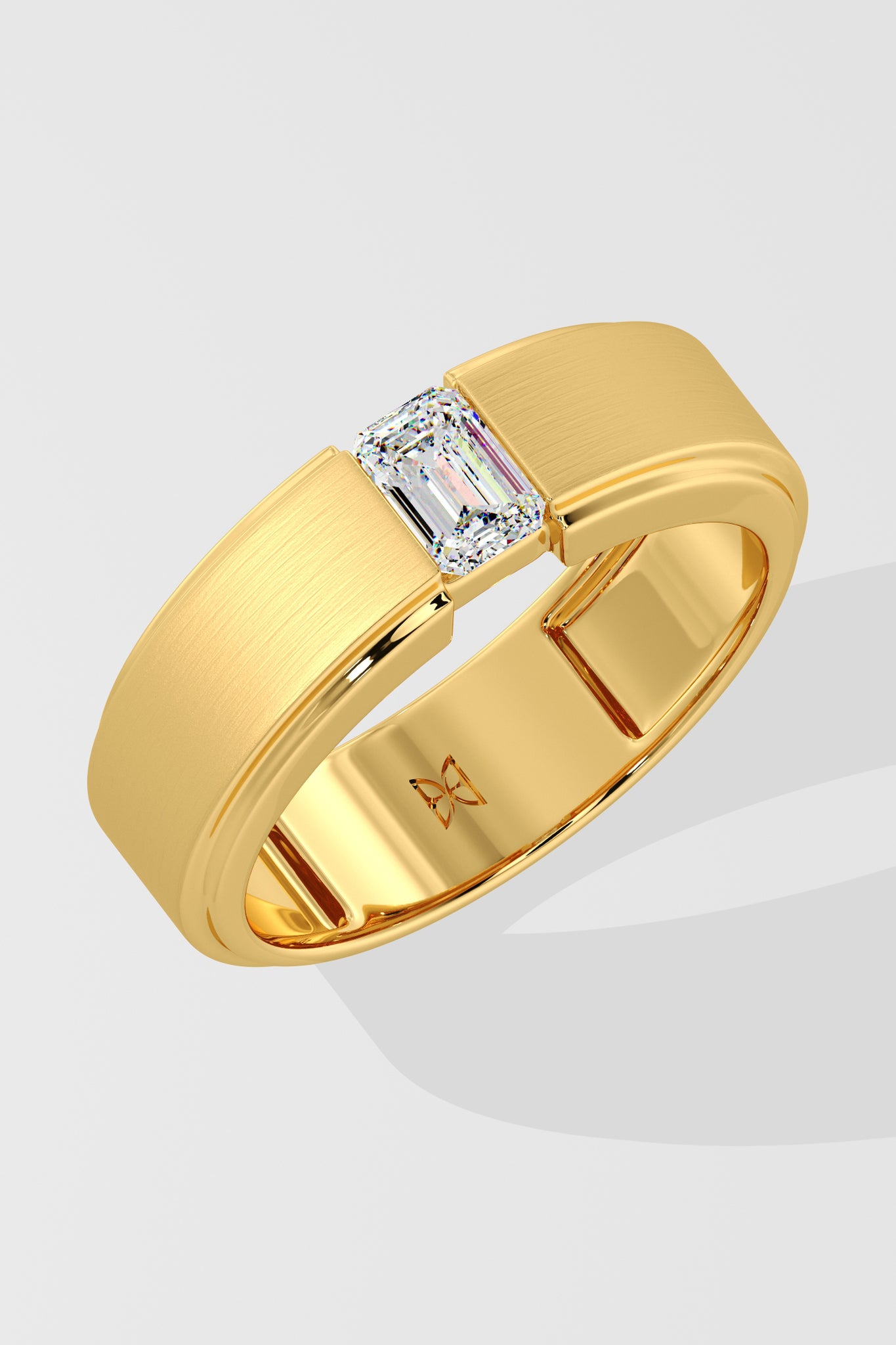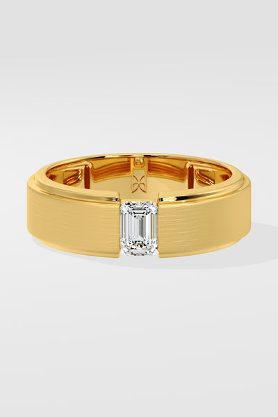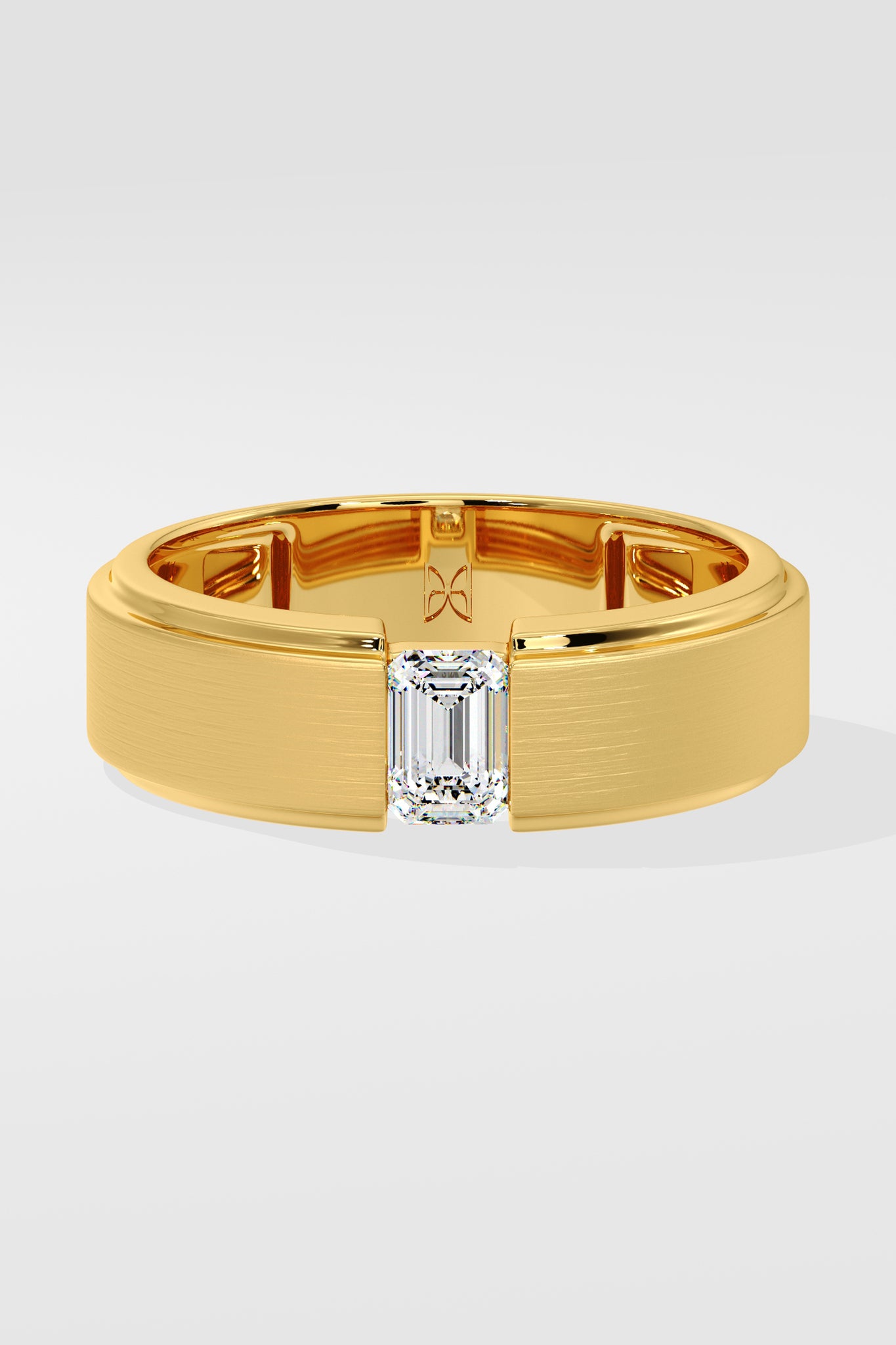 The Emra Ring features a 1 Ct Emerald set vertically on a bold gold band. Its classic design stands the test of time. Elegant, comfortable, and perfect for any occasion.