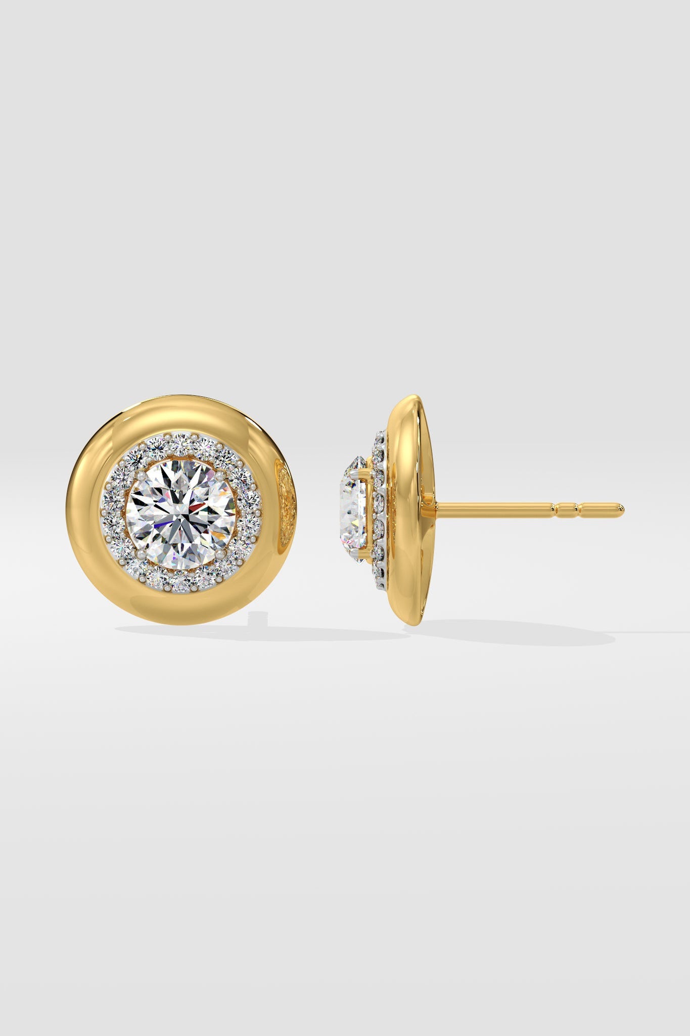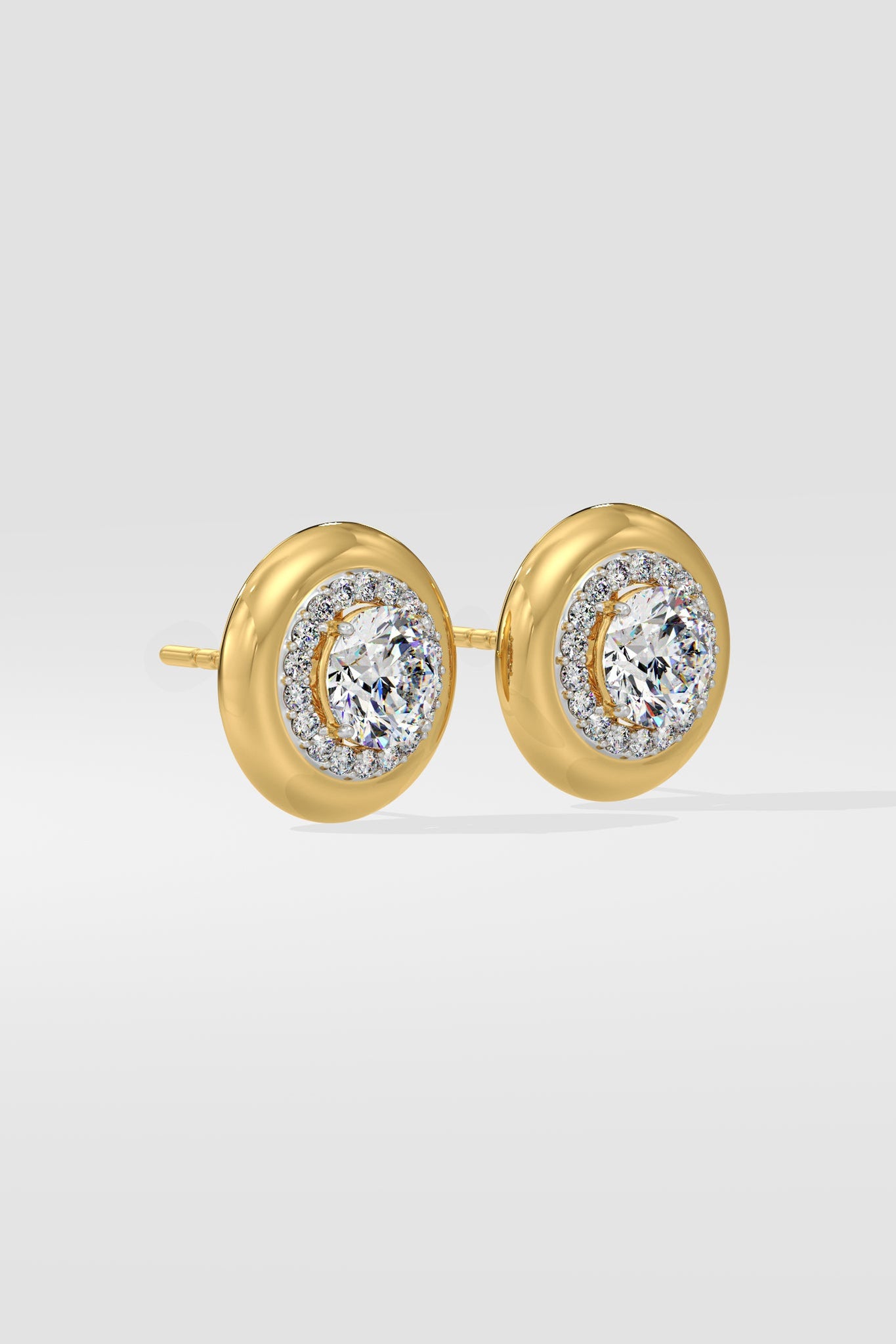 The Gold Rim Studs feature 0.50 ct each centers with the classic minimal halo. The highlight however is the fine gold rim which contrasts the center brilliance, giving you the perfect combination of a diamond & gold everyday stud. Delicately crafted and effortlessly wearable for everyday or any occasion; and perfect for gifting.