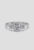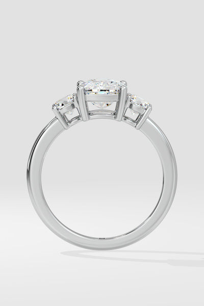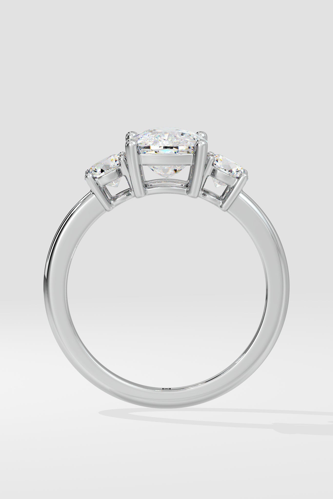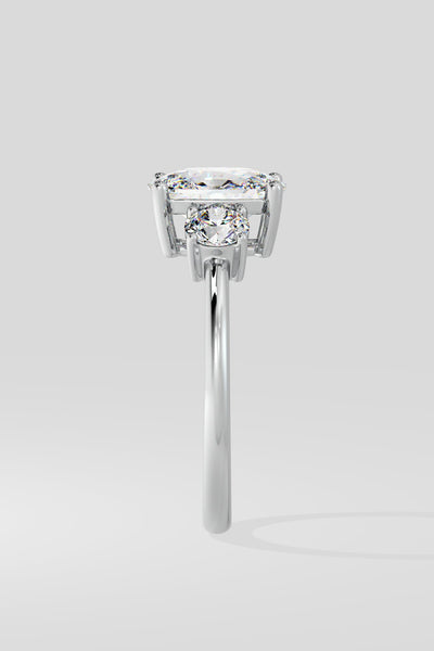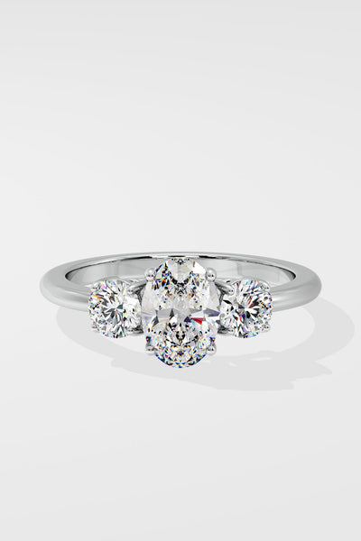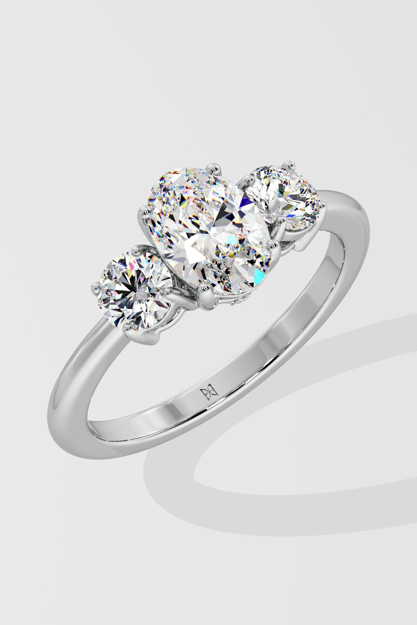 This elegant 1 Ct Oval trio Ring features a stunning 0.30 Ct Round Diamond on each side of the center stone, creating a harmonious blend of two distinct shapes. Its simple yet unique design adds a modern twist to a classic look, perfect for timeless elegance.