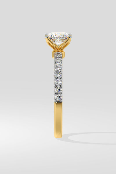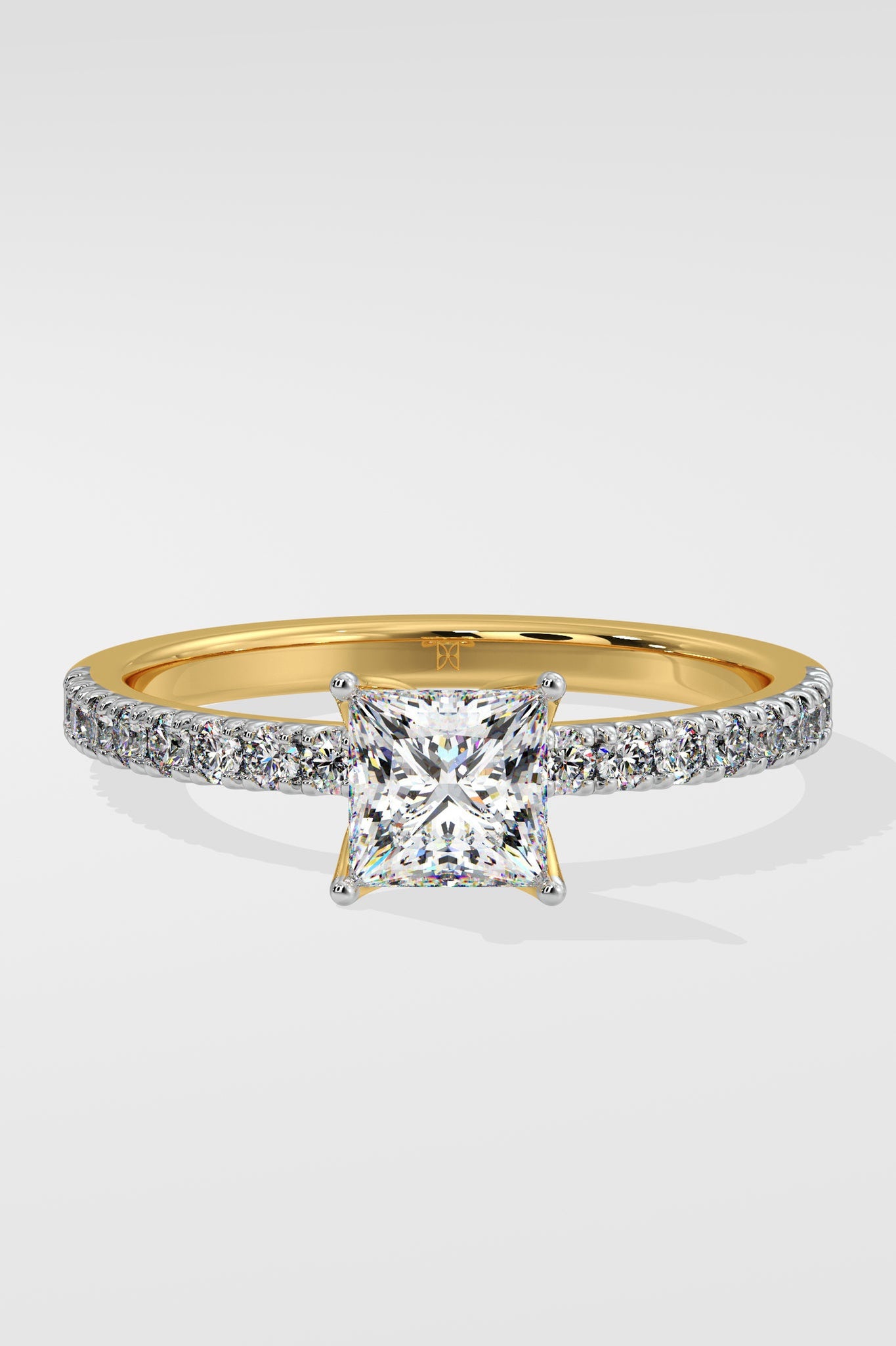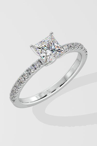 The Princess Solitaire Ring features a 1 ct brilliant diamond on a classic studded shank. Known for its symmetry and brilliance, it's the second most popular diamond shape.