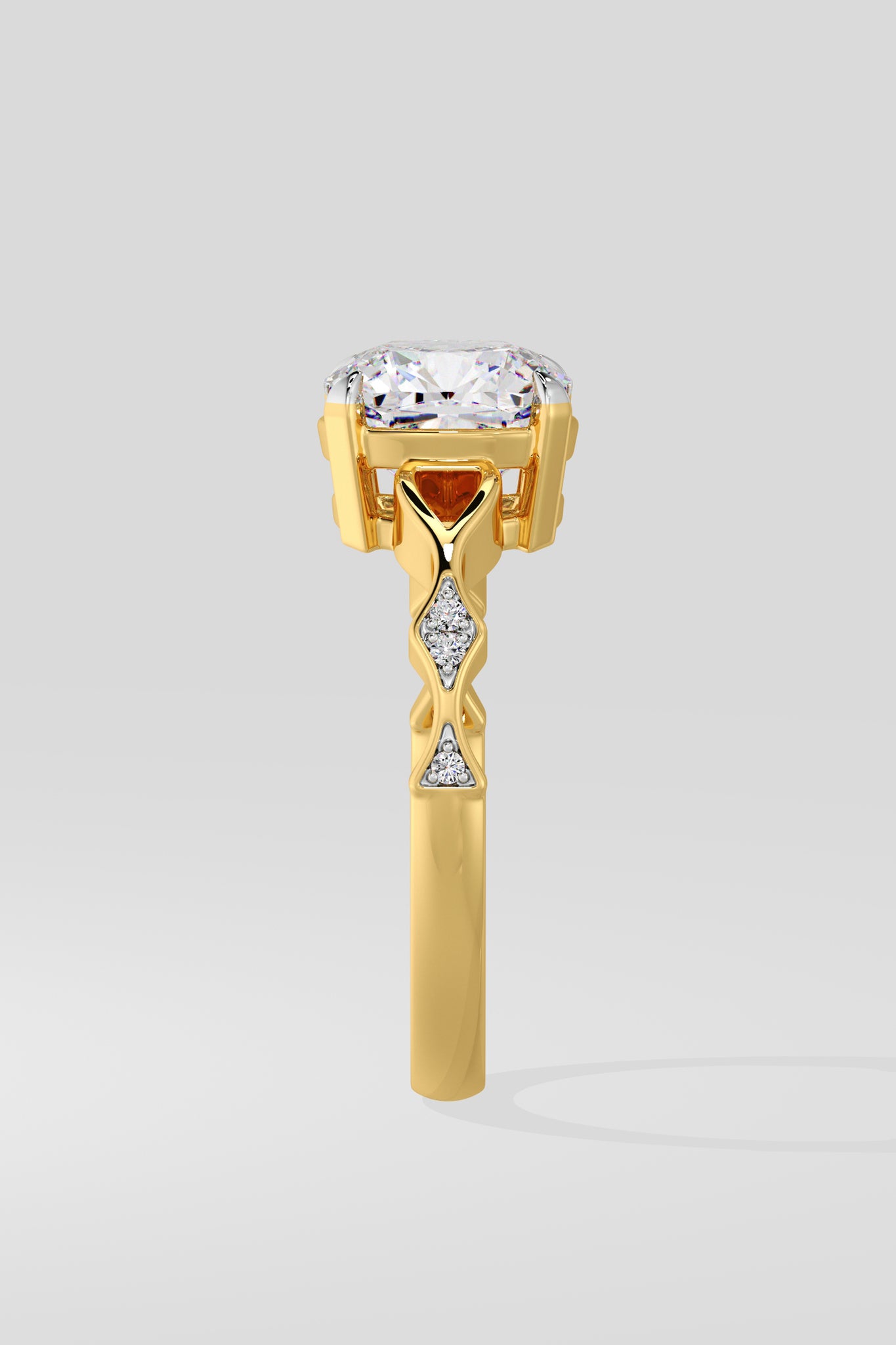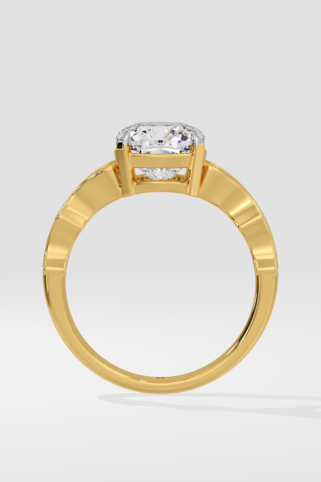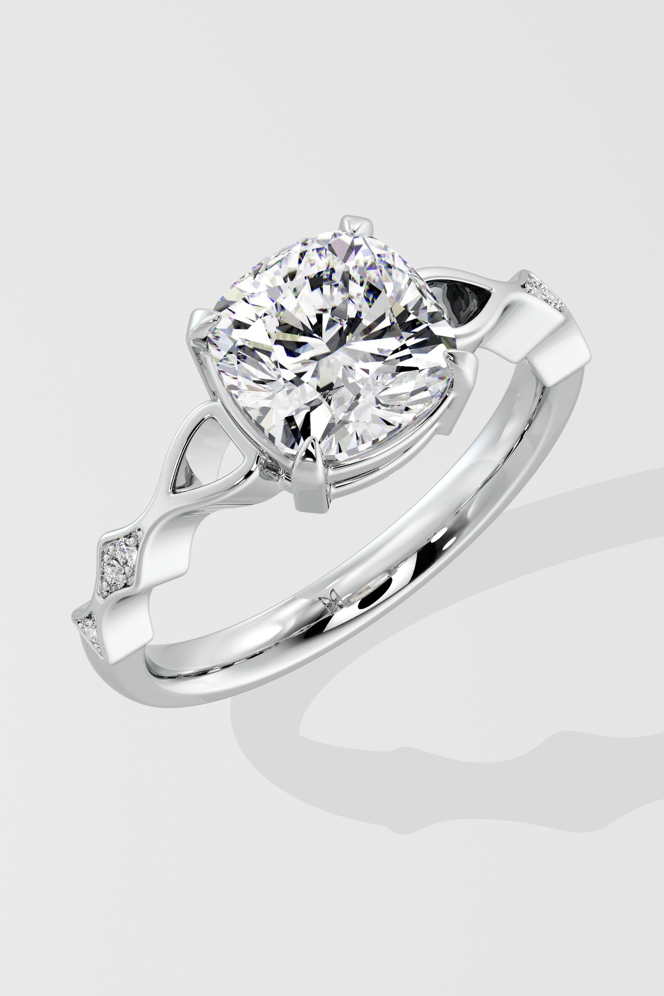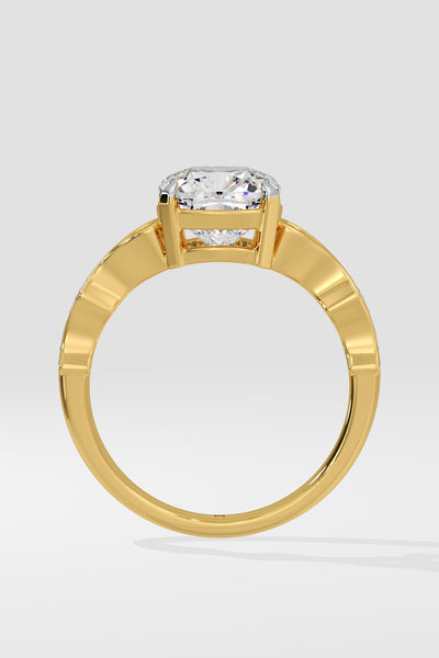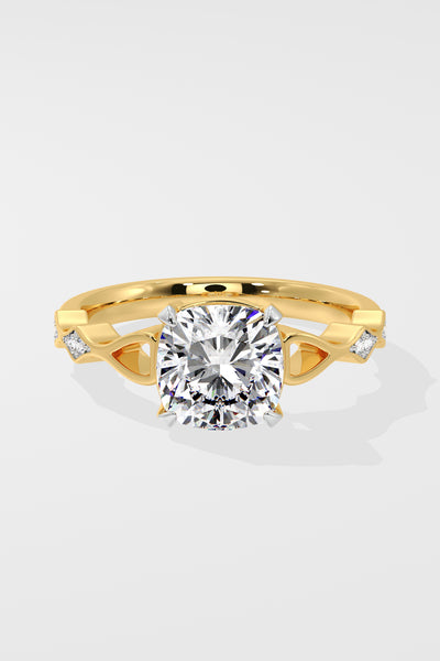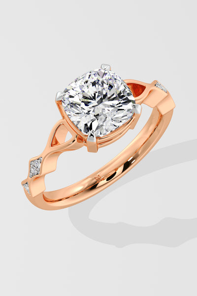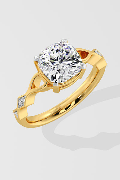 The Contour Ring features a 2.50 Ct Cushion-cut center Diamond set on a delicate twisted shank. A single small diamond on each side adds a subtle touch of sparkle.