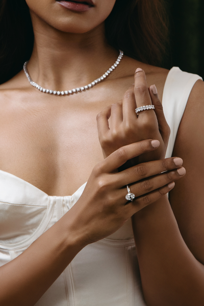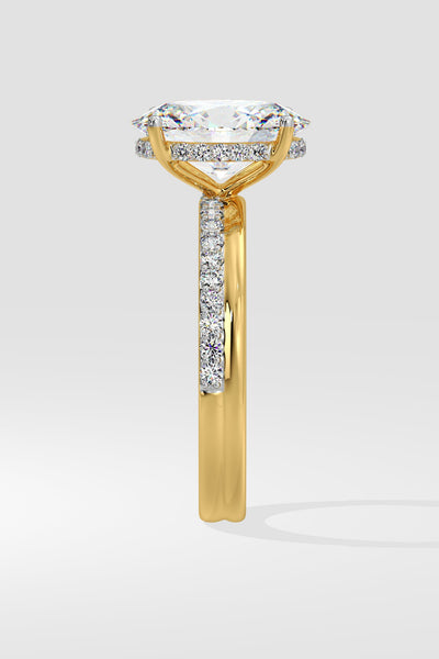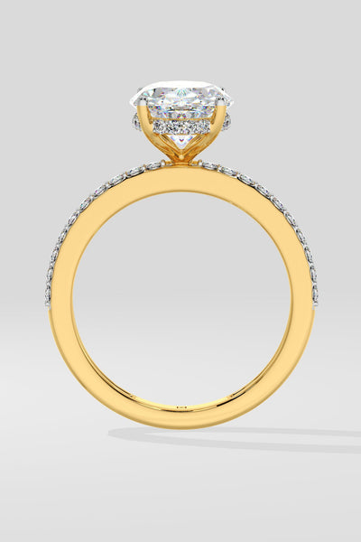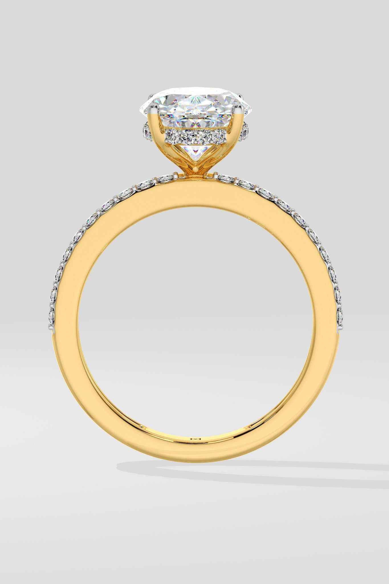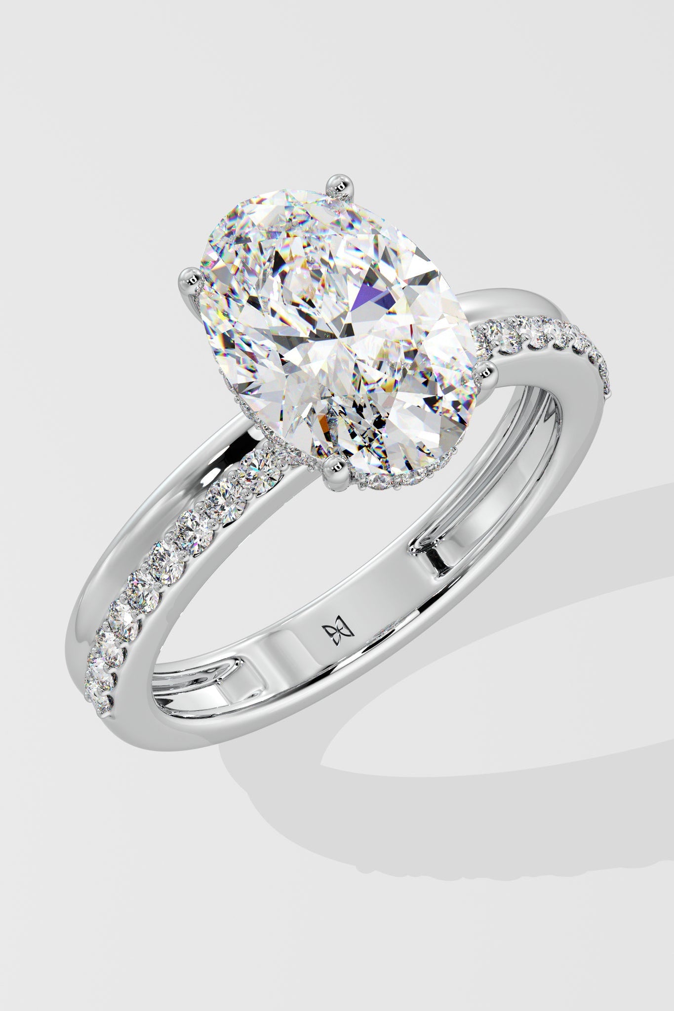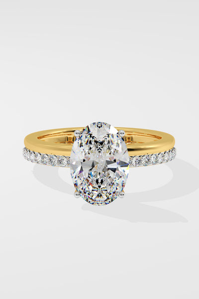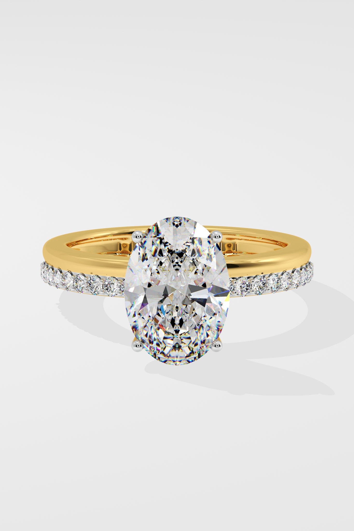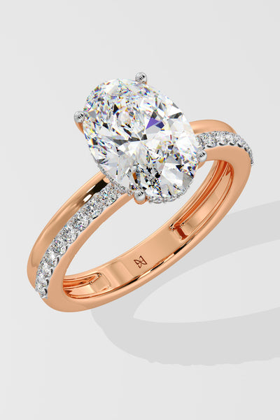 The Double Band Ring features a 2.5 Ct center Oval embraced by a broader two-row band, one in classic gold and the other adorned with diamonds. The combined look of an engagement ring and wedding band makes this stunner irresistible.